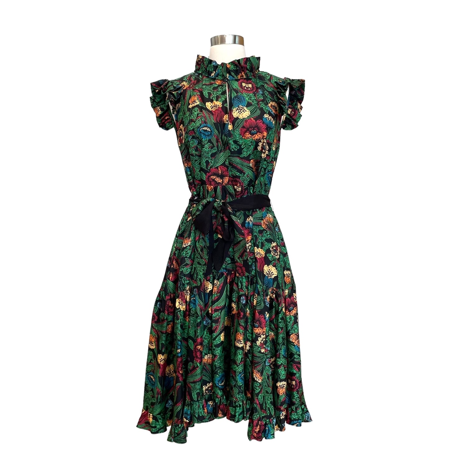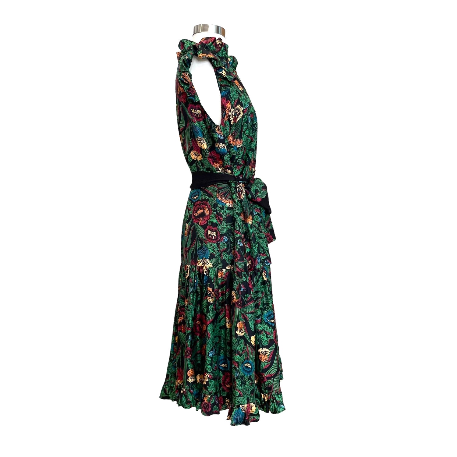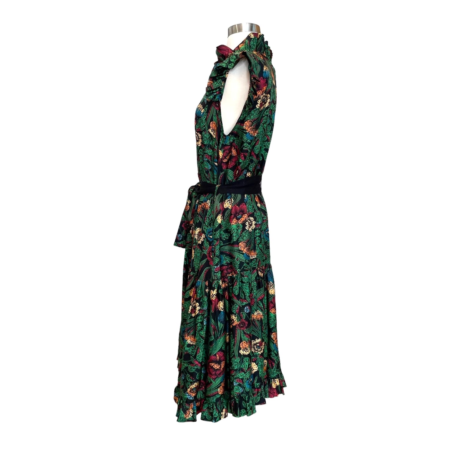 La Double J green floral dress. Ruffle details at shoulders. Belted at waist. Designer size medium.