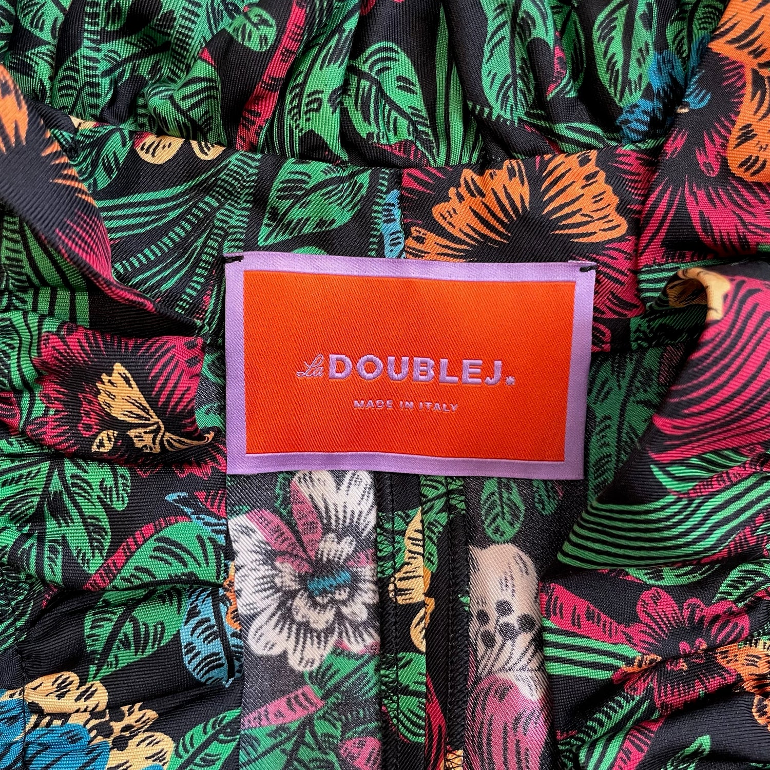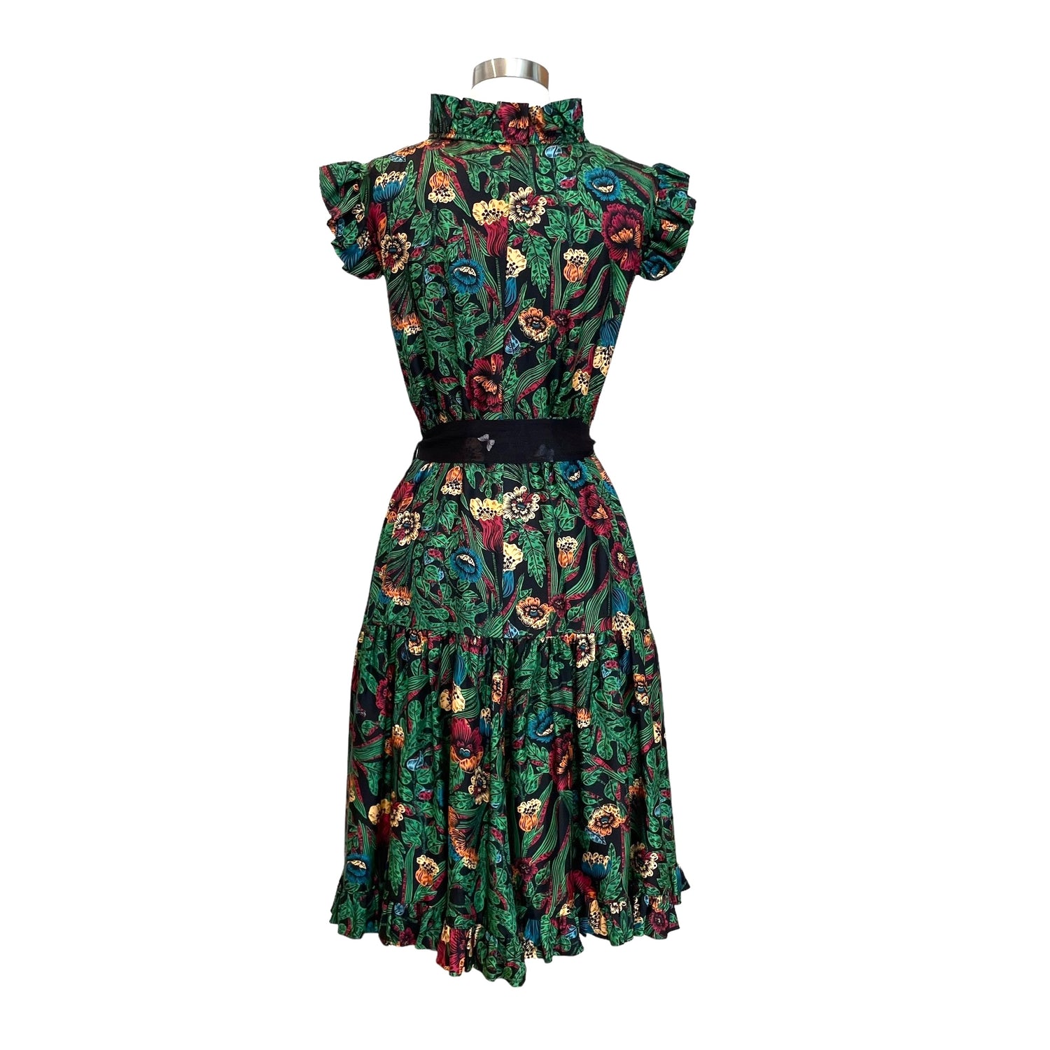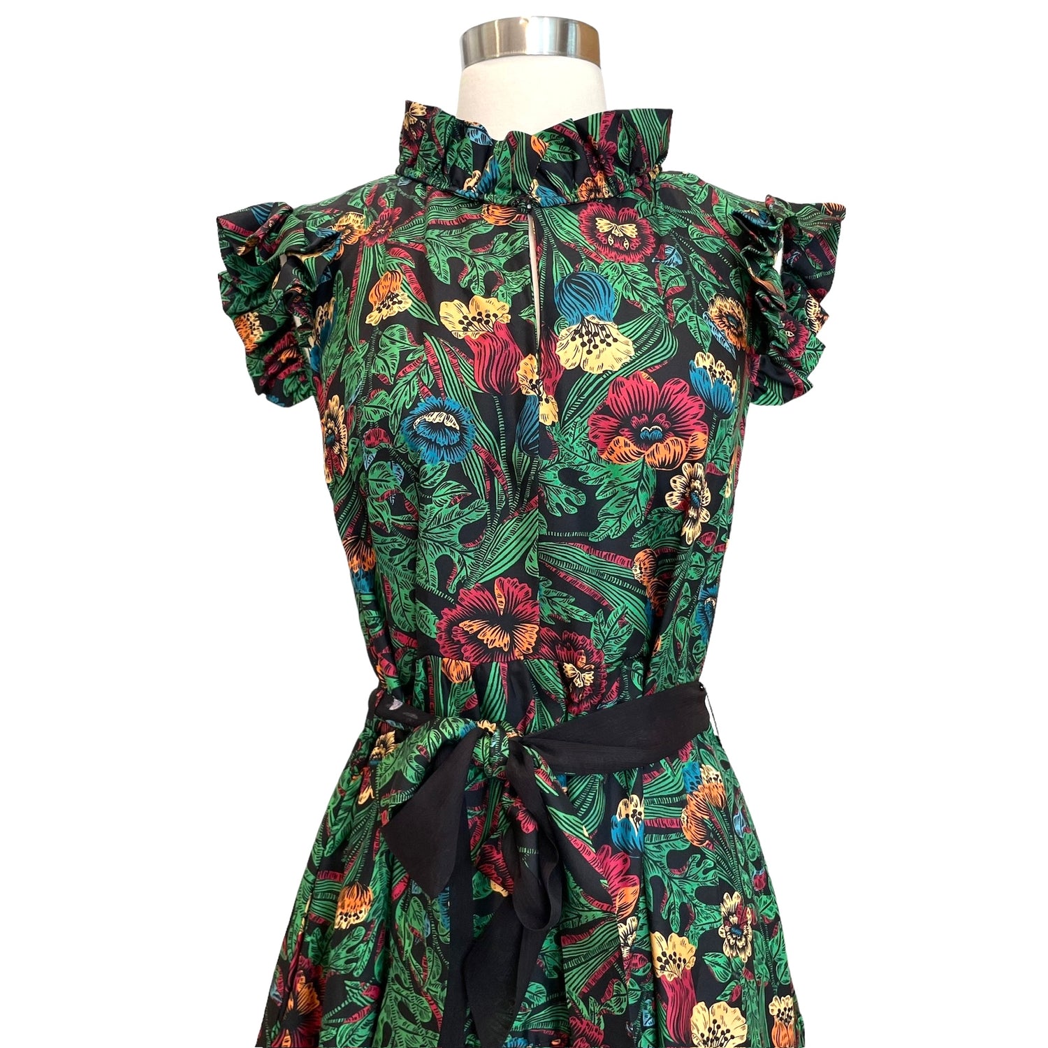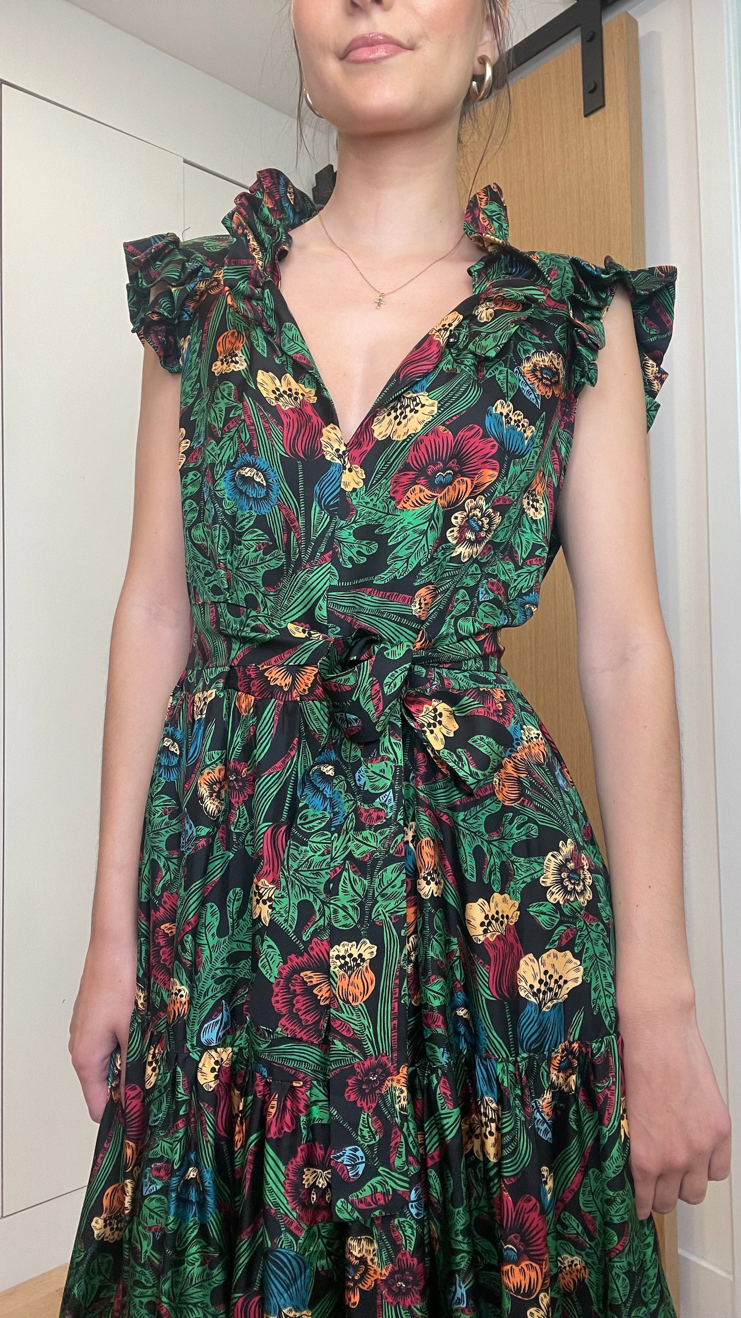 La Double J green floral dress. Ruffle details at shoulders. Belted at waist. Designer size medium.