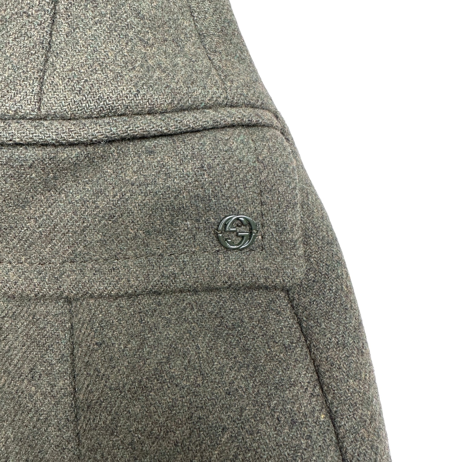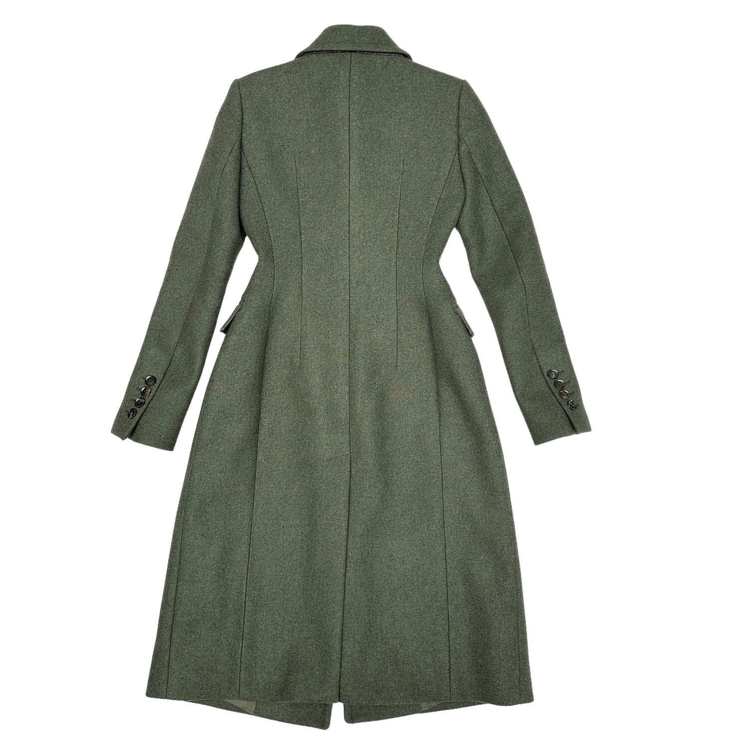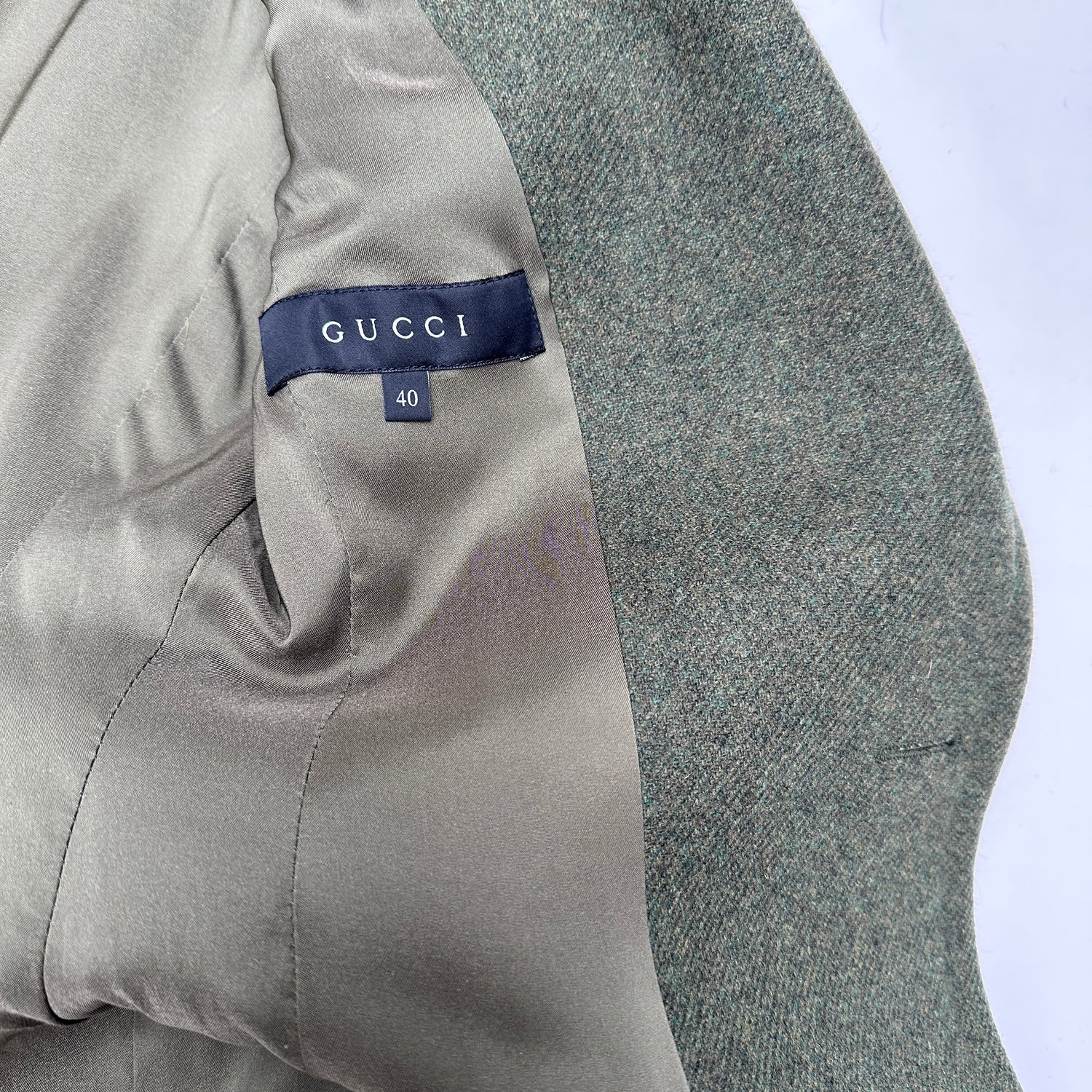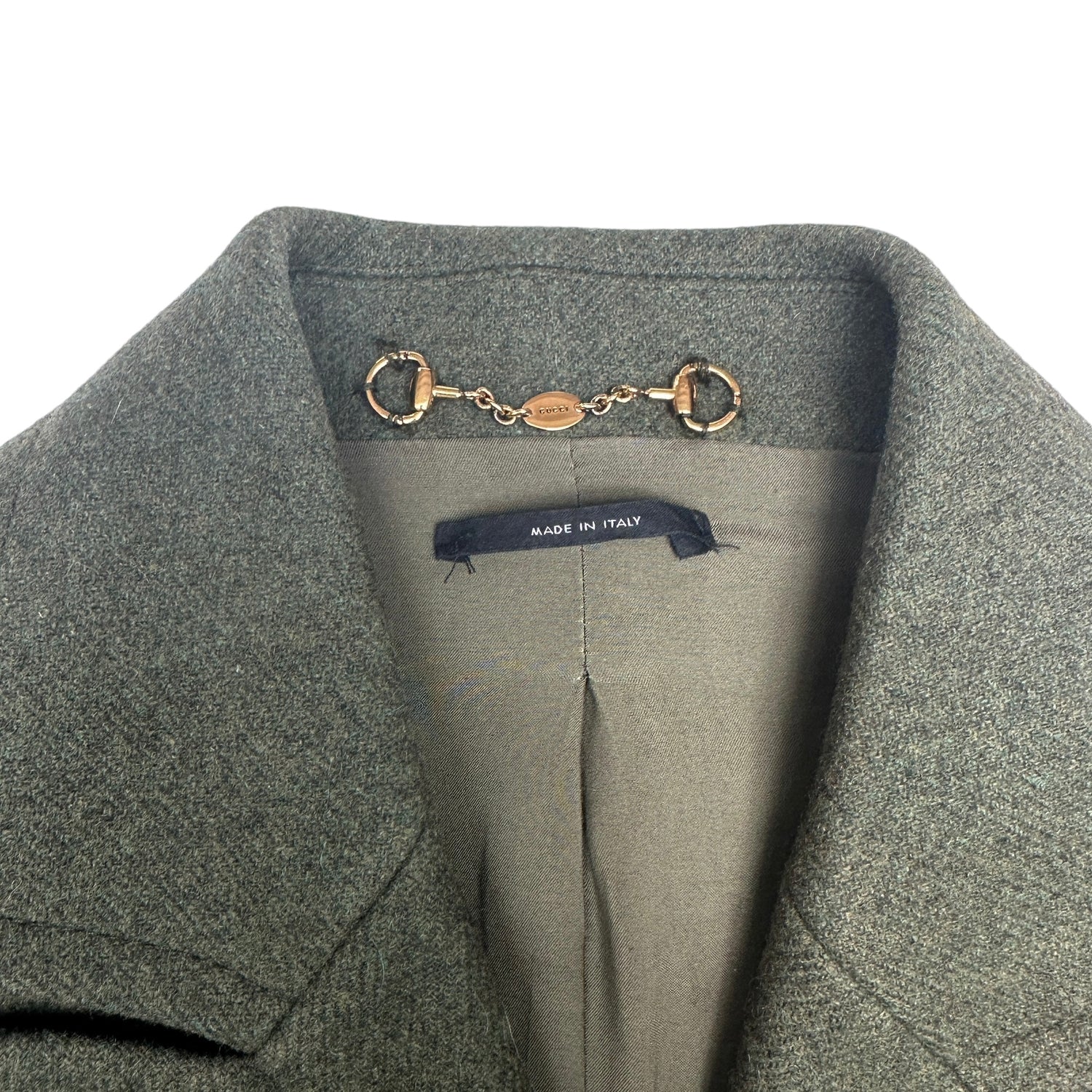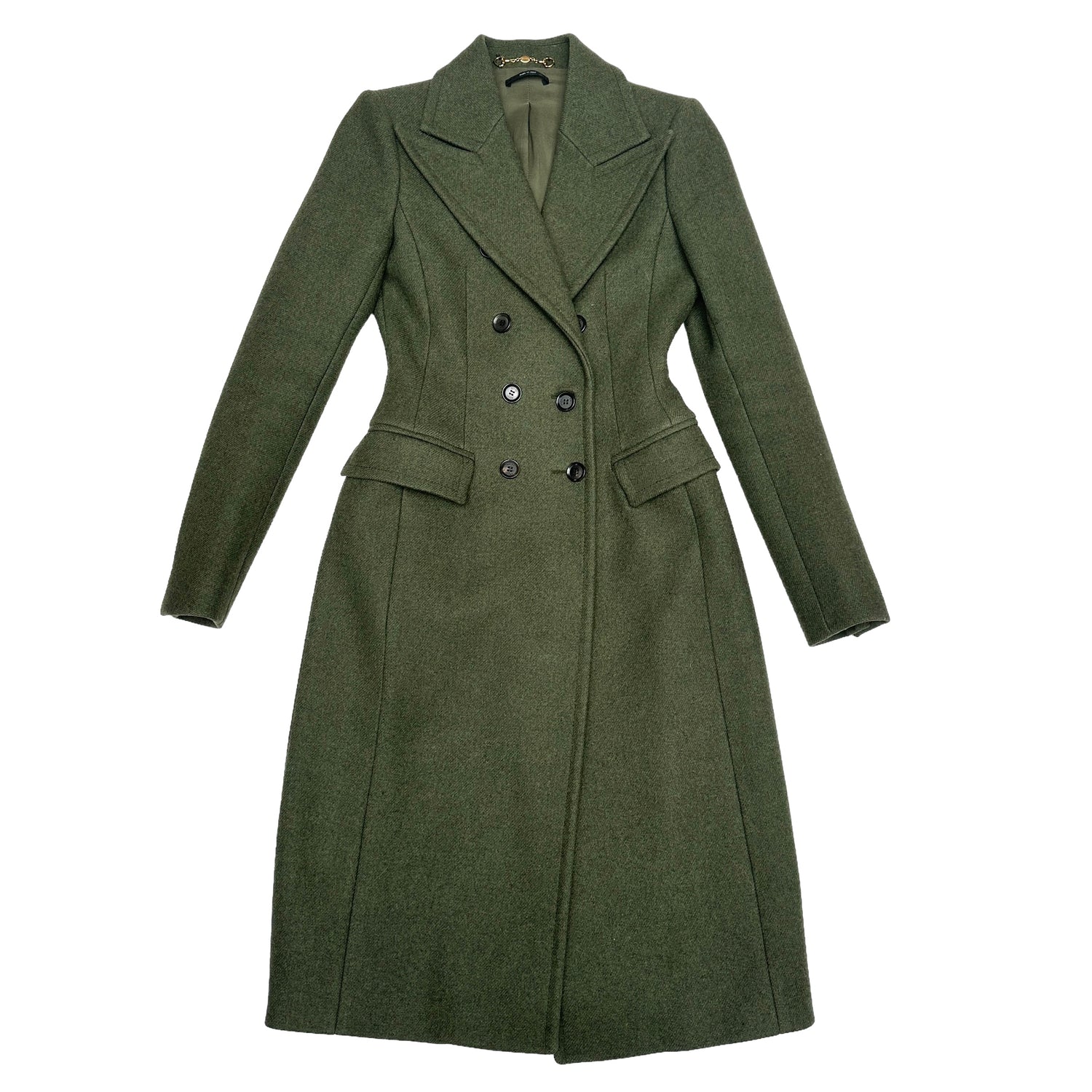 Gucci green wool trench coat. Pointed collar. Button closure at front. Two pockets. Silk lining. GG logo at pocket. Designer size 40.