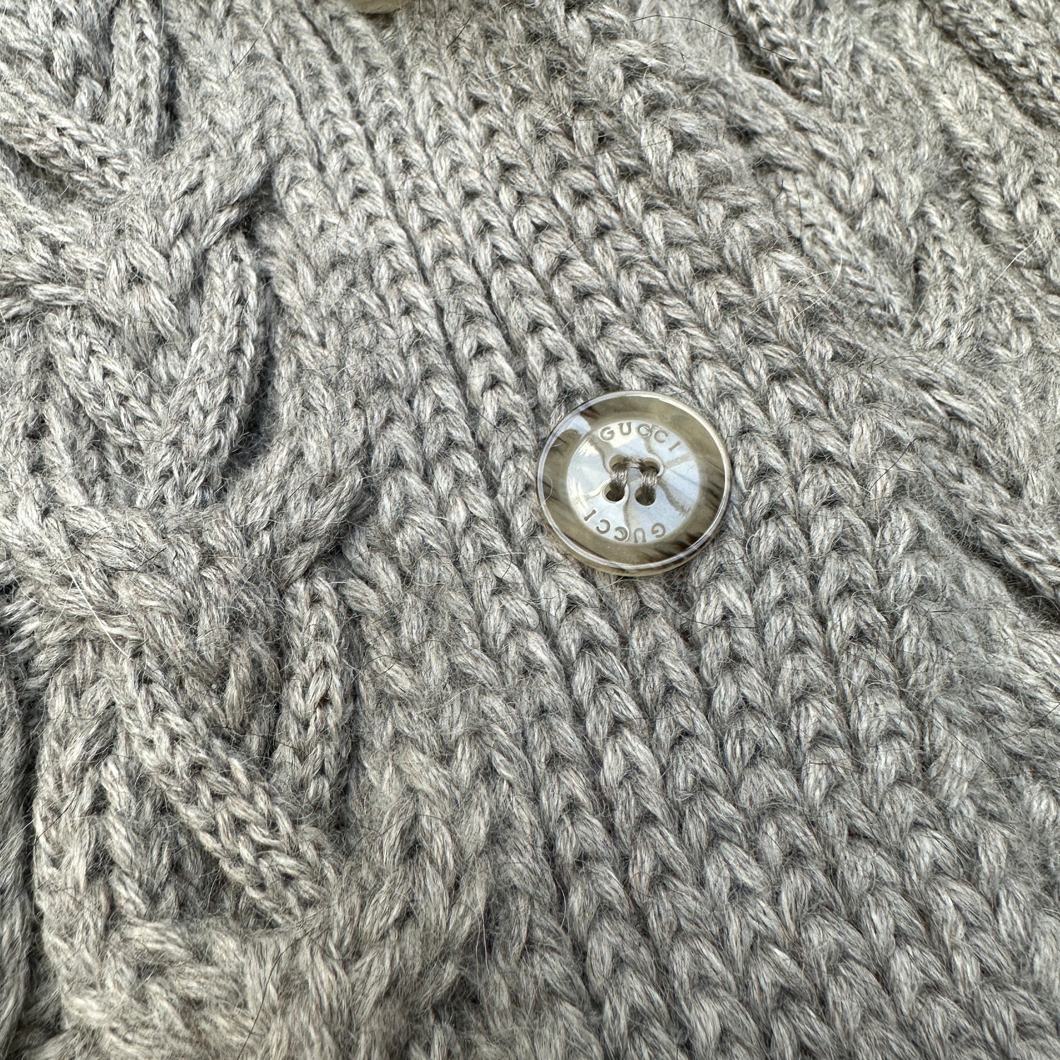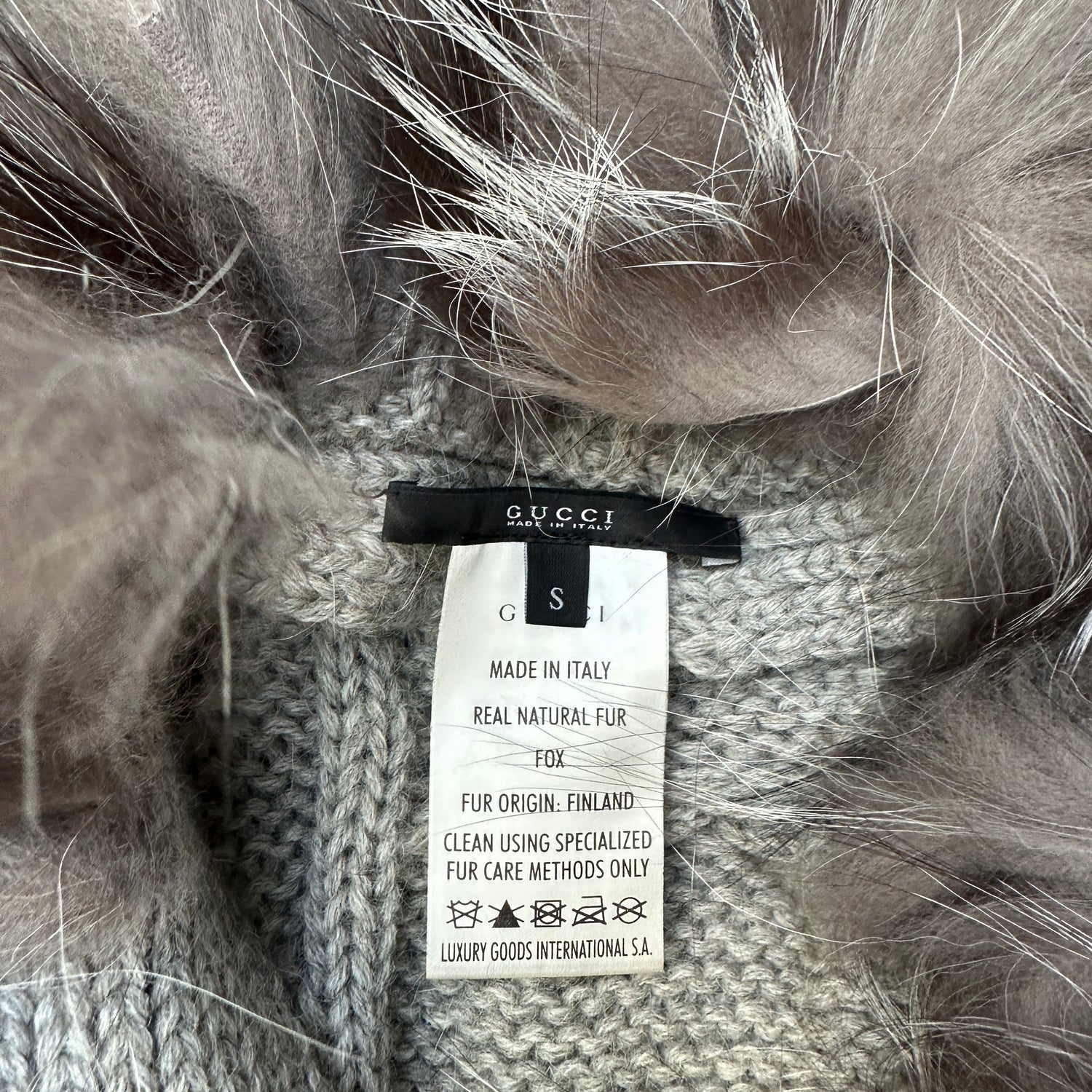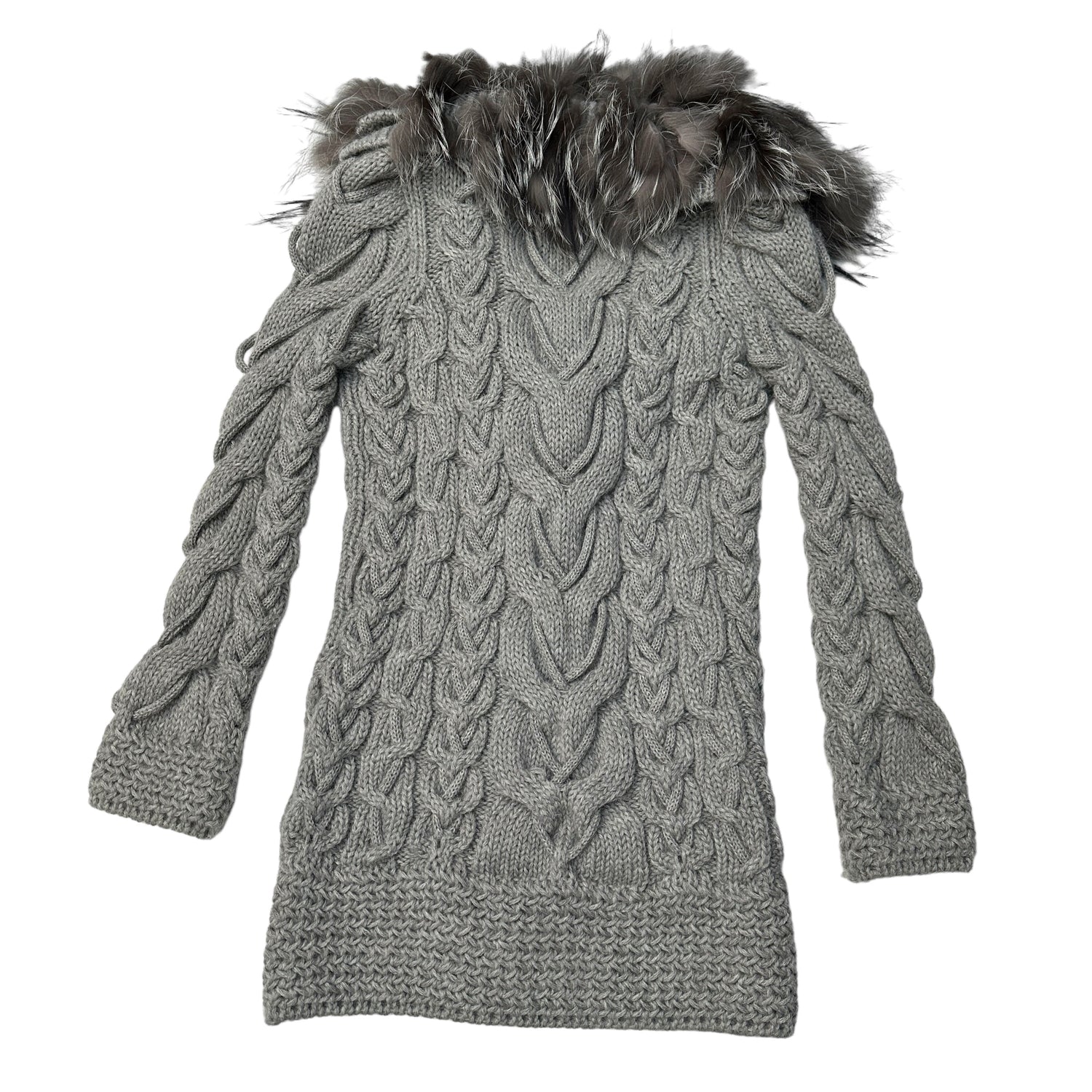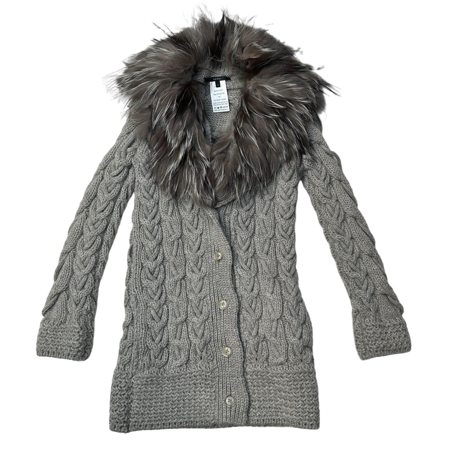 Gucci chunky knits cardigan. Grey wool and alpaca. Fur around neckline. Two slit pockets. Button down at front. Designer size small.
