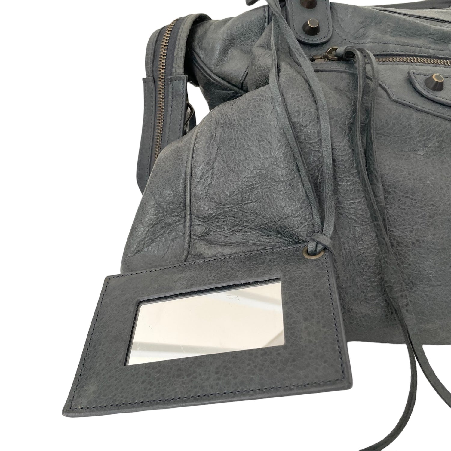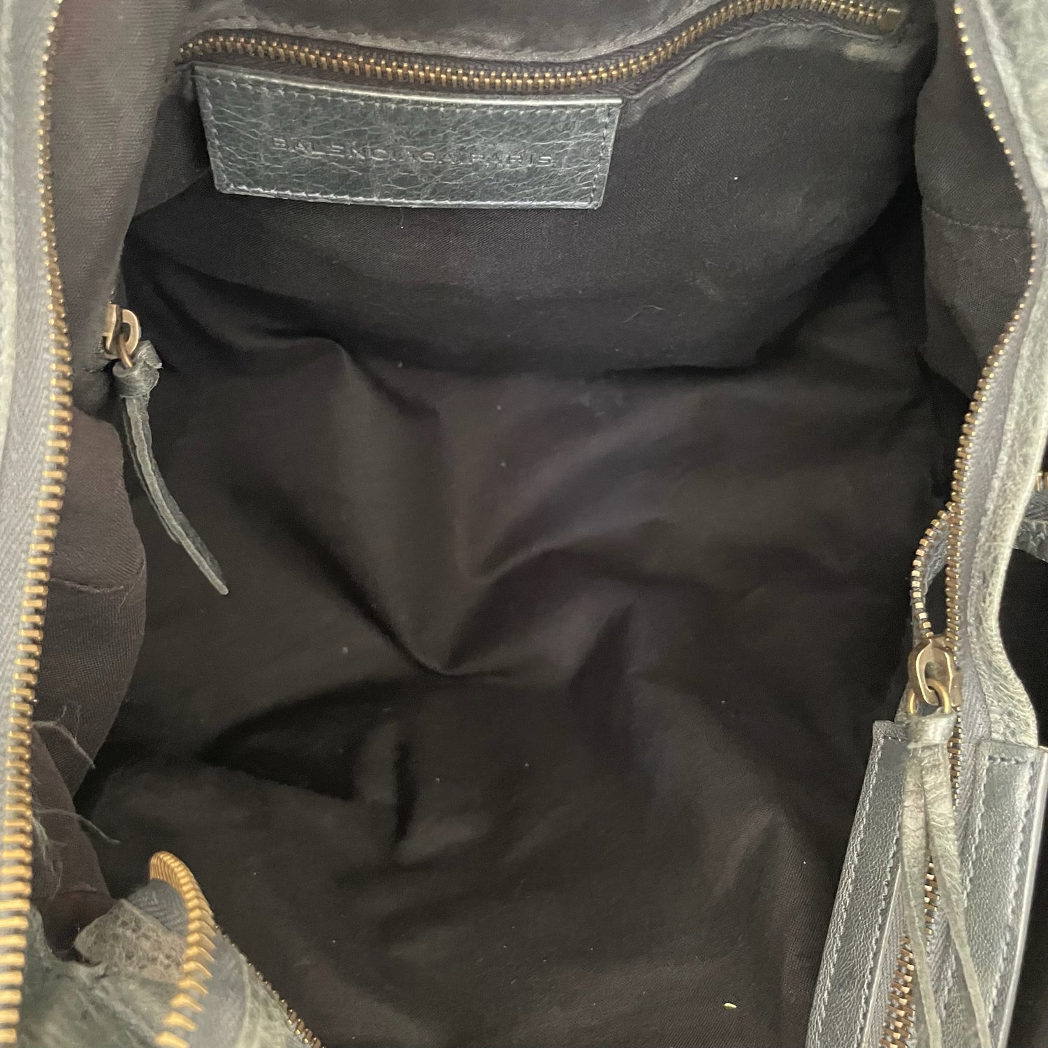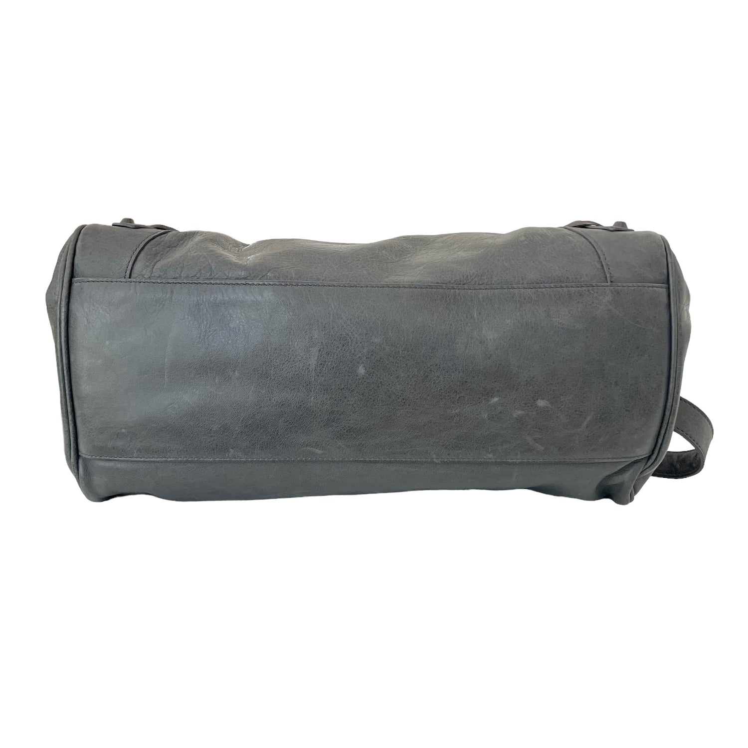 Balenciaga city bag. Grey leather. Black cotton lining. Zipper closure at top. Zipper pocket at interior.
