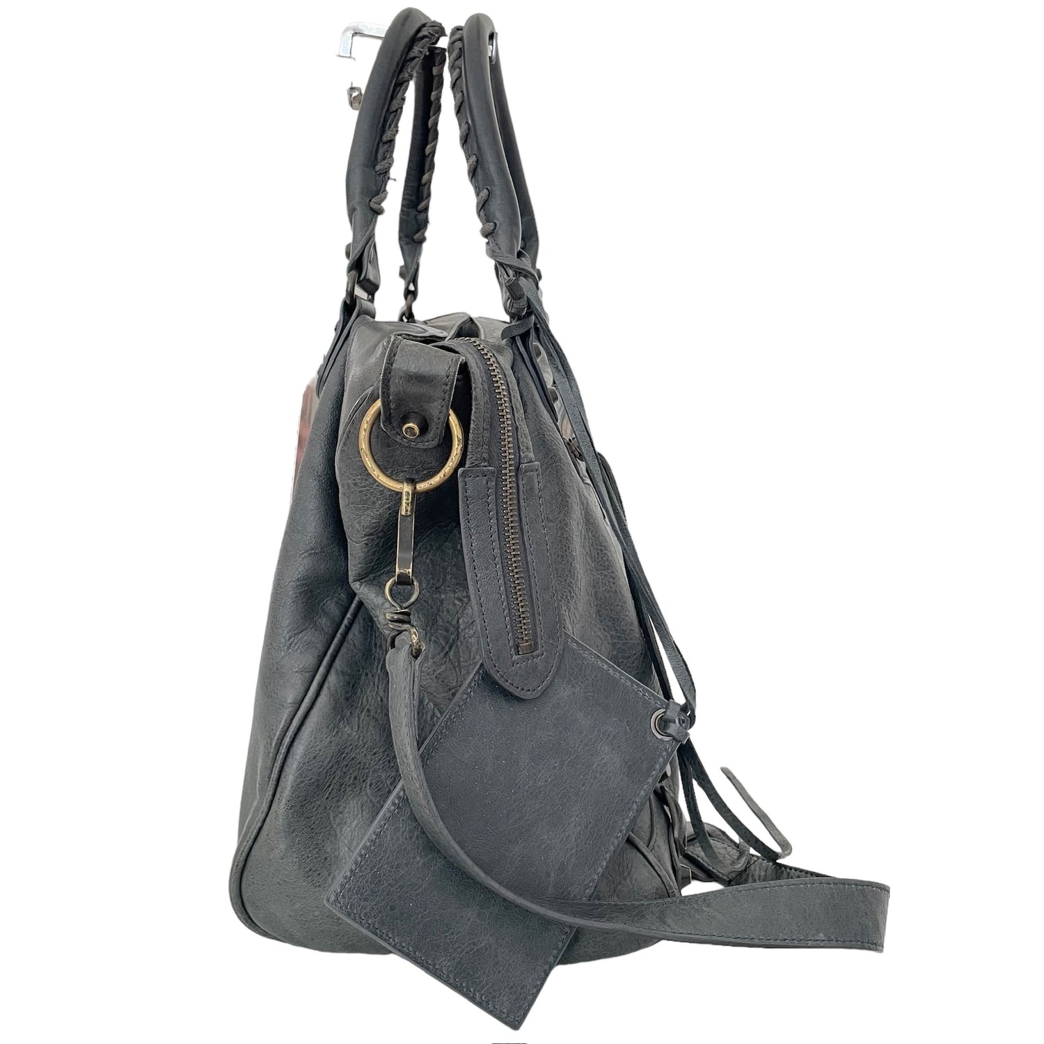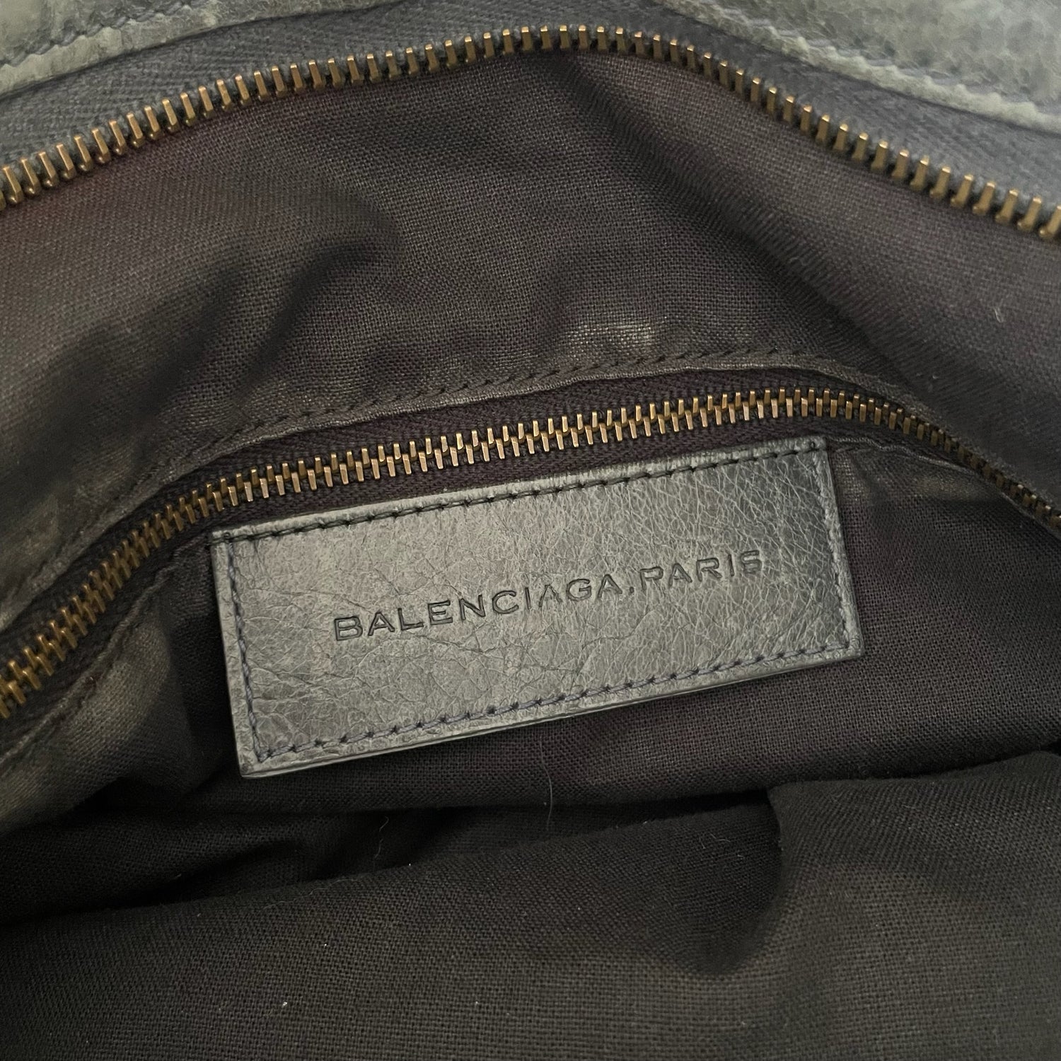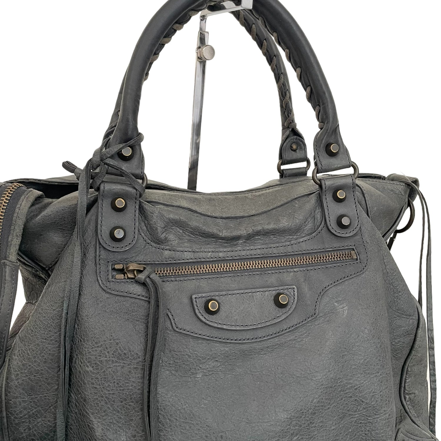 Balenciaga city bag. Grey leather. Black cotton lining. Zipper closure at top. Zipper pocket at interior.