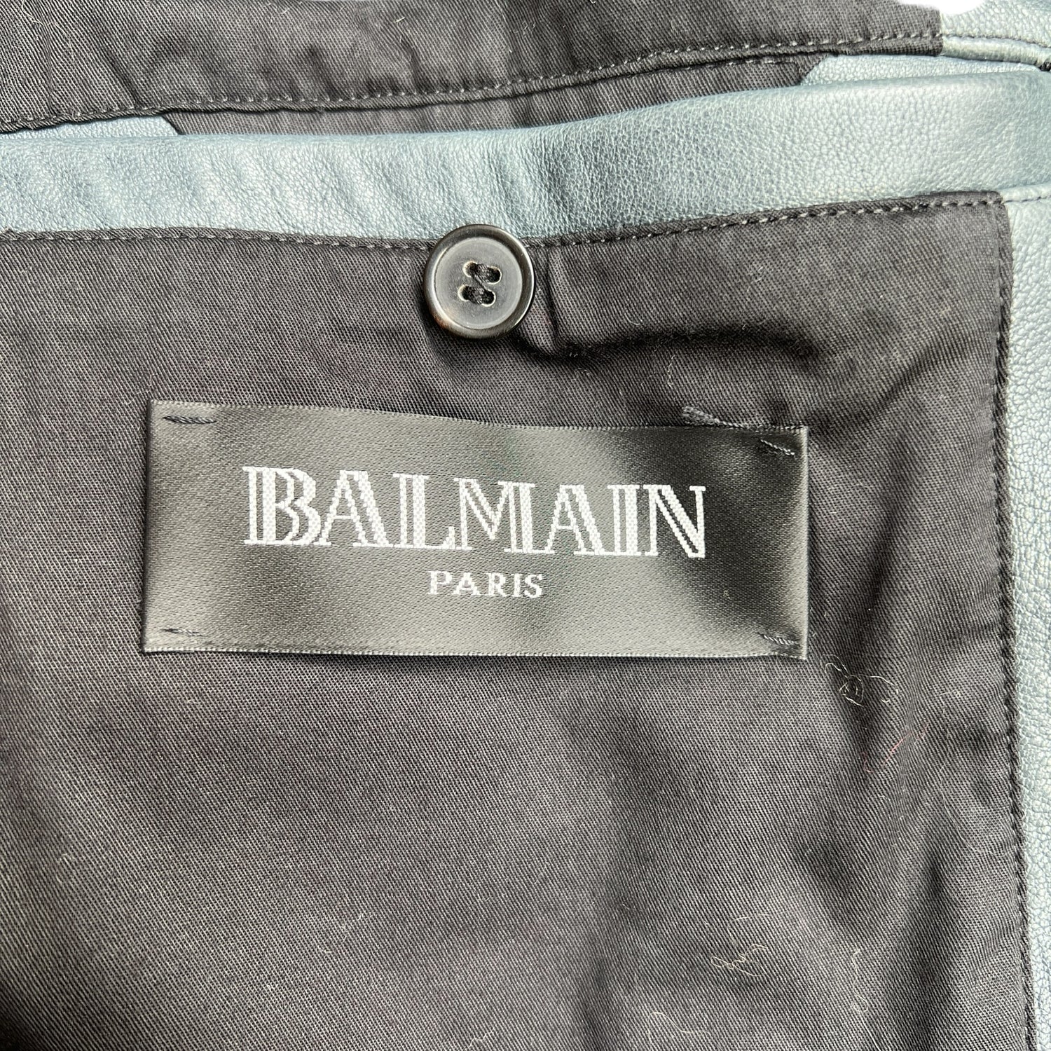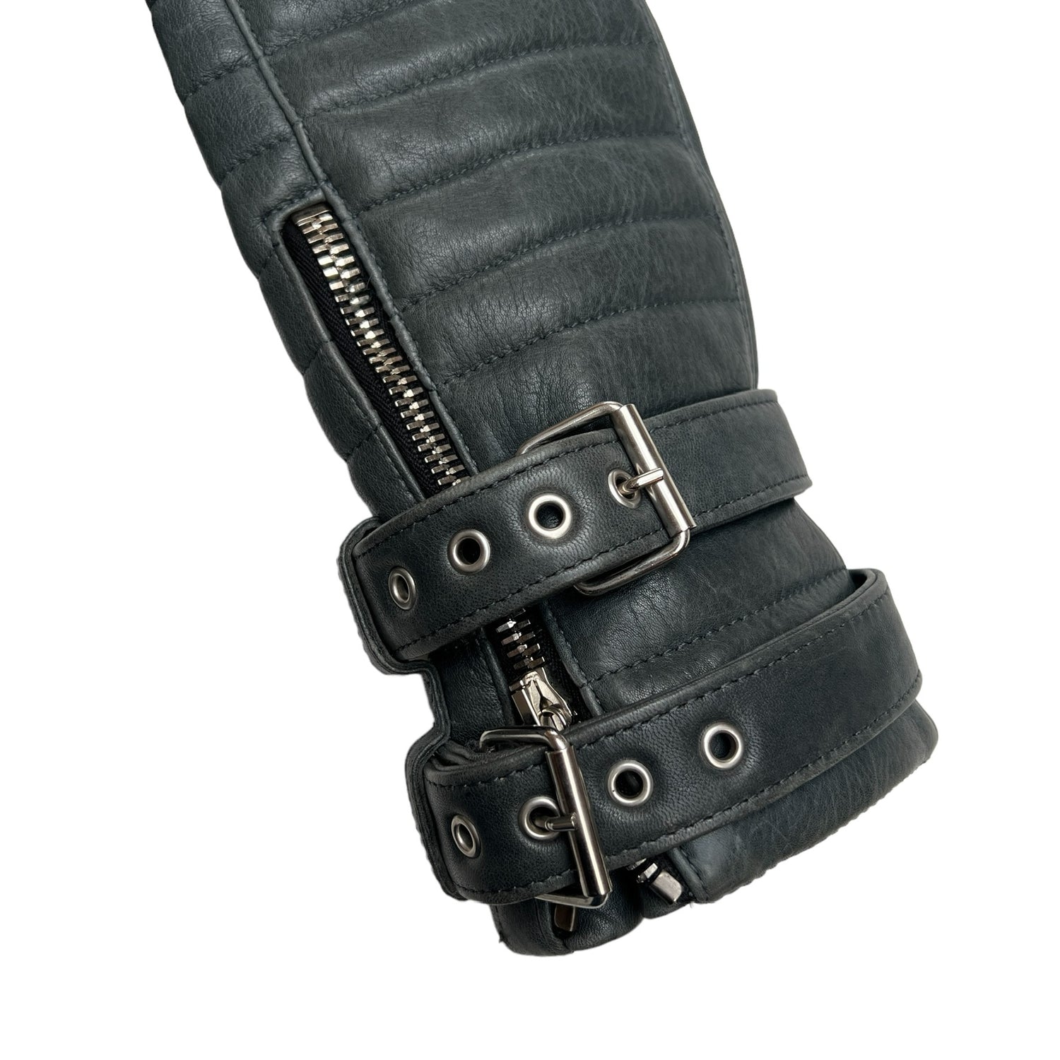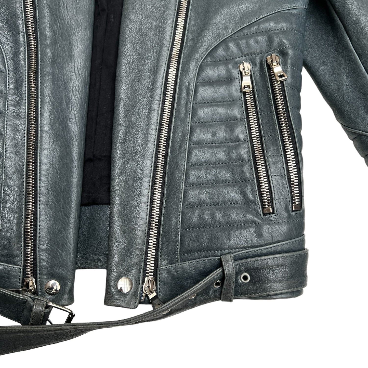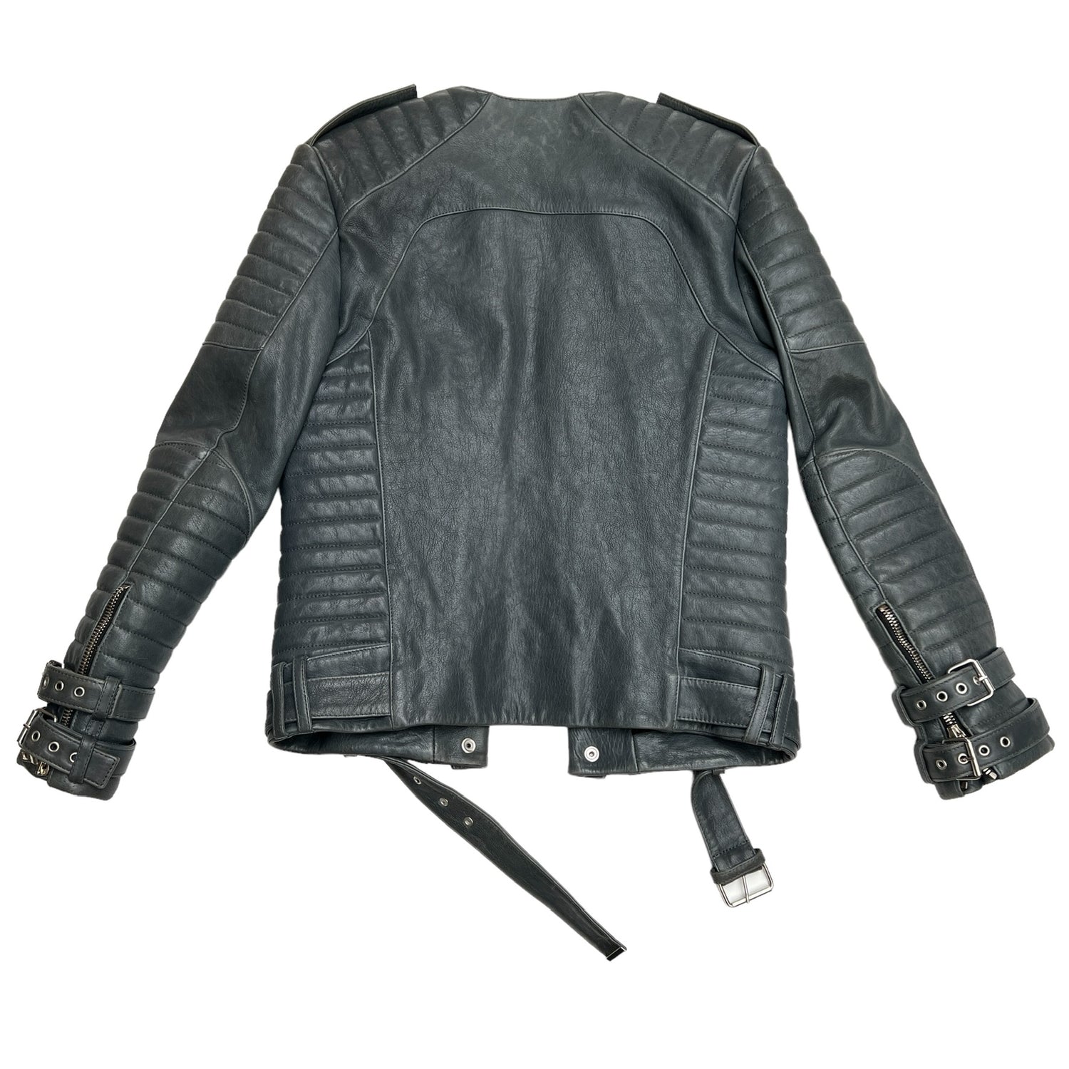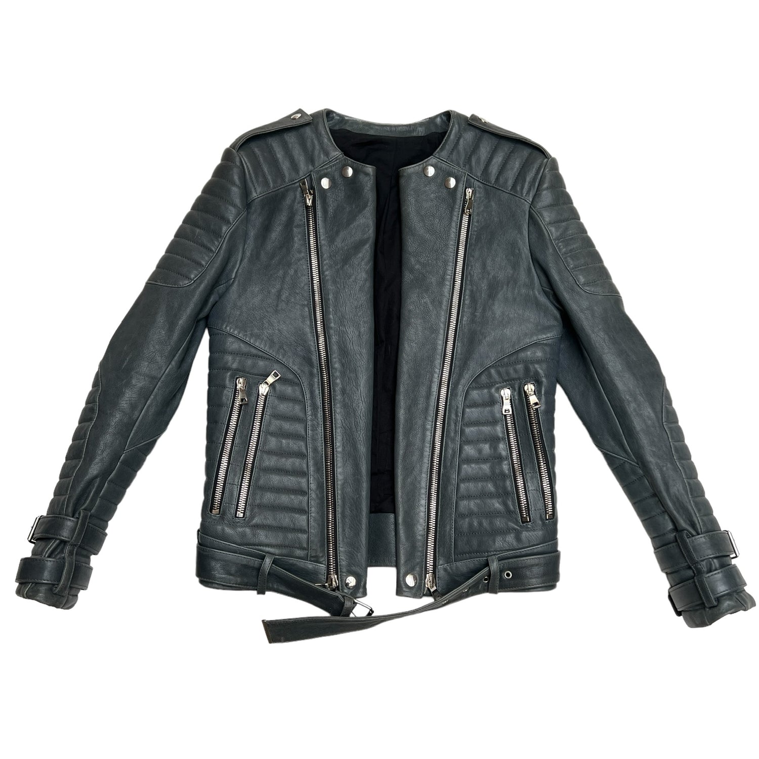 Balmain grey leather jacket. Silver-hardware. Heavy-weight leather jacket with beautiful structure. Buckles at wrists. Zipper details at front. Multiple pockets. One inside pocket. Leather and buckle belt at waist.