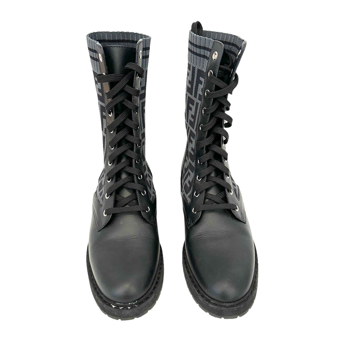 Fendi grey logo combat boots. Zucca logo at canvas. Leather trims. Round toe. Laces at front. Designer size 40.