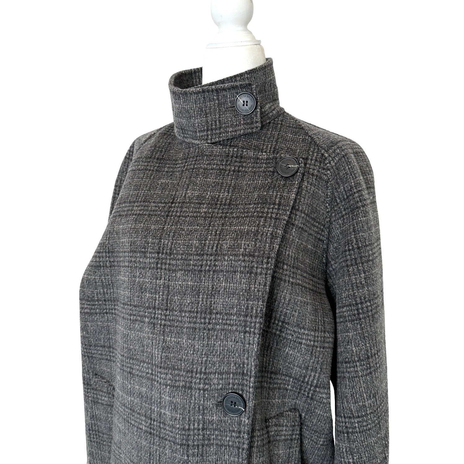 Vanessa Bruno coat. Checker print. Button closure at front. Can be worn with collar up or down. Pockets.