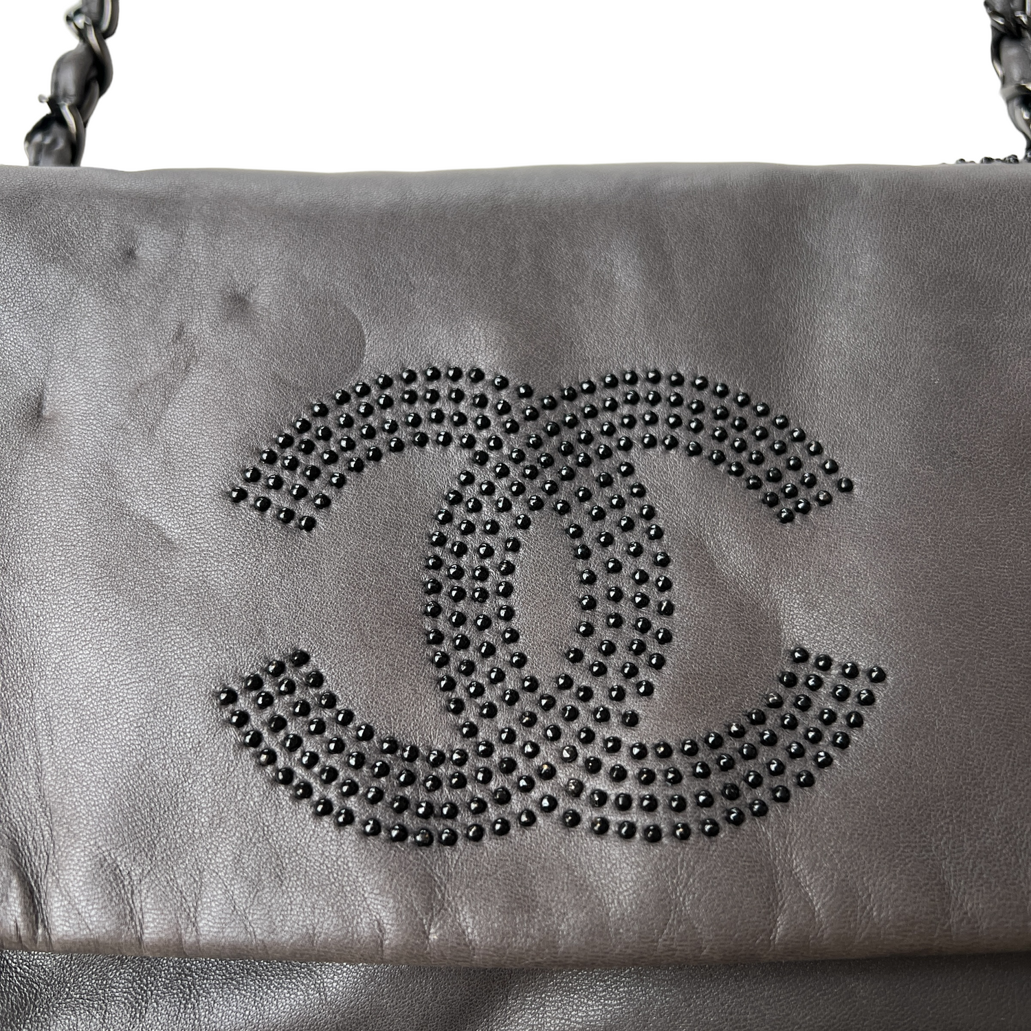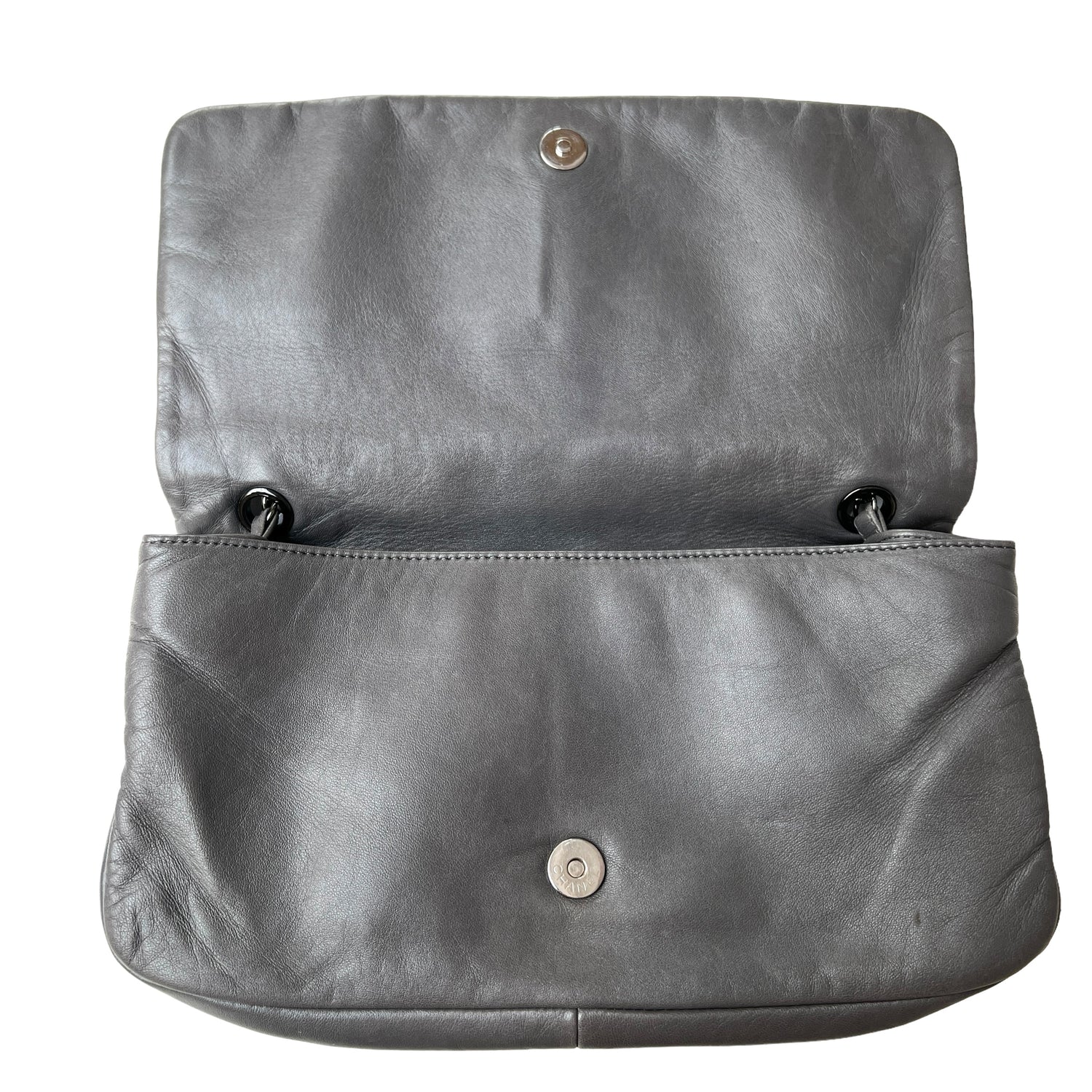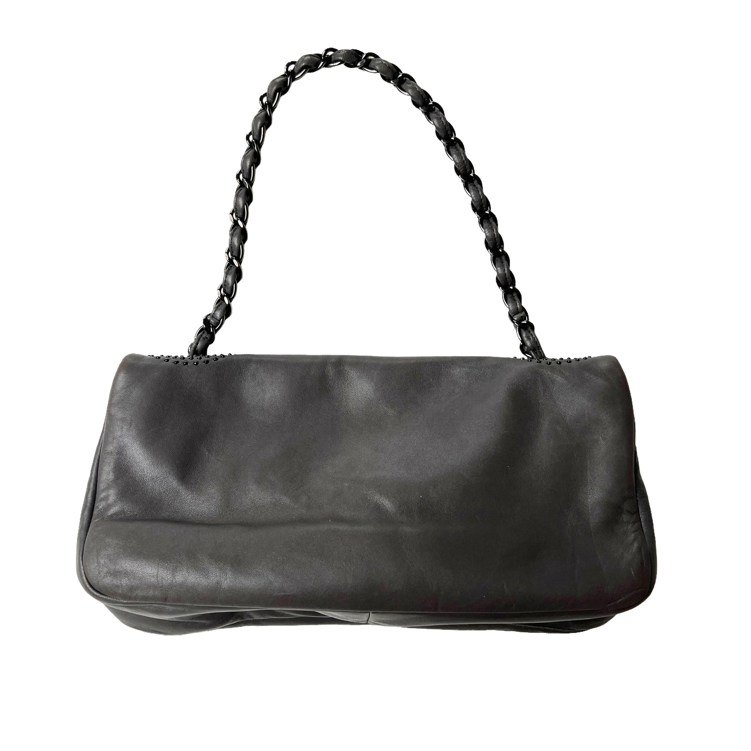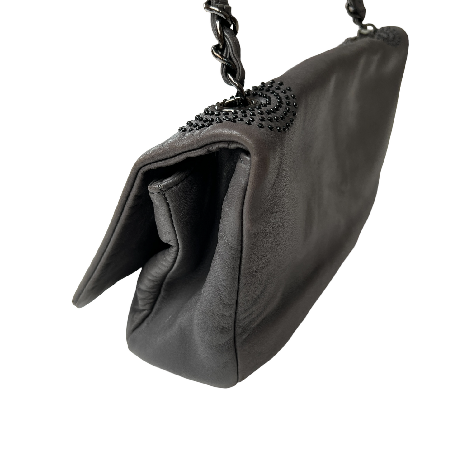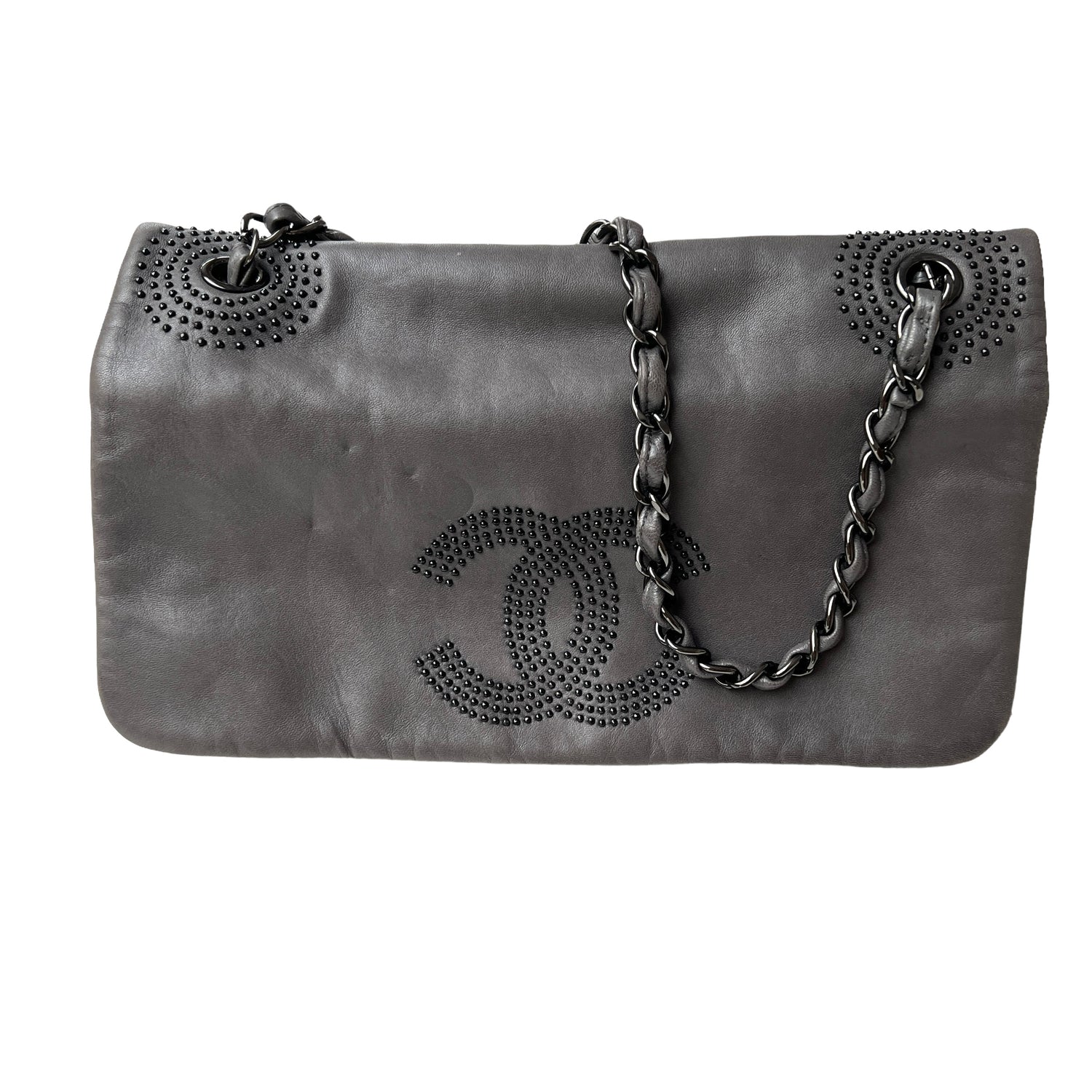 Chanel buttery soft leather grey bag. Studded logo at front. Magnetic snap flap closure. Single chain. Fabric lined. Gunmetal tone hardware. One interior zipper pocket.