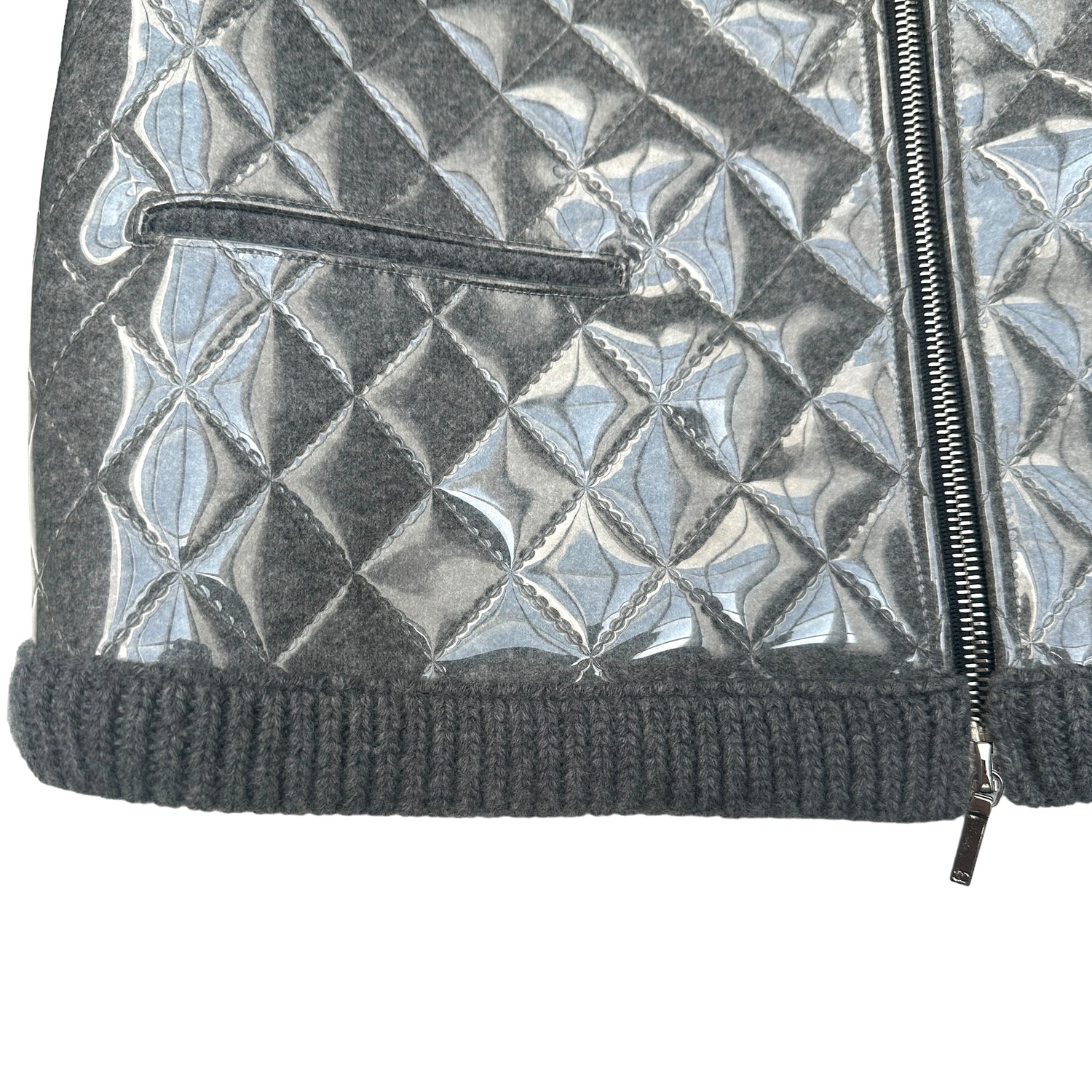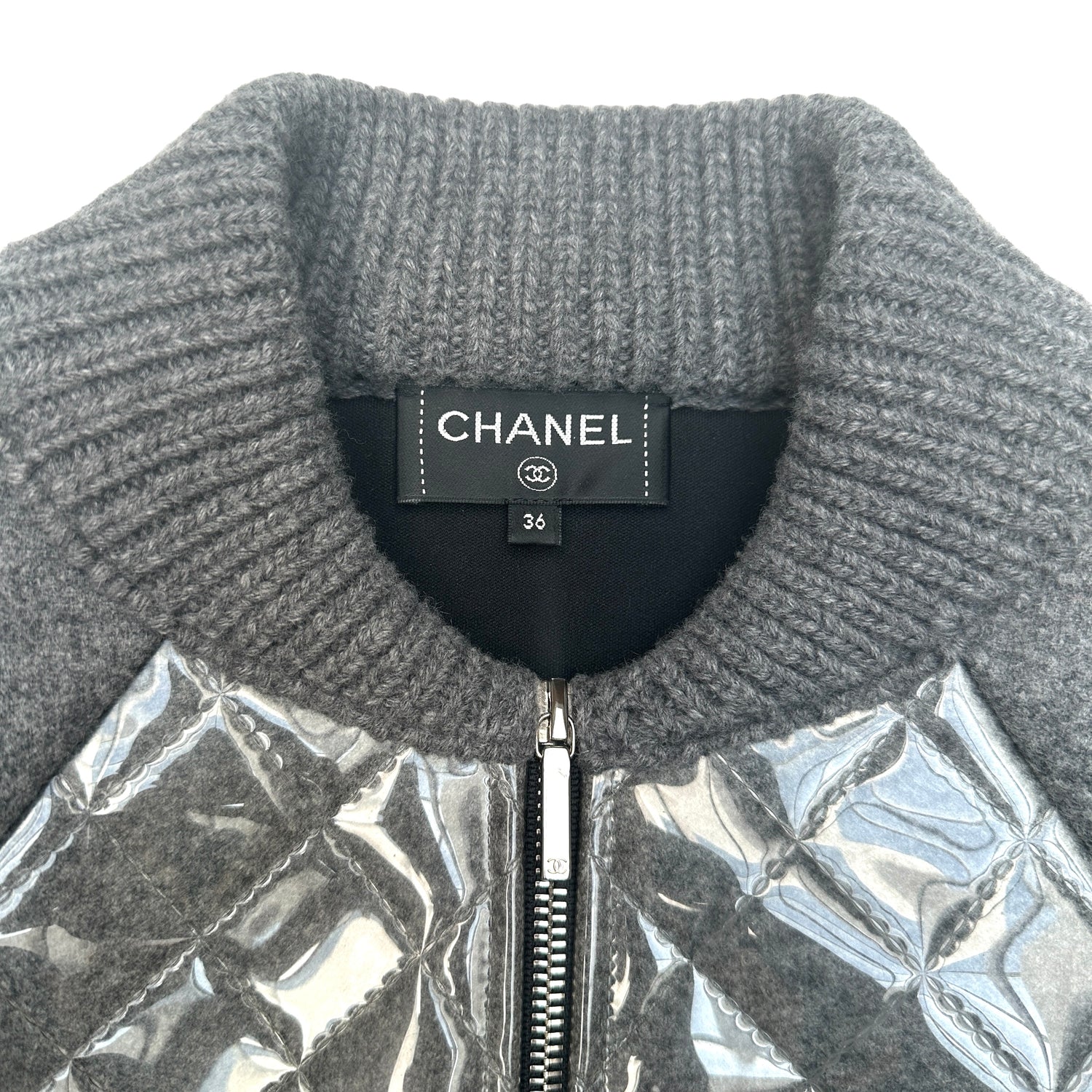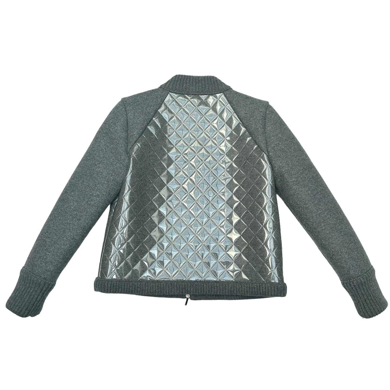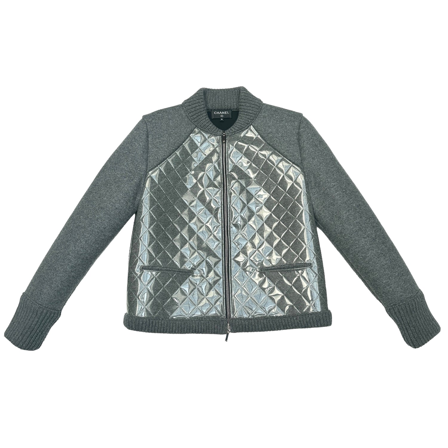 Chanel 2016 jacket. Grey wool with diamond quilted PVC. This is a rare and highly collectible piece. CC logo zipper closure. Silver-tone hardware. Two slit pockets. Designer size 36.