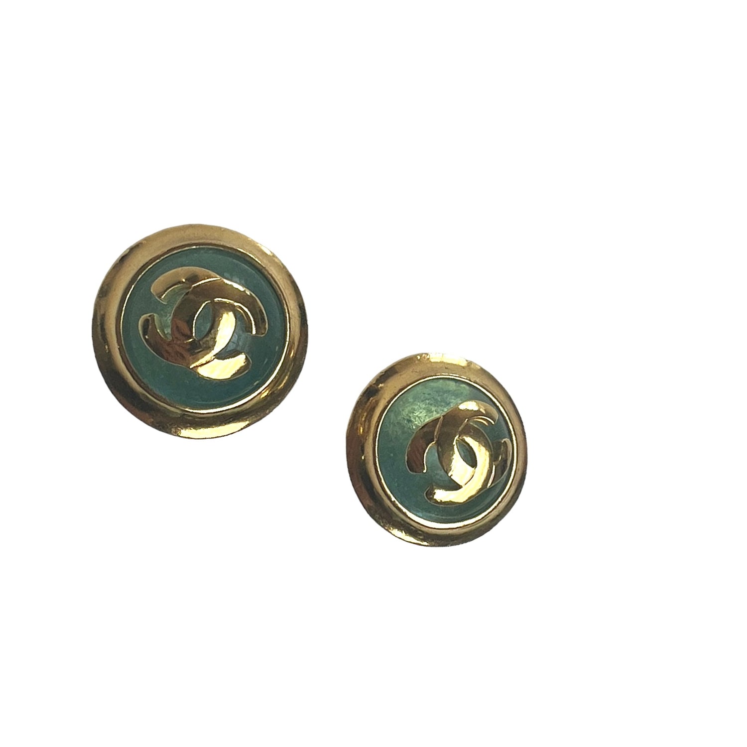 Chanel dome button earrings turquoise gripoix glass gold-tone CC logo. Emblem hallmark reads 97 P. Clip-ons closure. Do not necessitate pierced ears. Absolutely gorgeous and elegant pair of Chanel earrings. These are such a gem and would make a fantastic gift!