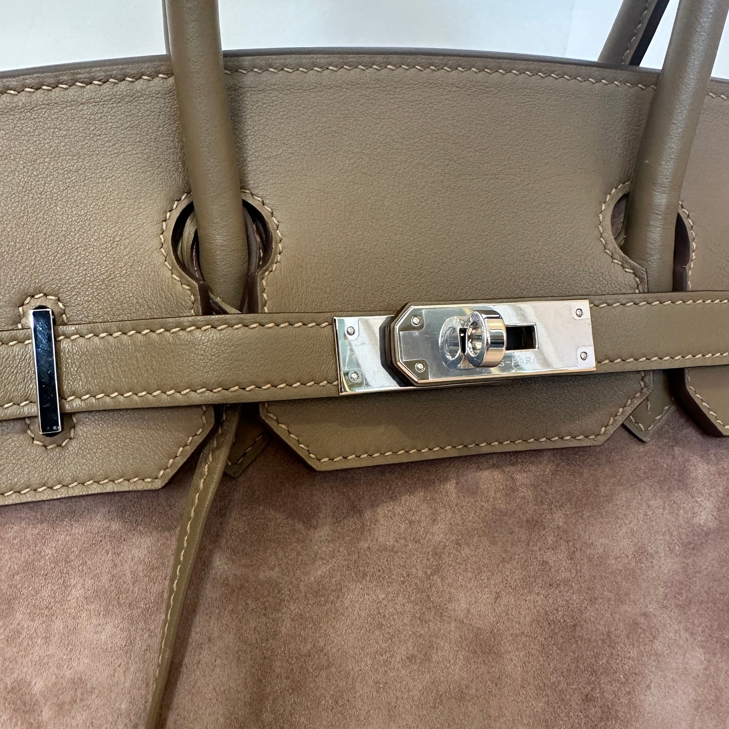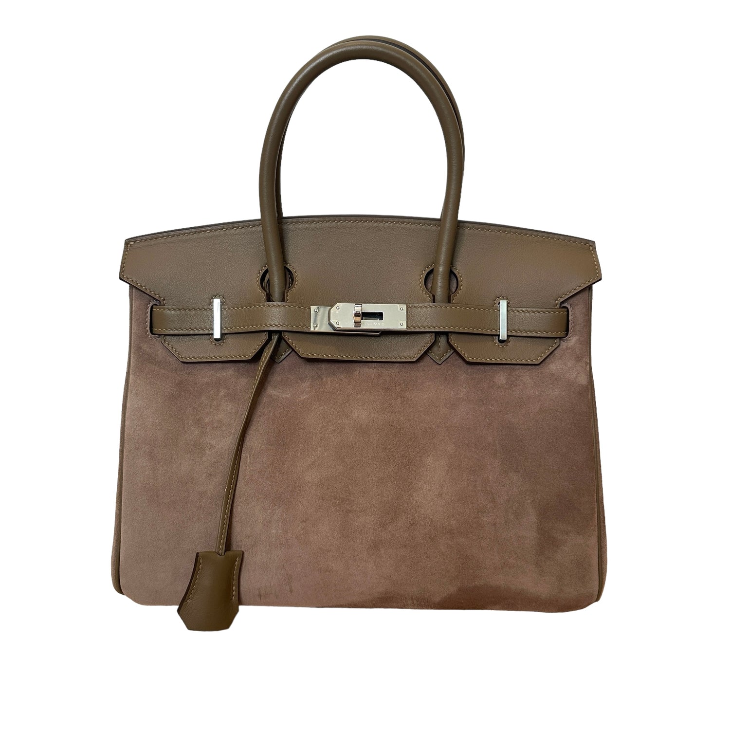 Hermes Birkin 30. Limited edition Grizzly bag. Etoupe swift leather and Caillou suede. Palladium hardware.