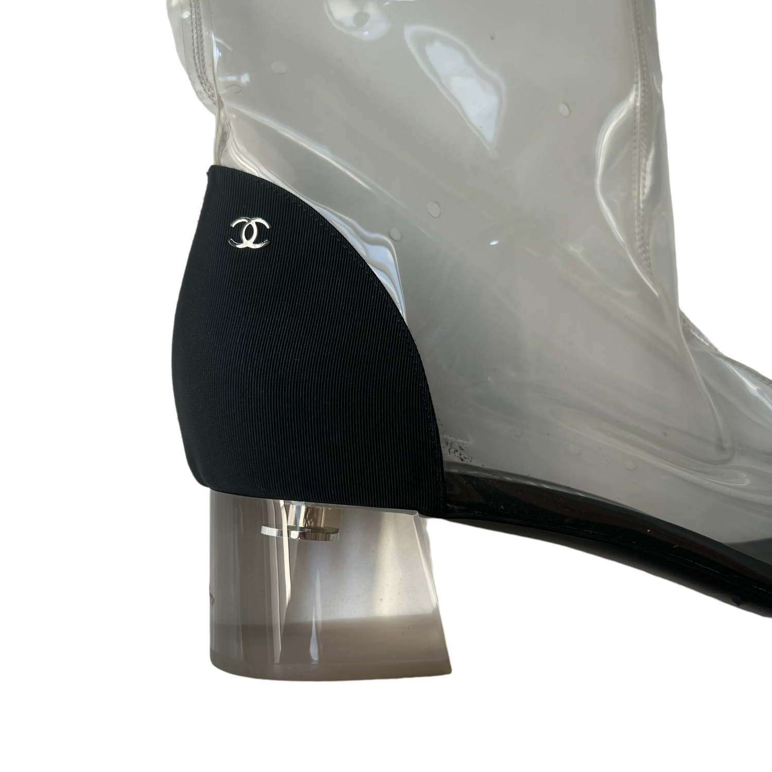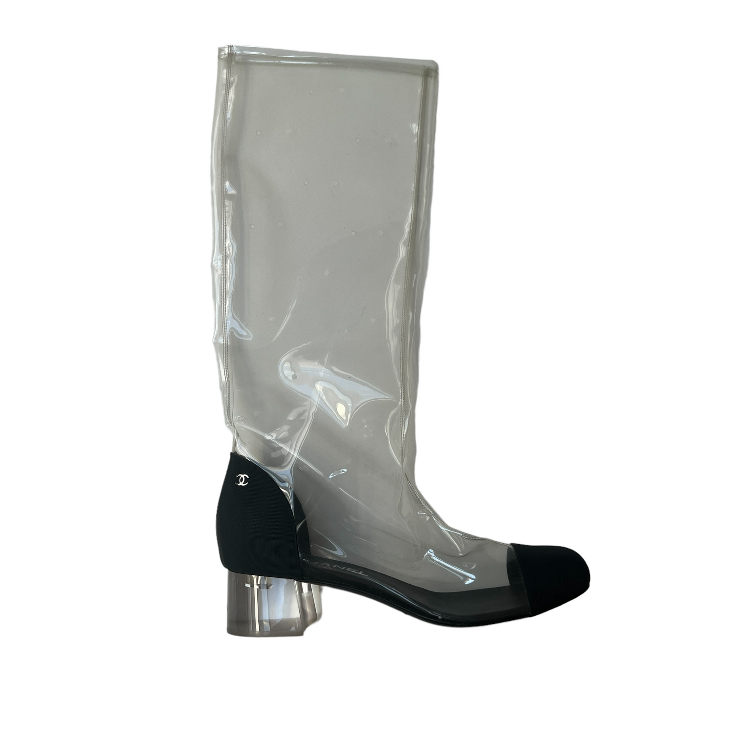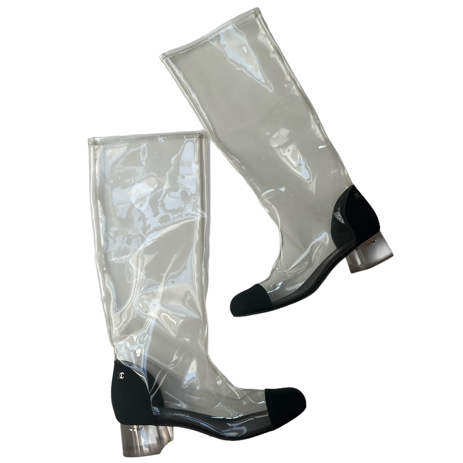 Chanel tall boots with in clear plexiglass. Grosgrain toe cap and heel. Round toe. Block clear plexiglass heels. CC logo at sides. Designer size 40.