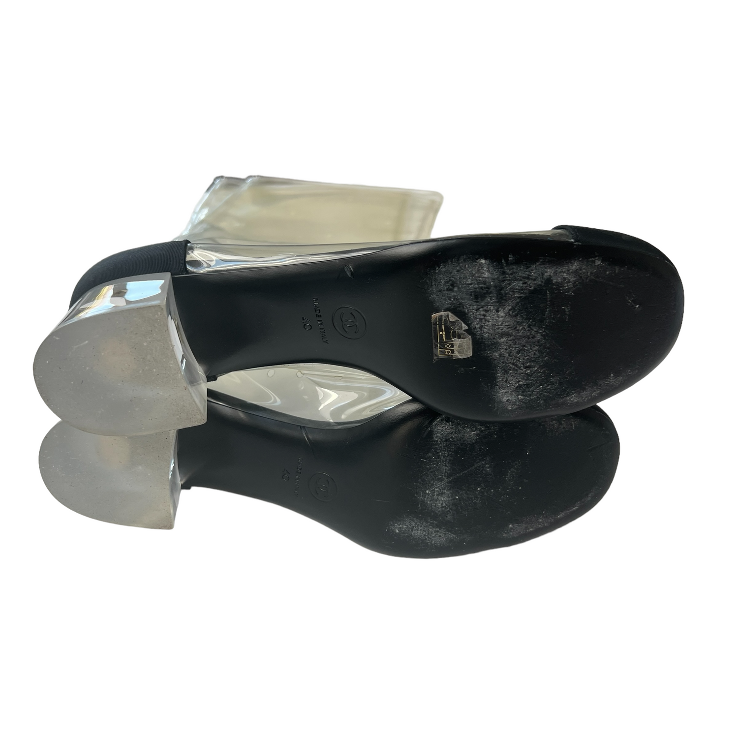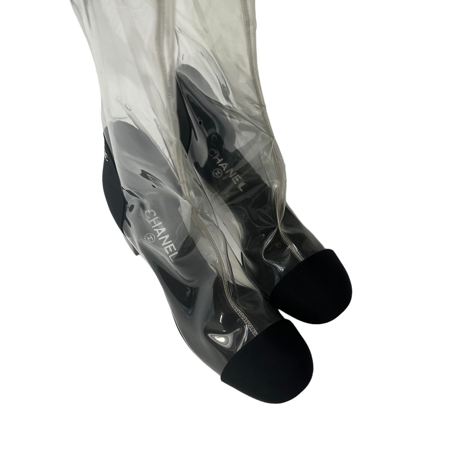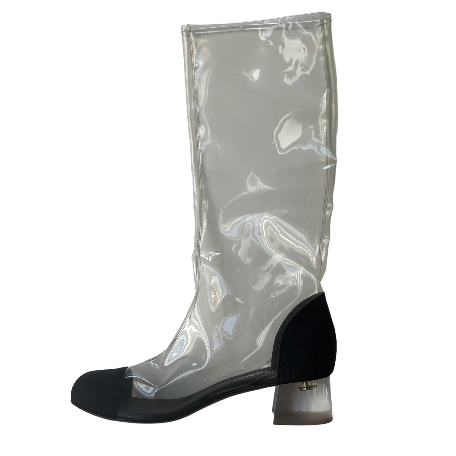 Chanel tall boots with in clear plexiglass. Grosgrain toe cap and heel. Round toe. Block clear plexiglass heels. CC logo at sides. Designer size 40.