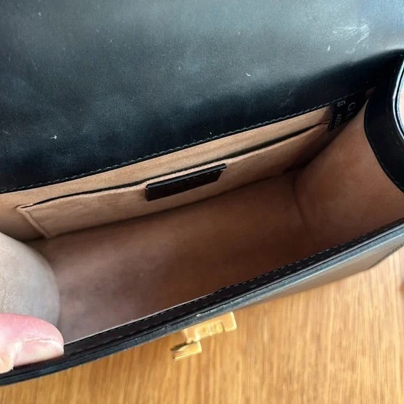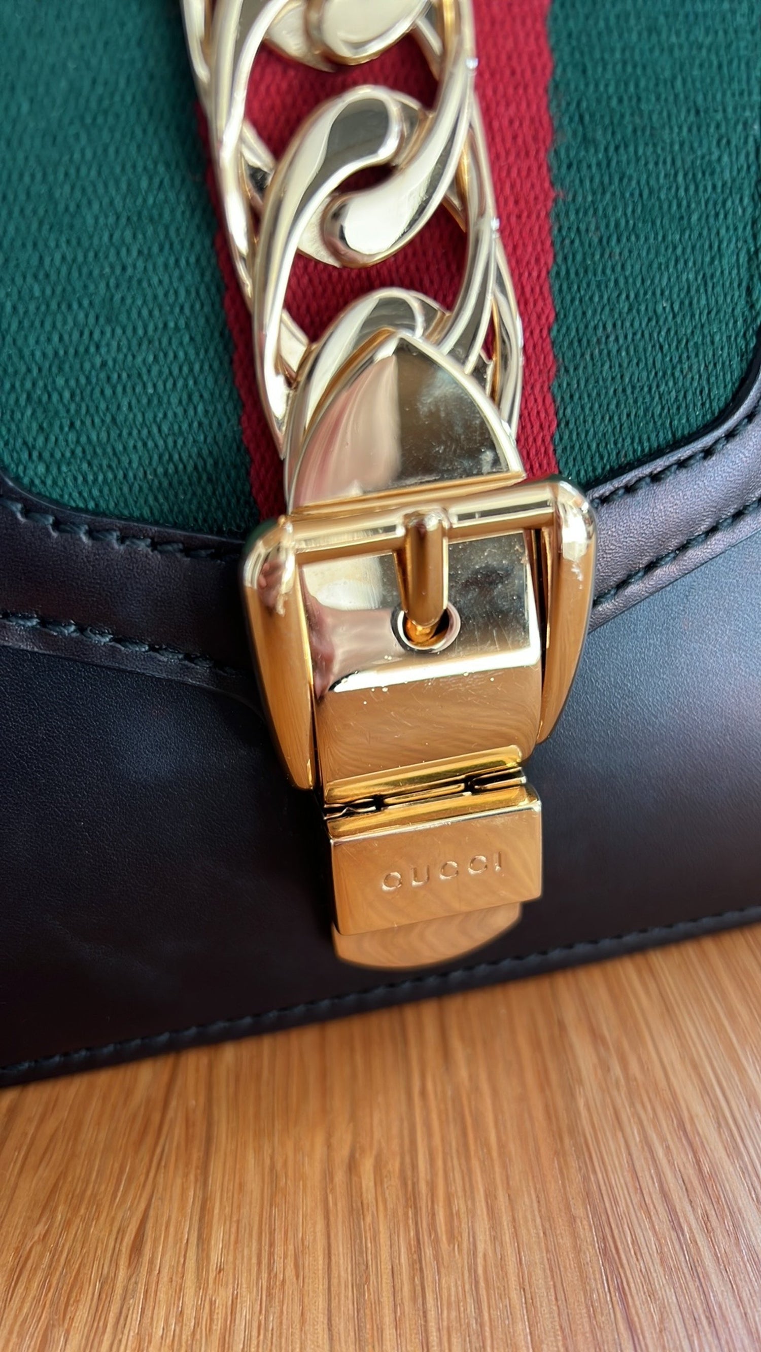 Details: Black Leather, Web Accent & Sylvie Web Accent, Gold-Tone Hardware, Single Shoulder Strap, Microfiber Lining & Single Interior Pocket, Flap Closure at Front