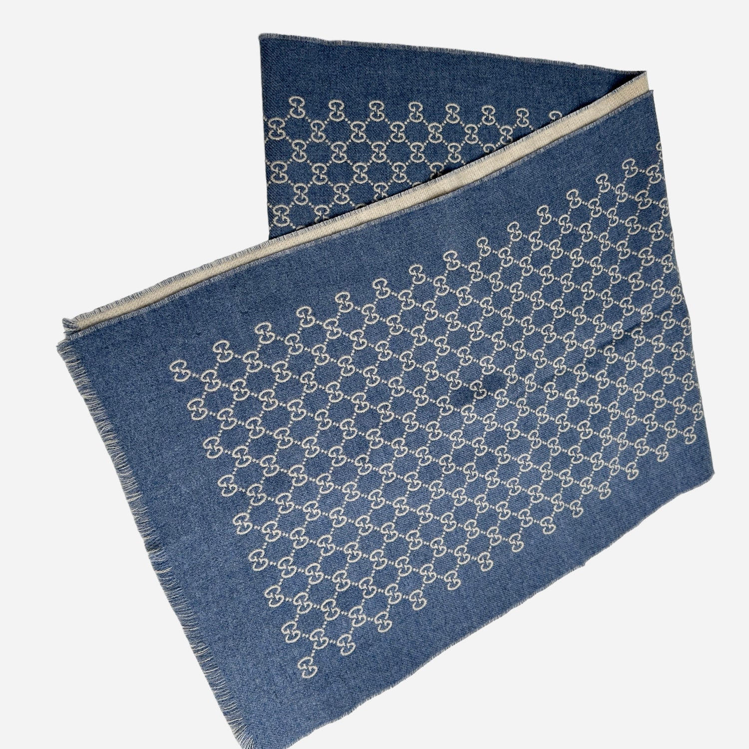 Gucci wool logo scarf. Blue denim and cream color. Raw fringes.