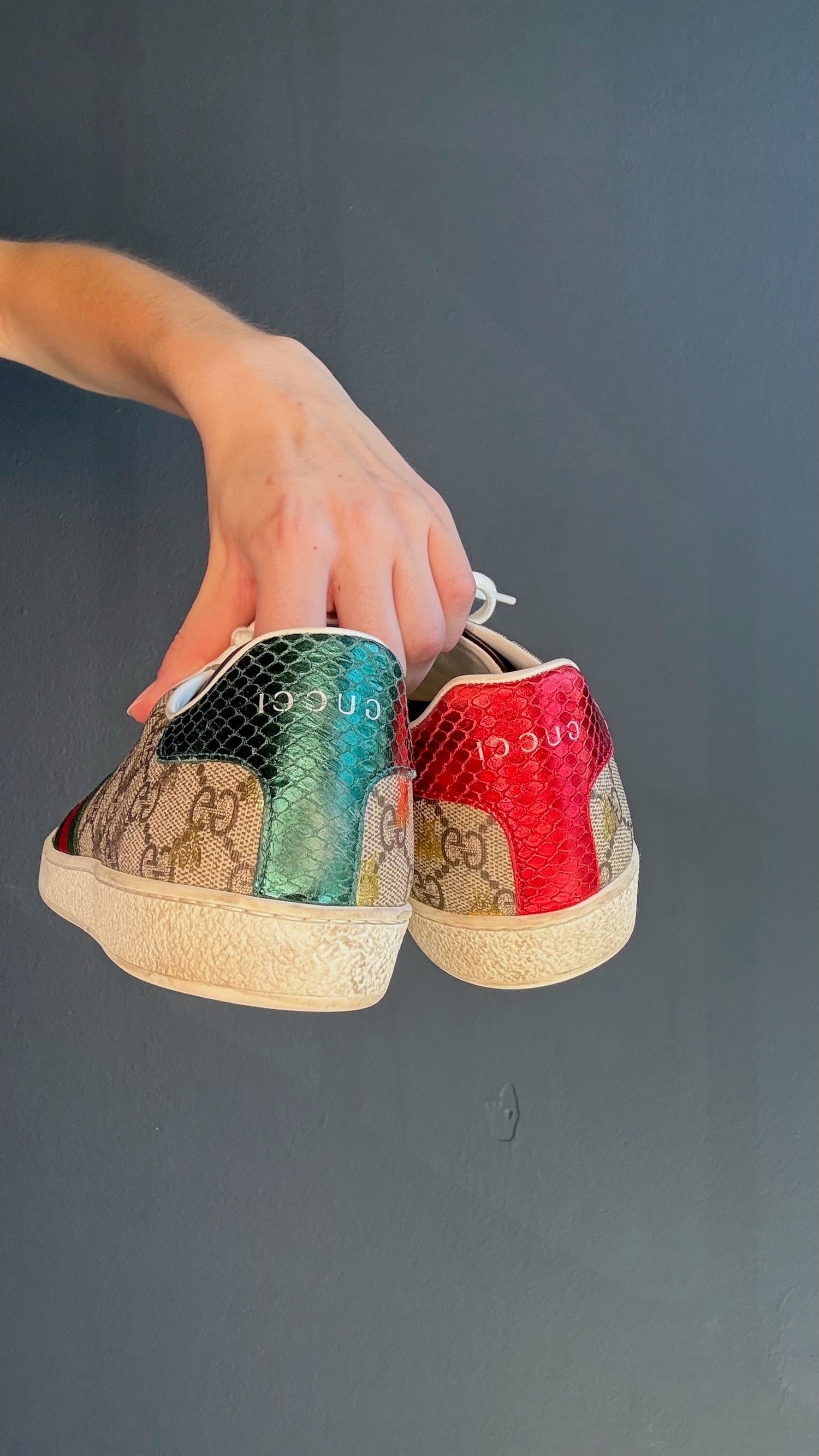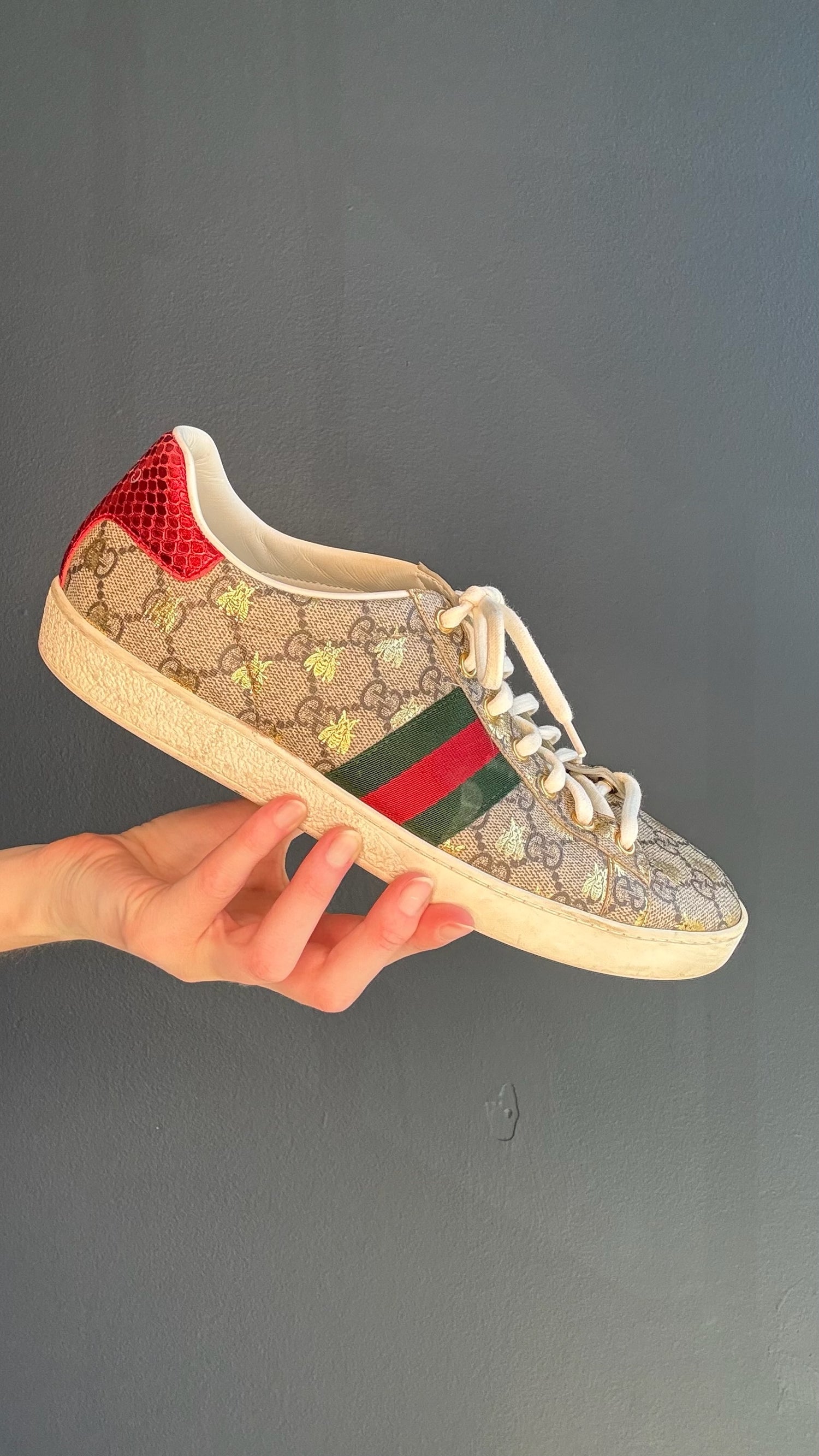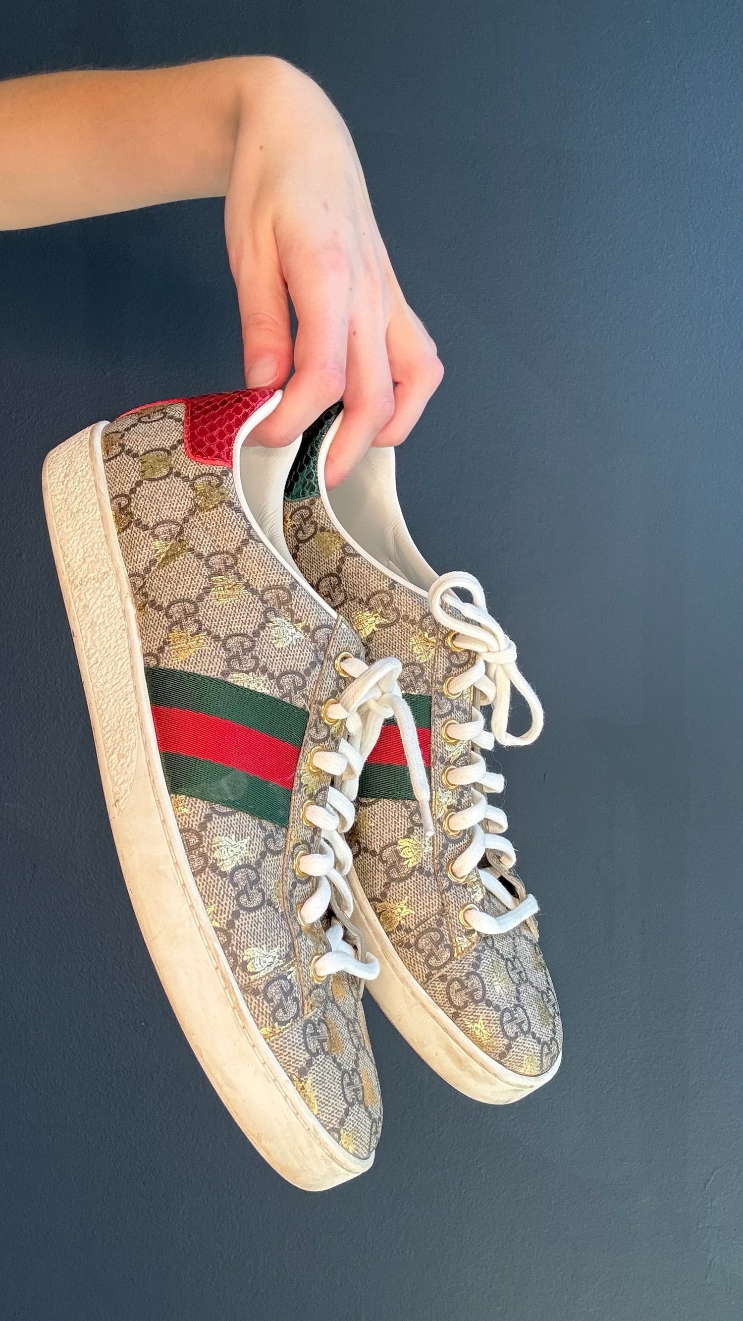 Gucci monogram web canvas sneakers w/ gold bee print. Red and green scale detail at heels. Designer size 40
