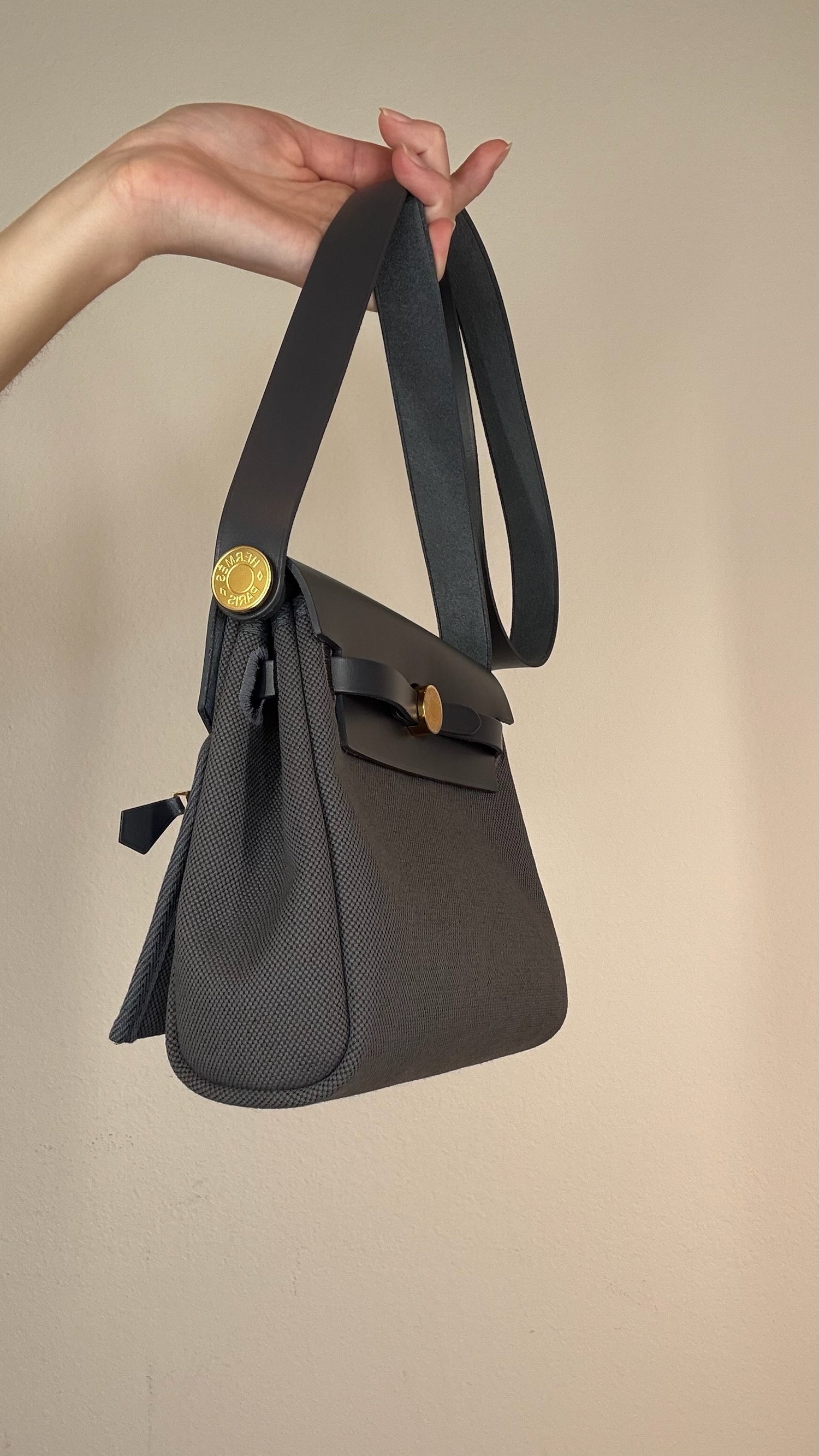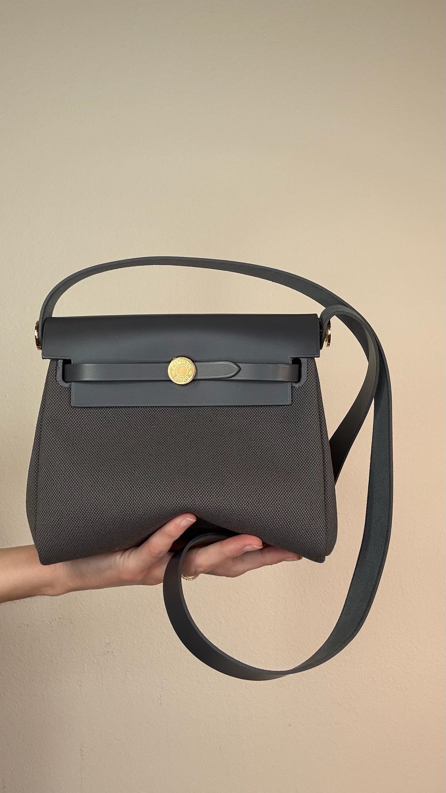 Hermes Herbag Mini 20cm in grey leather and canva. Full set, comes with receipt.