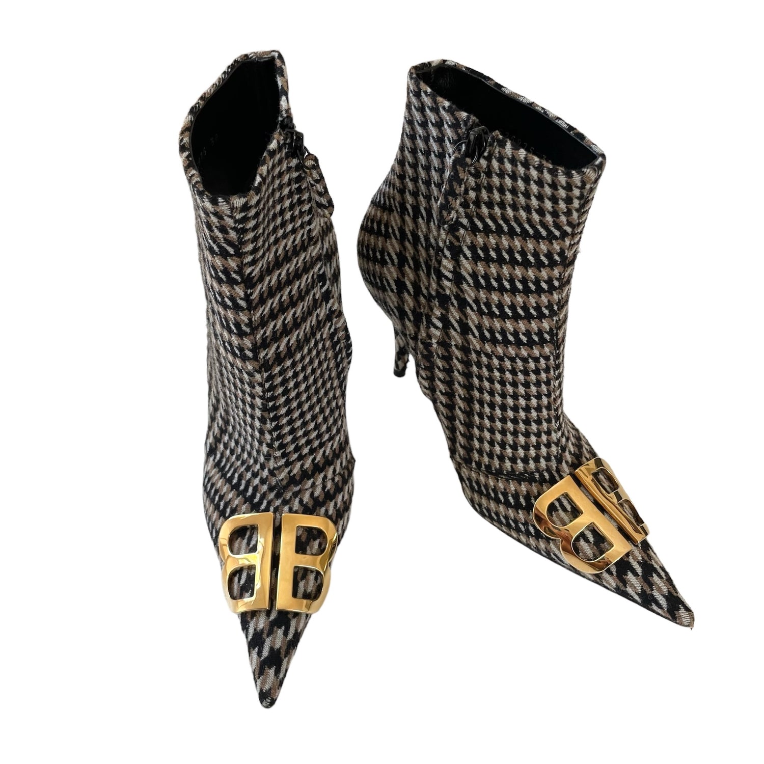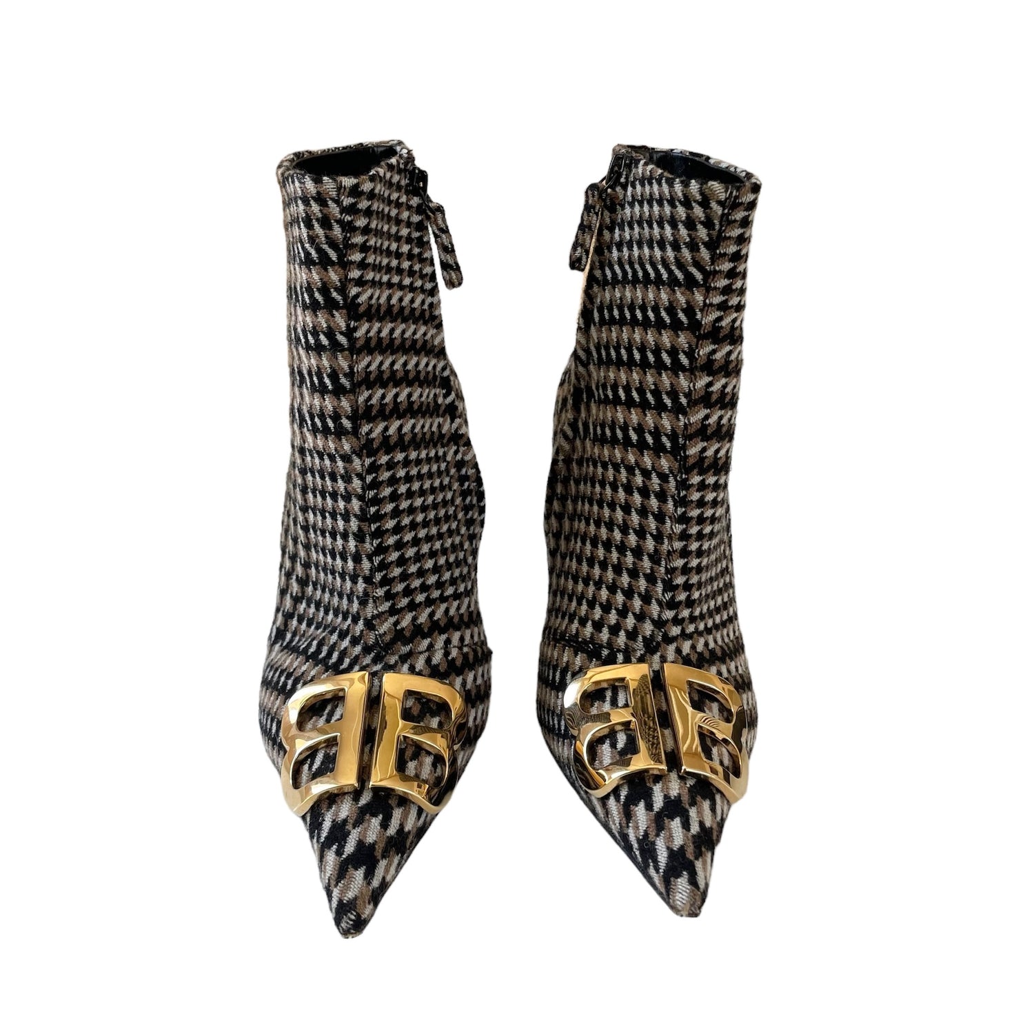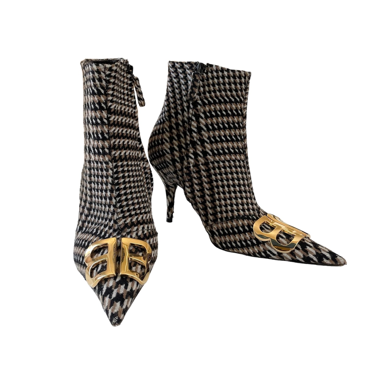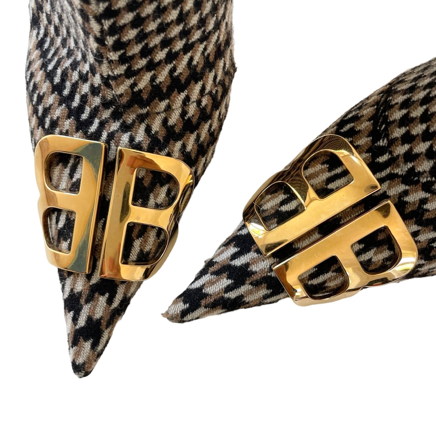 Balenciaga herringbone pattern heeled boots w/gold logo hardware at toes. Pointed toe. Side zipper closures. Designer size 38.