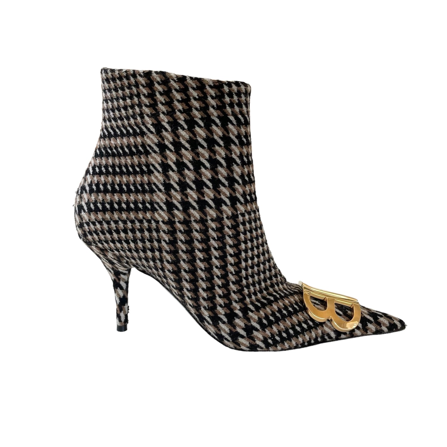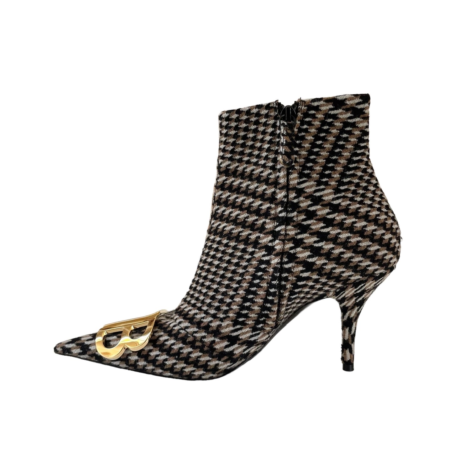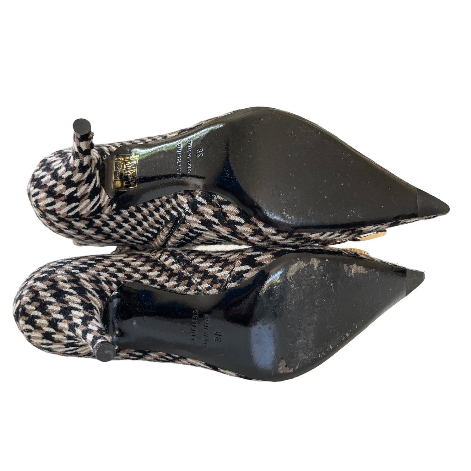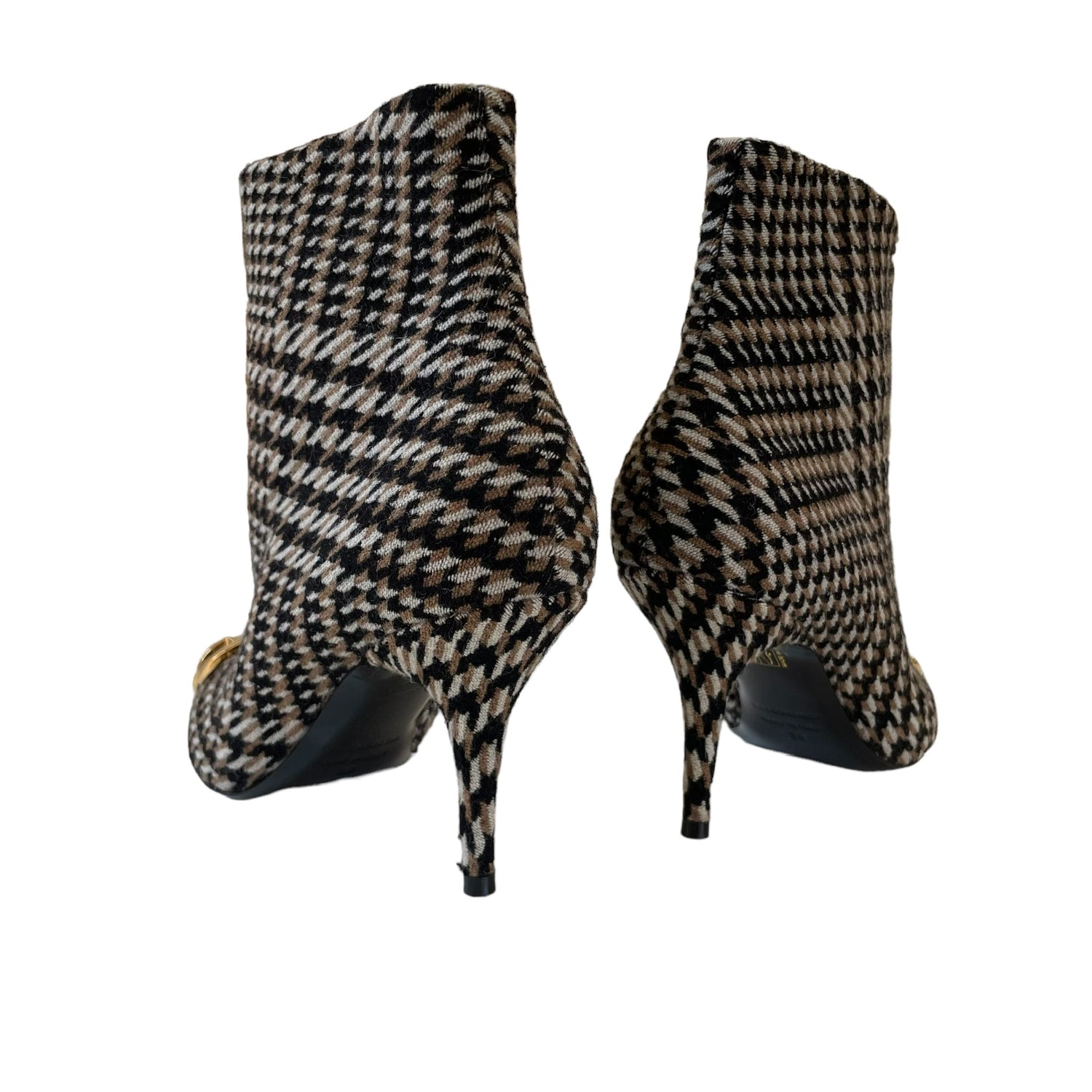 Balenciaga herringbone pattern heeled boots w/gold logo hardware at toes. Pointed toe. Side zipper closures. Designer size 38.