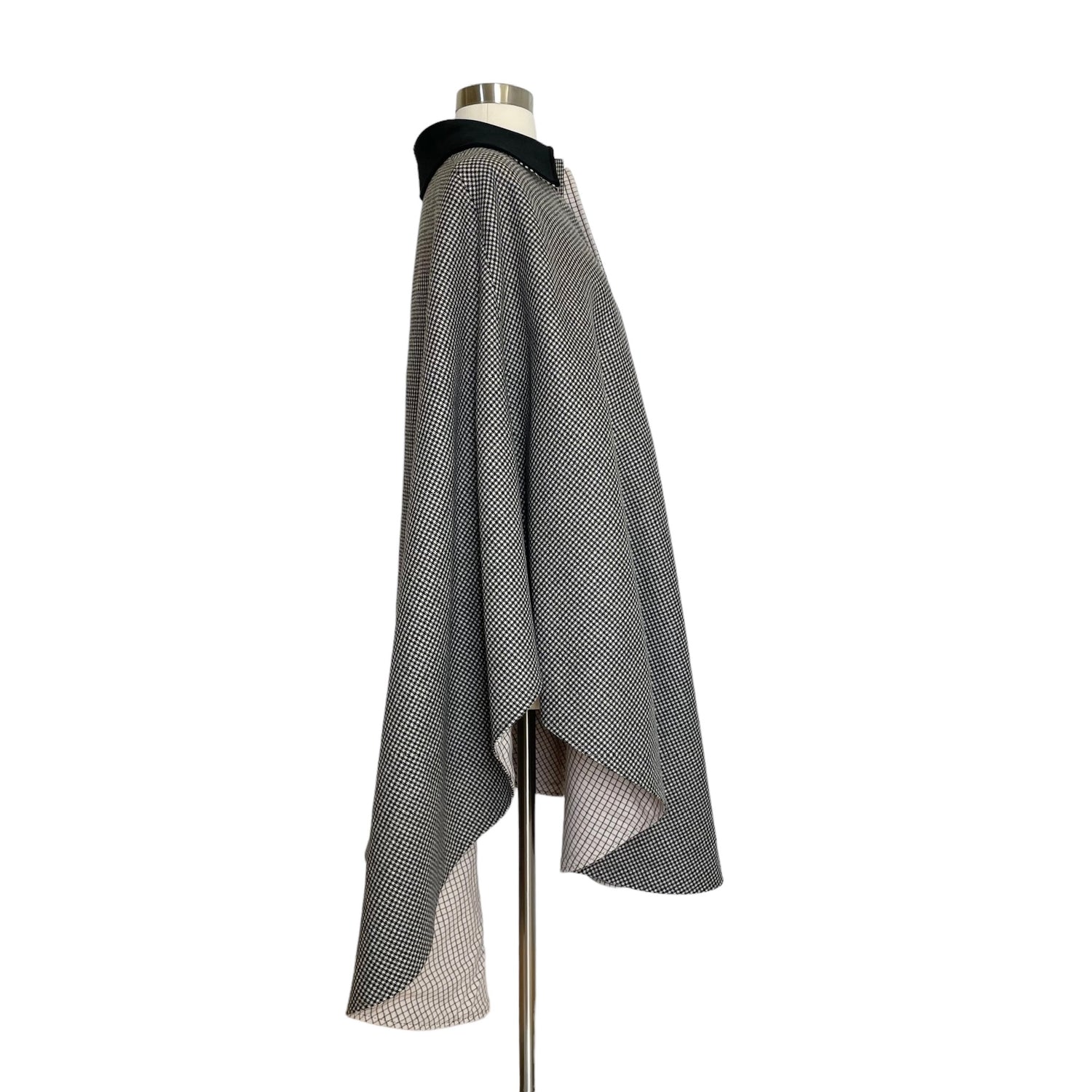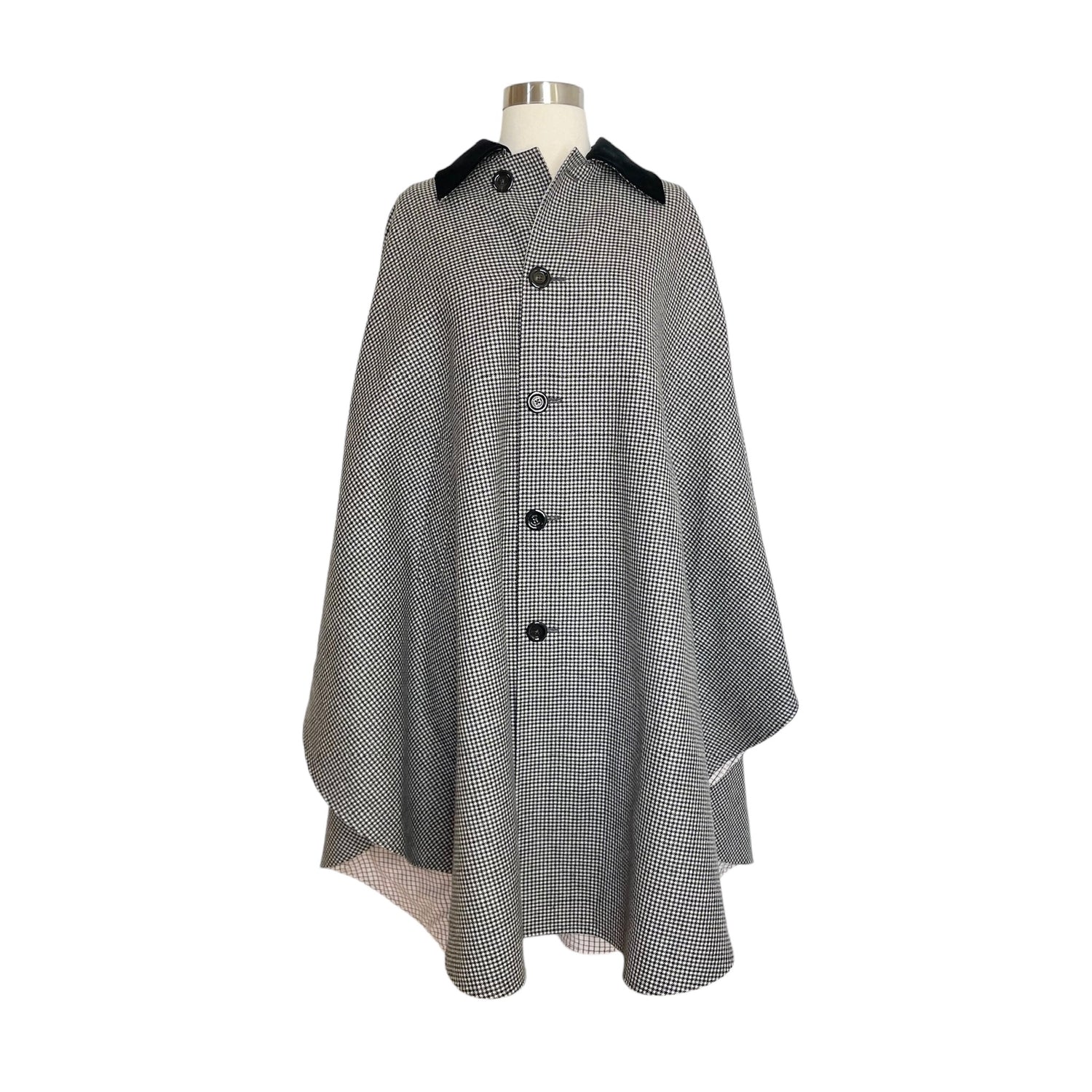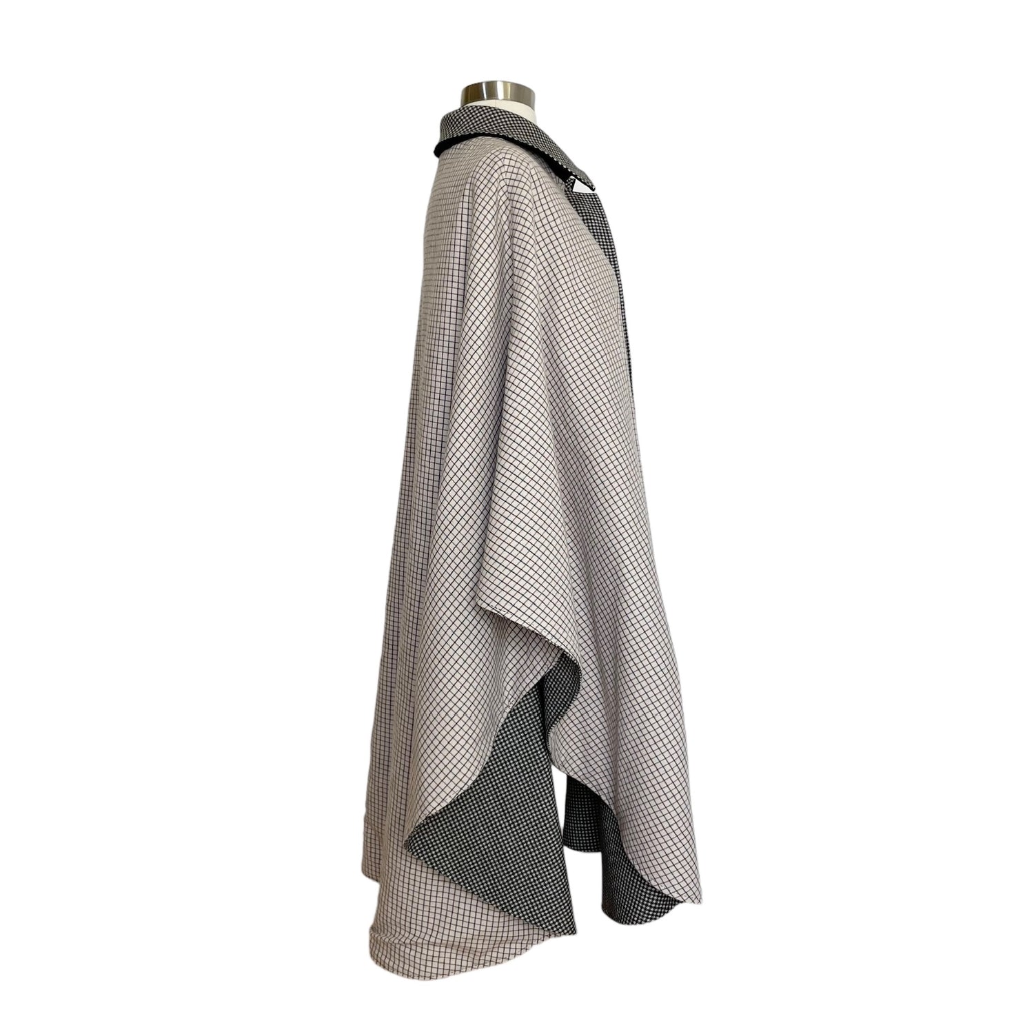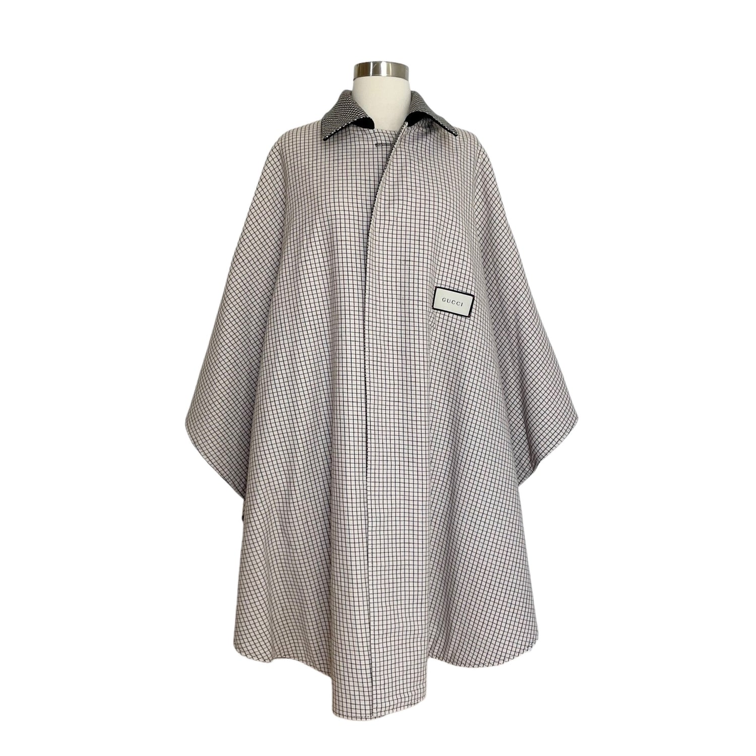 Gucci reversible houndstooth and plaid cape with collar and buttons down the front. Slit pockets at side. Designer size 44