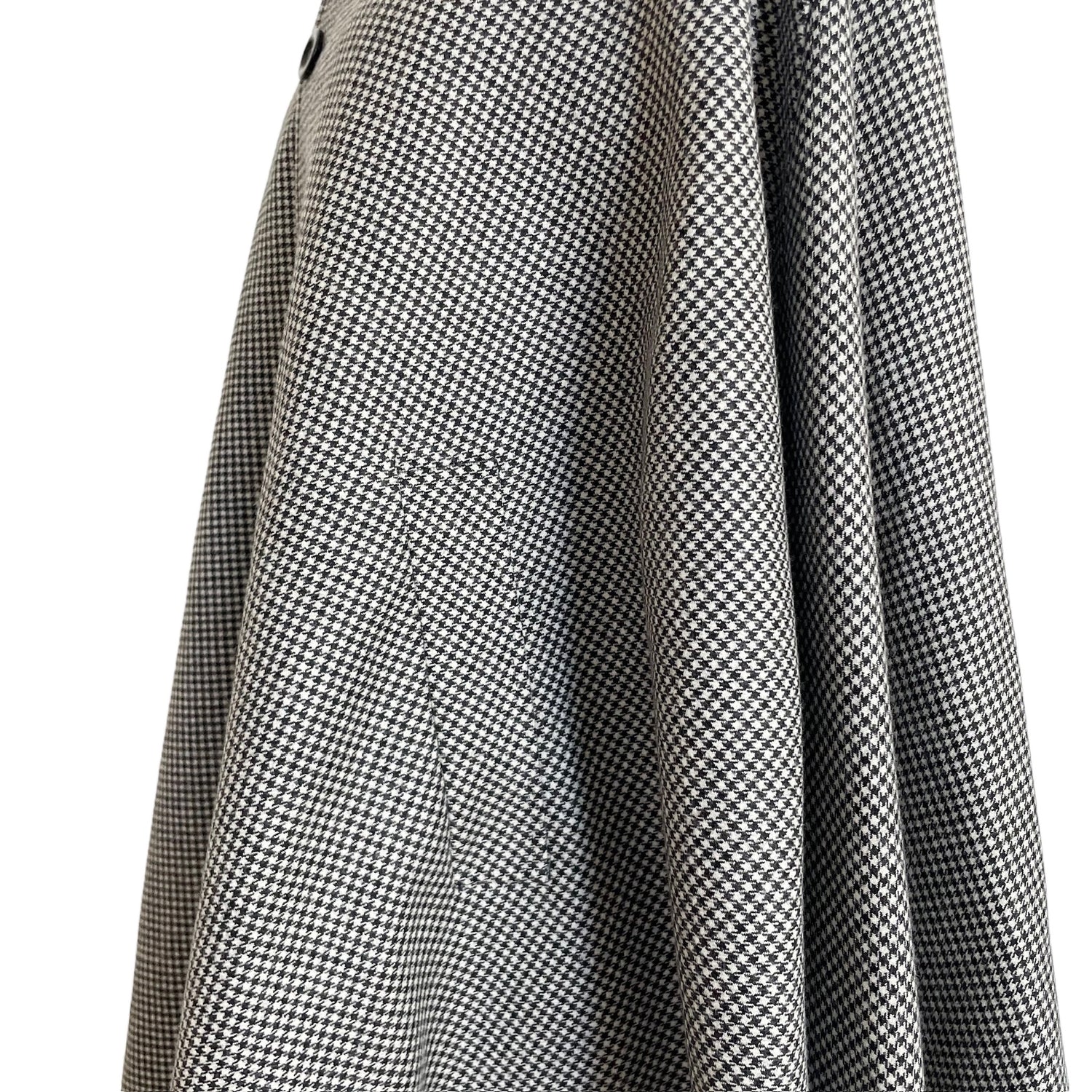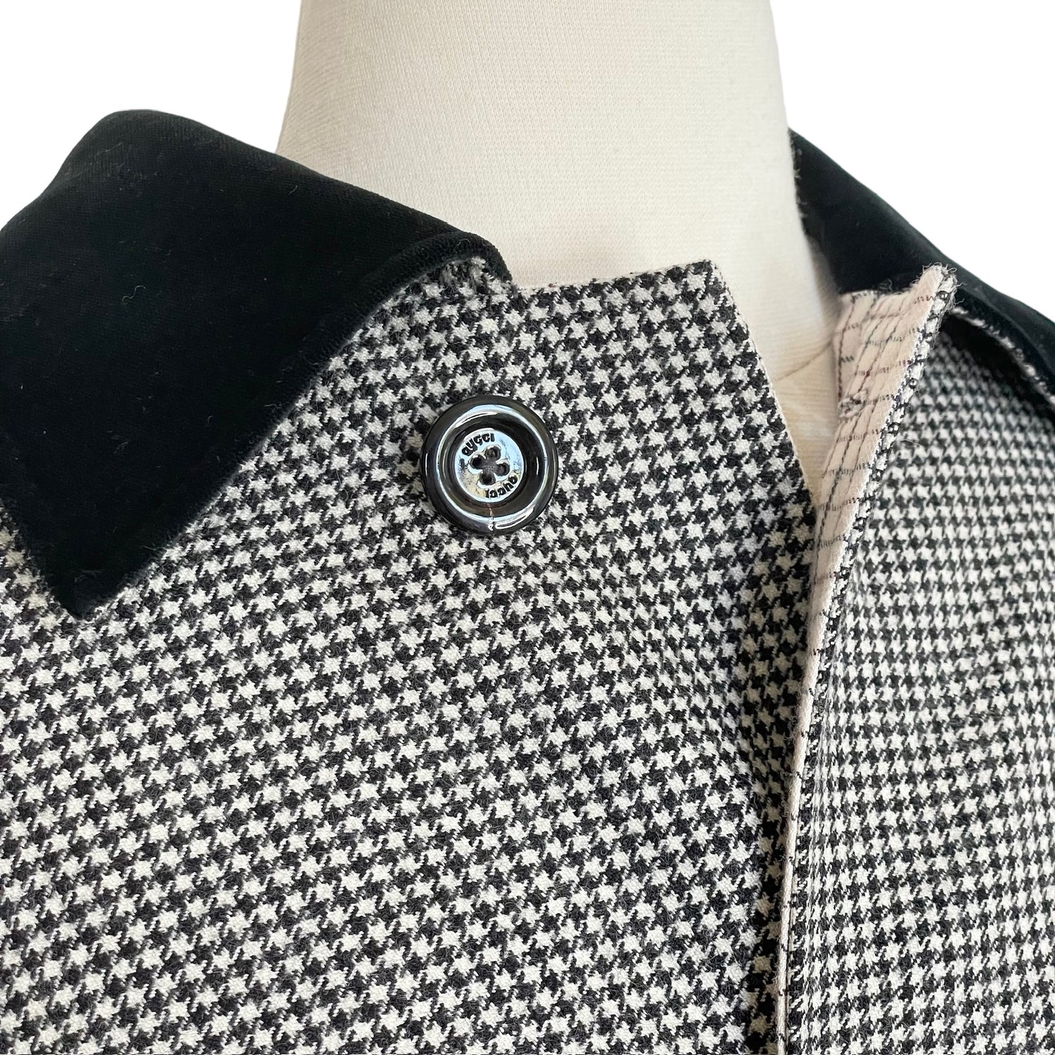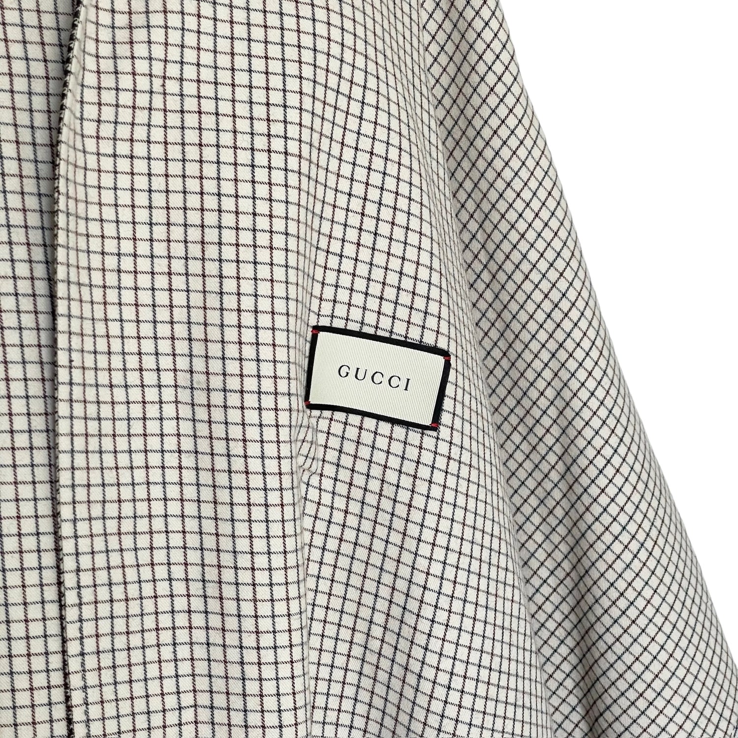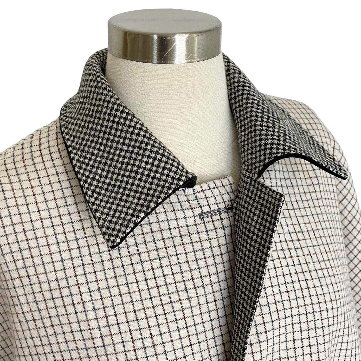 Gucci reversible houndstooth and plaid cape with collar and buttons down the front. Slit pockets at side. Designer size 44