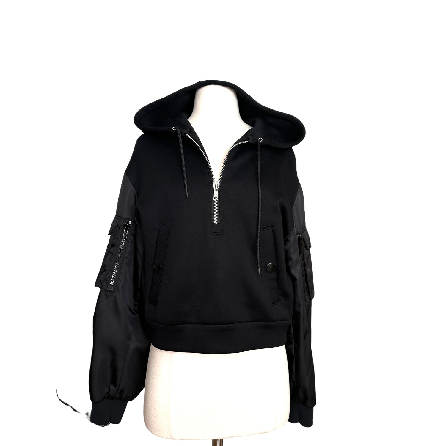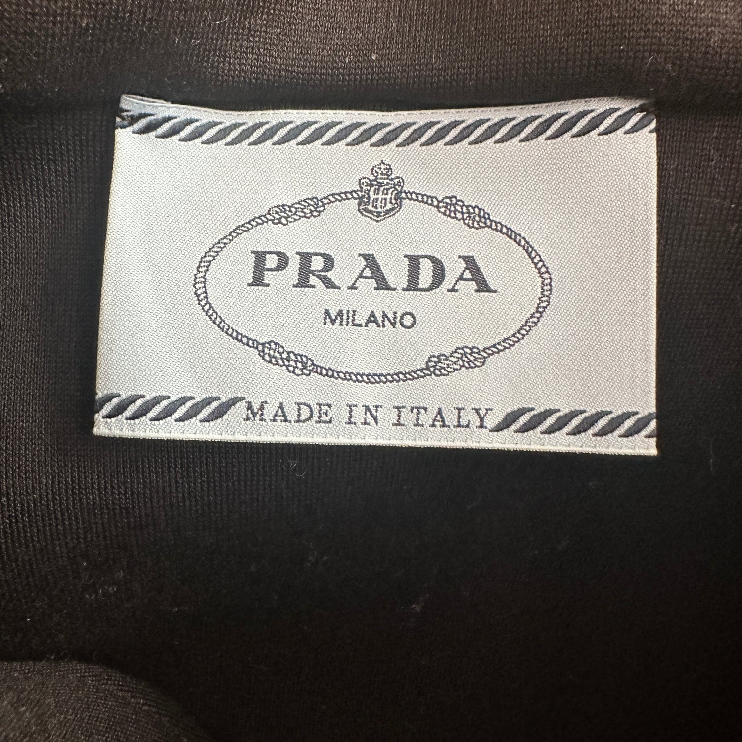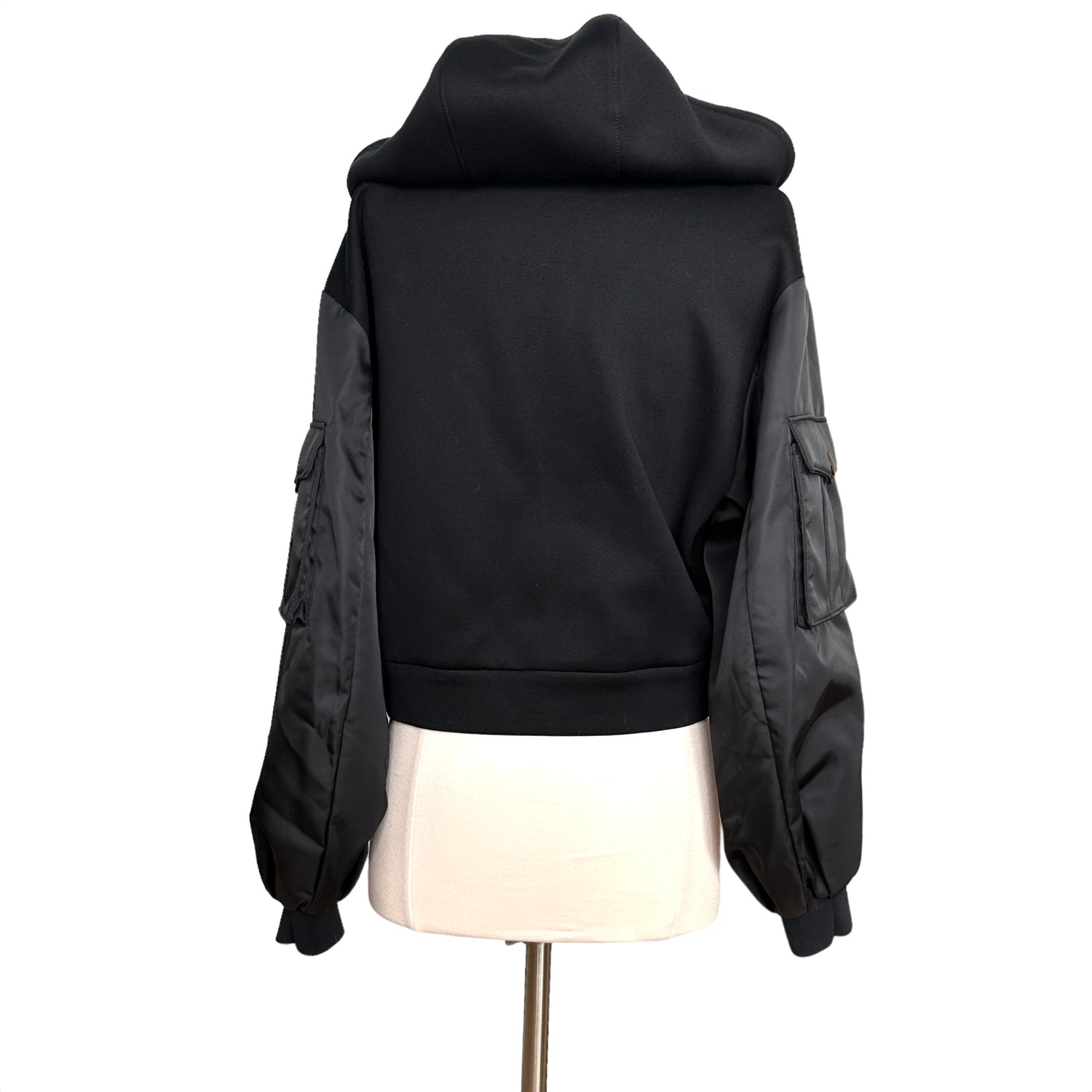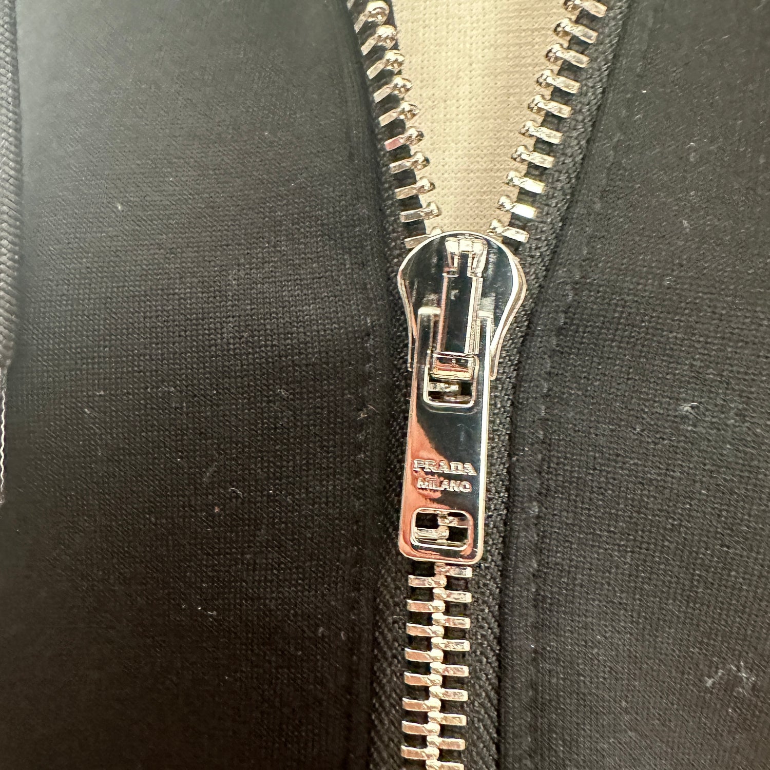 Prada black sweater jacket. Hooded with nylon sleeves. Pockets at sleeves and front. Silver-tone logo zipper at front. Designer size small.