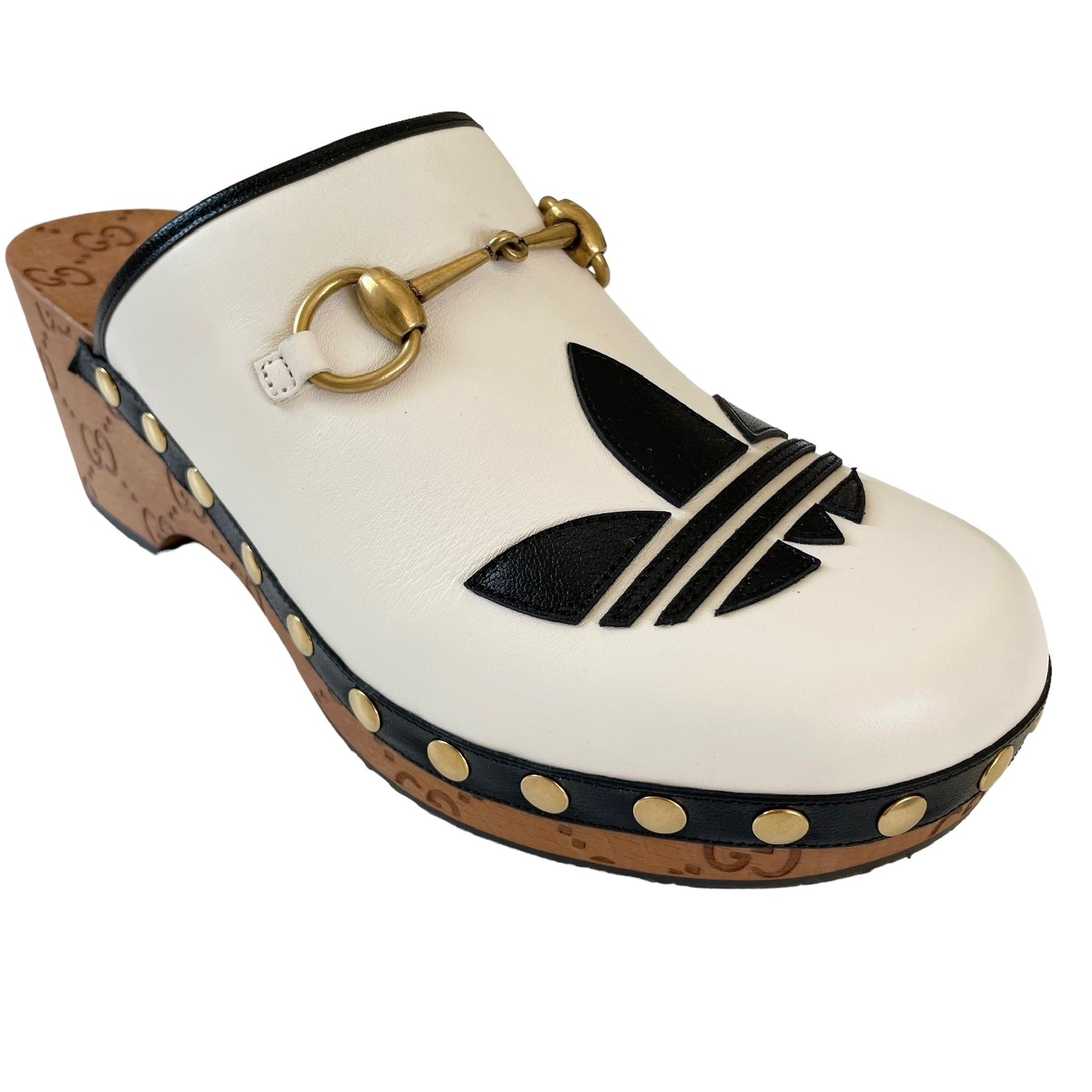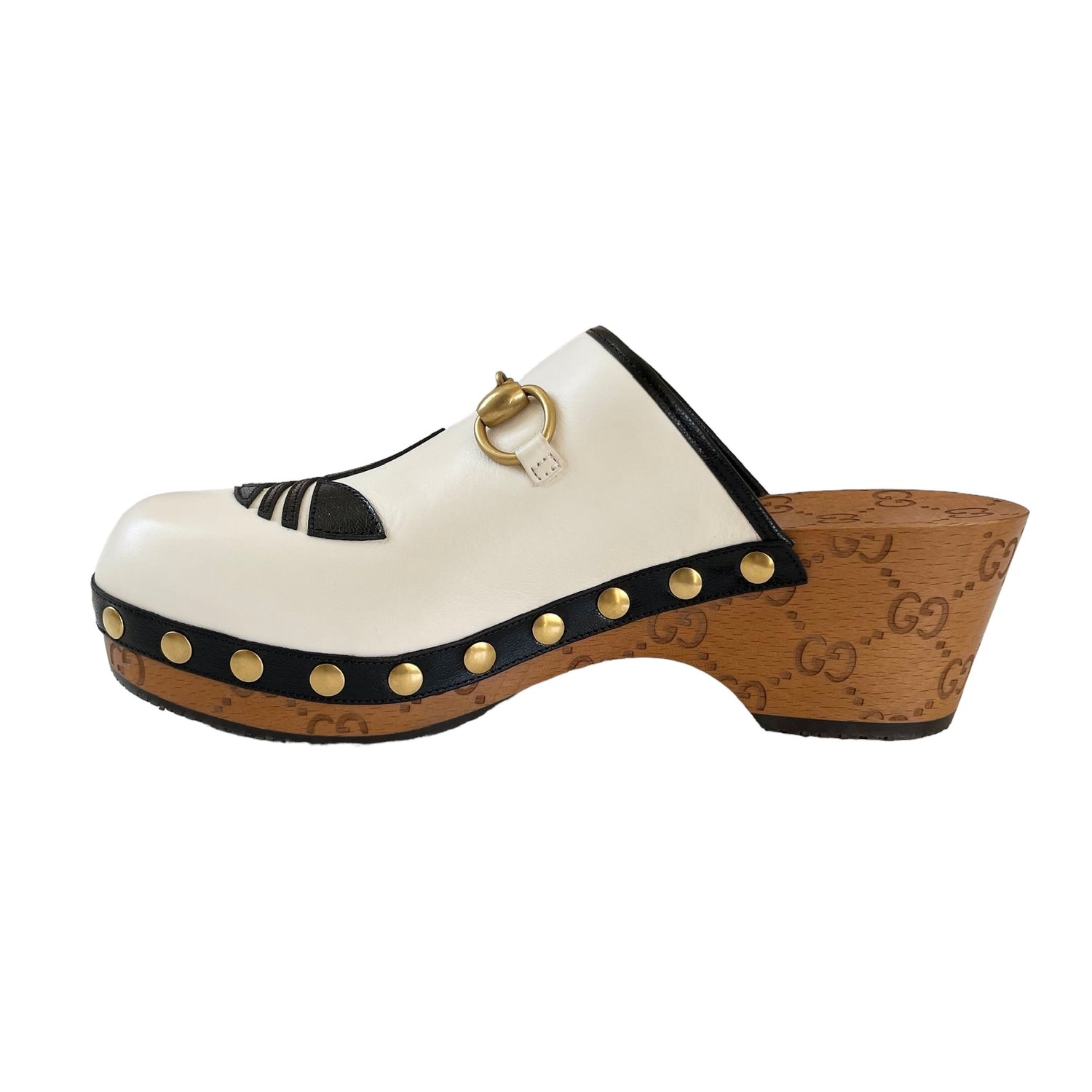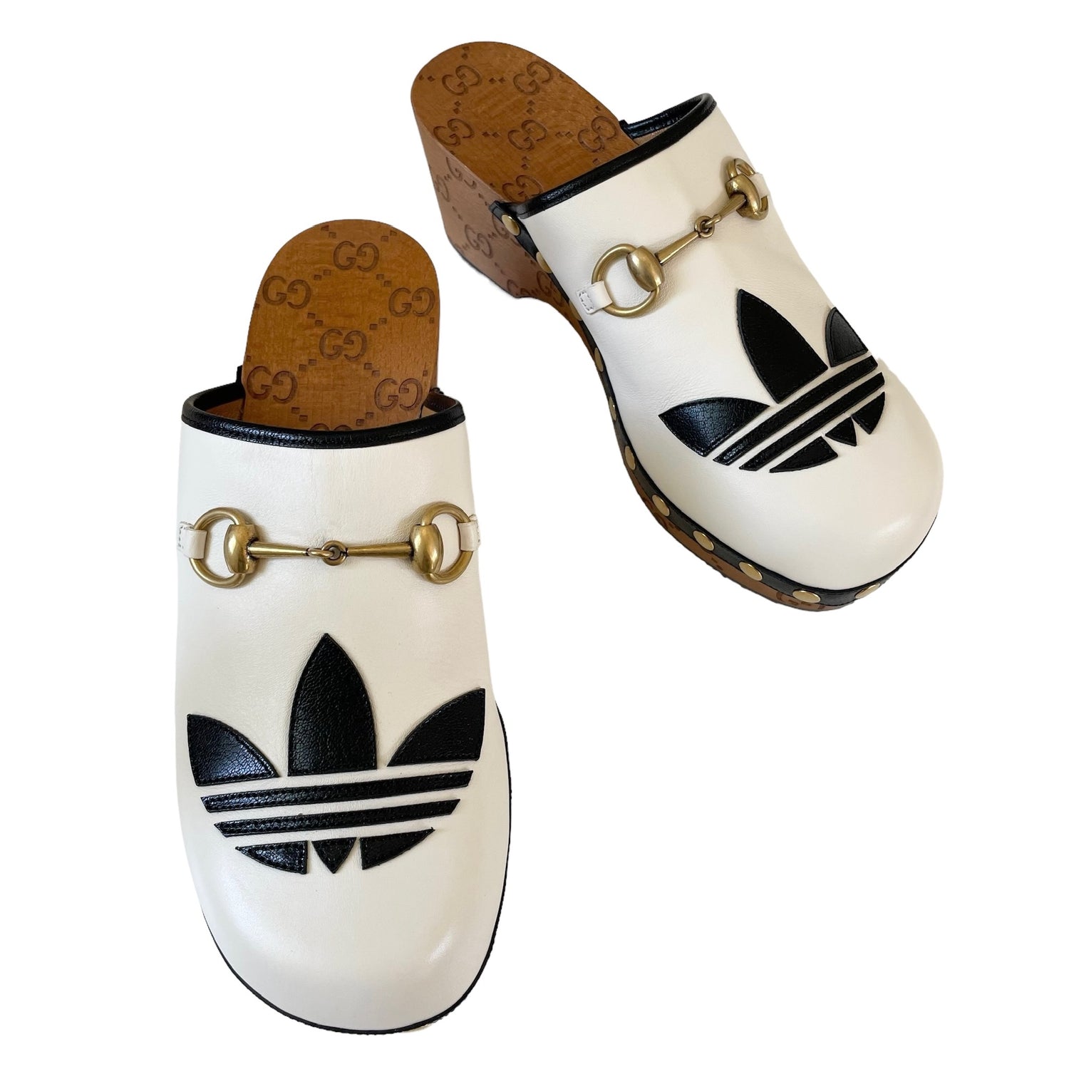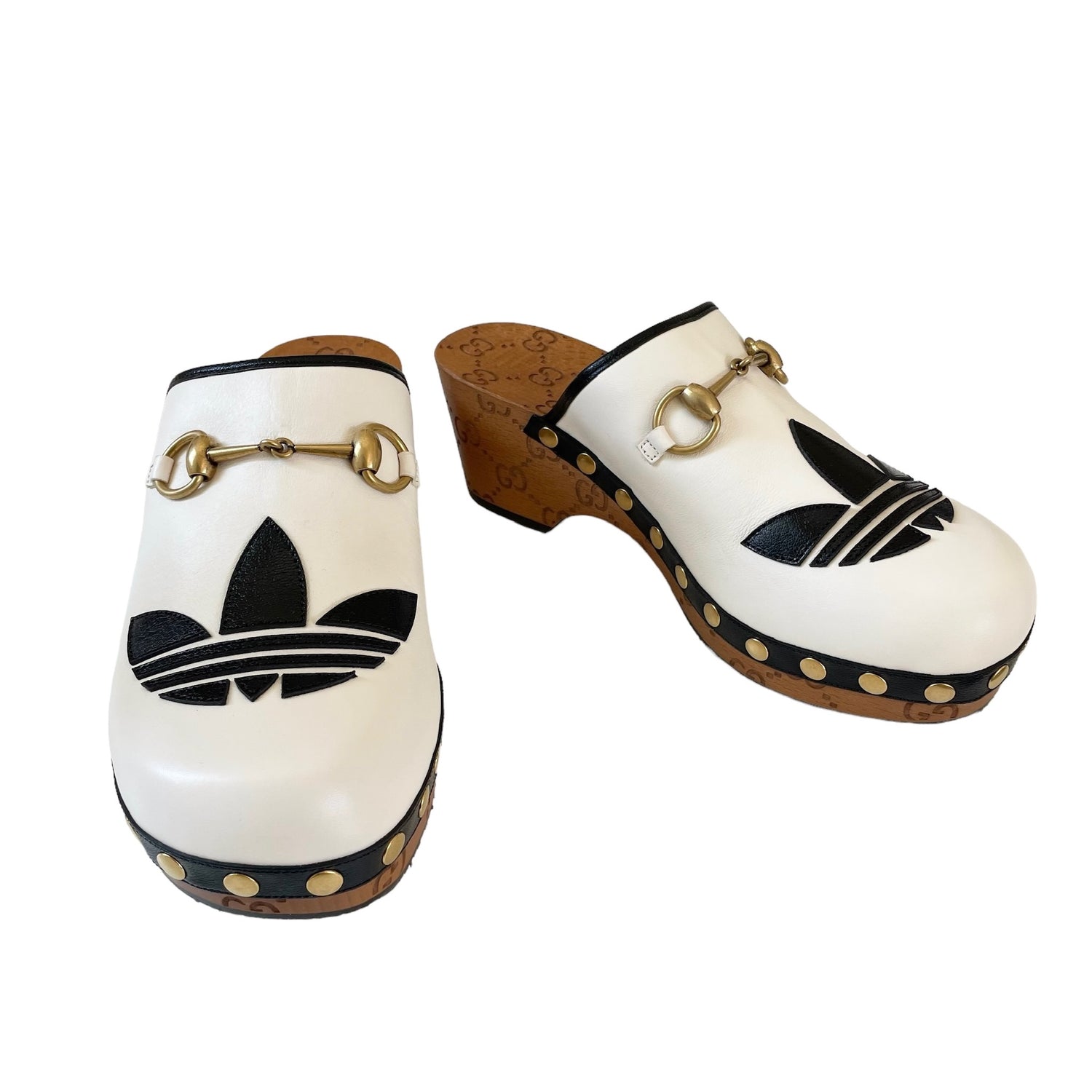 Gucci x Adidas white leather clogs with gold horsebit and studded accents, black leather trim. Adidas logo at toe, and GG monogram at heel and sole. Designer size 38.