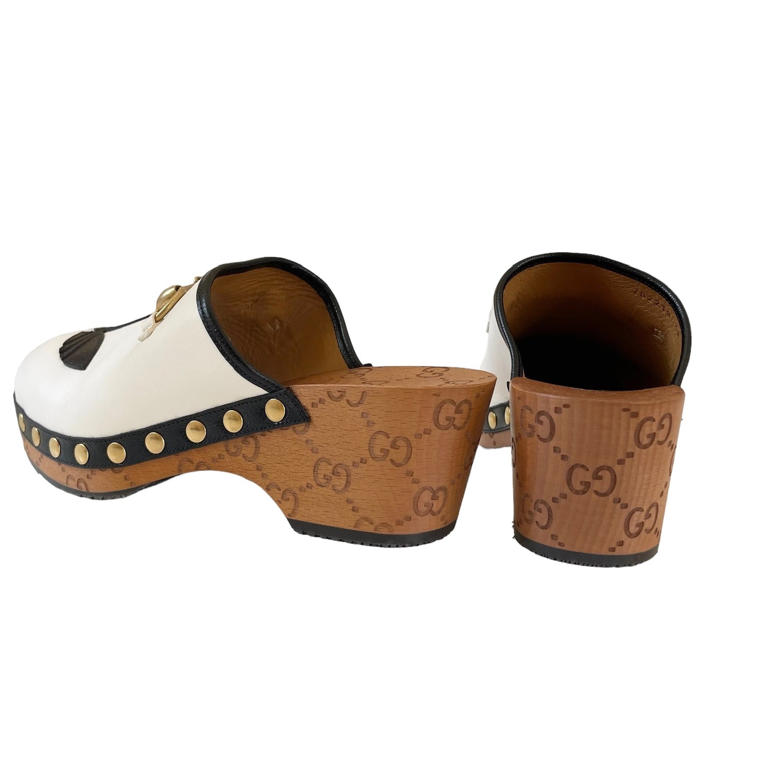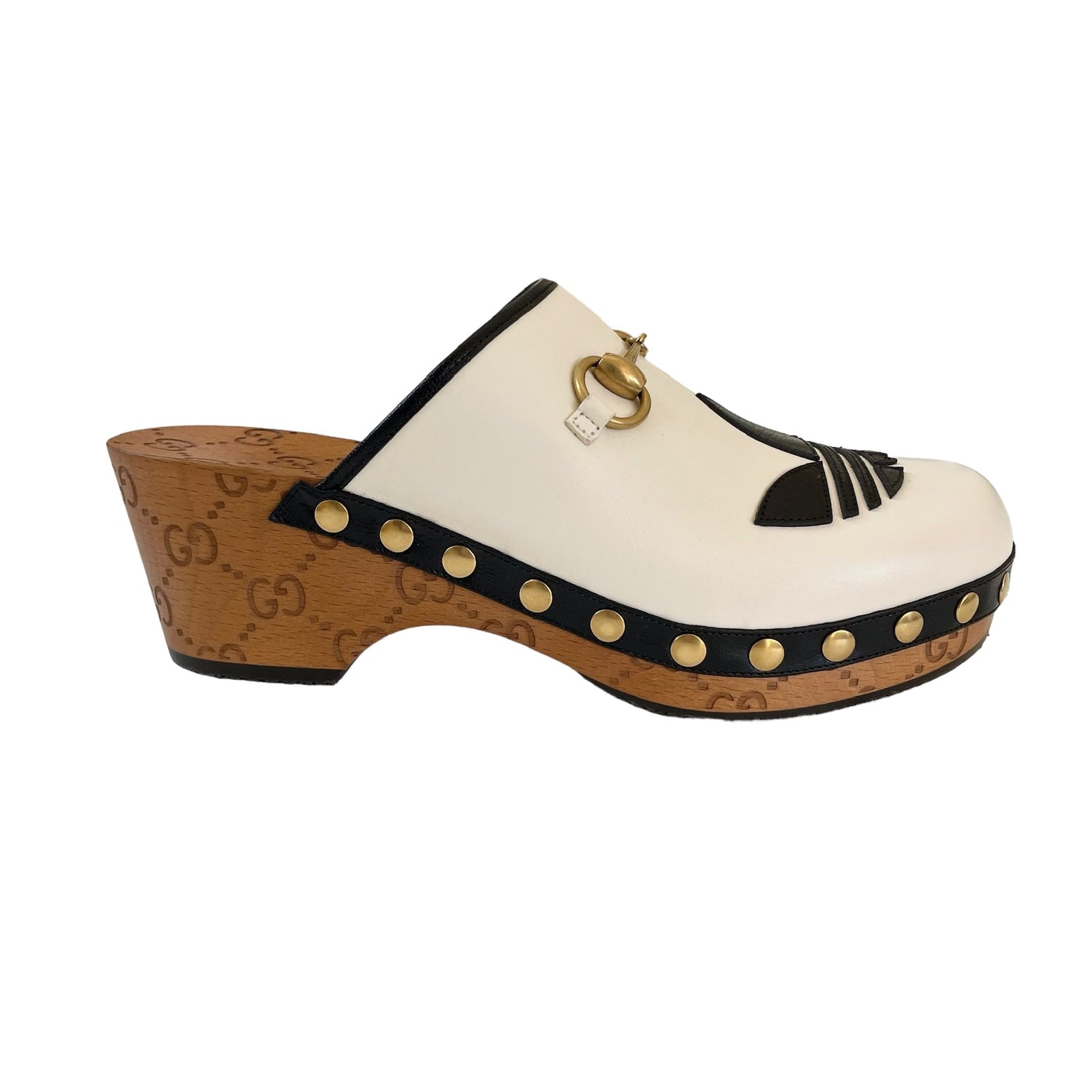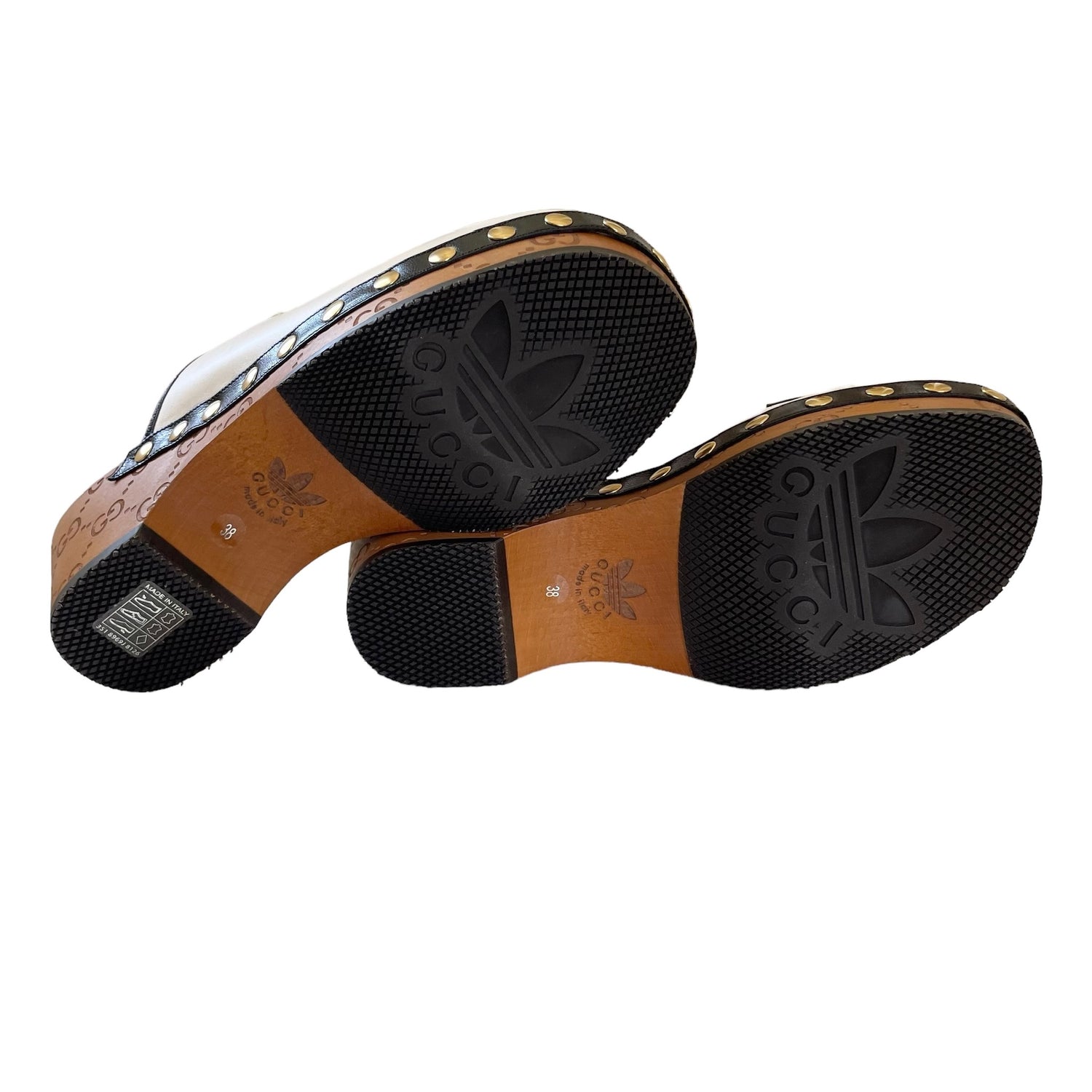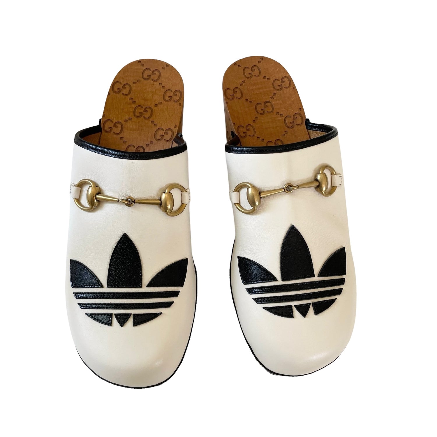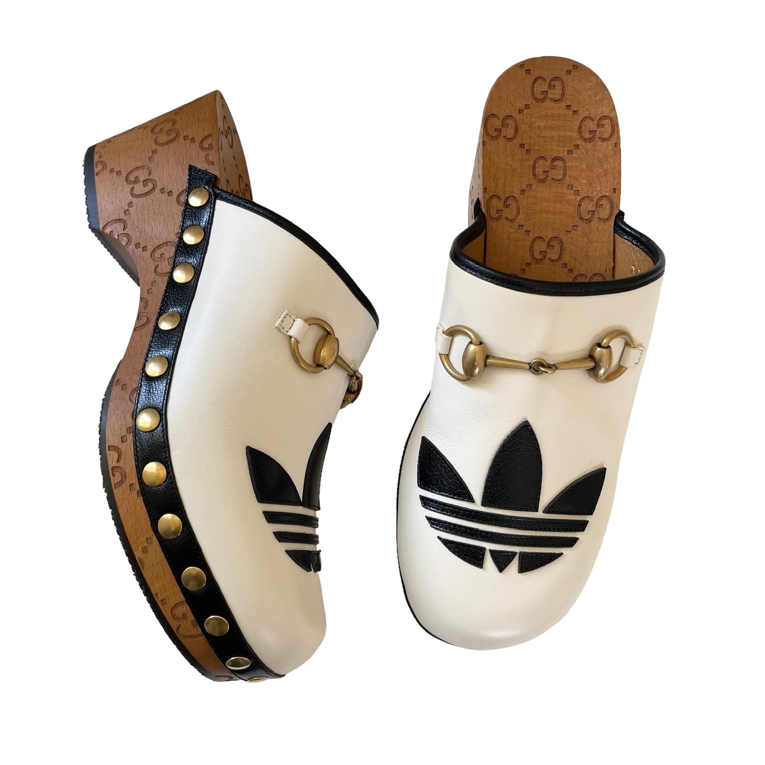 Gucci x Adidas white leather clogs with gold horsebit and studded accents, black leather trim. Adidas logo at toe, and GG monogram at heel and sole. Designer size 38.
