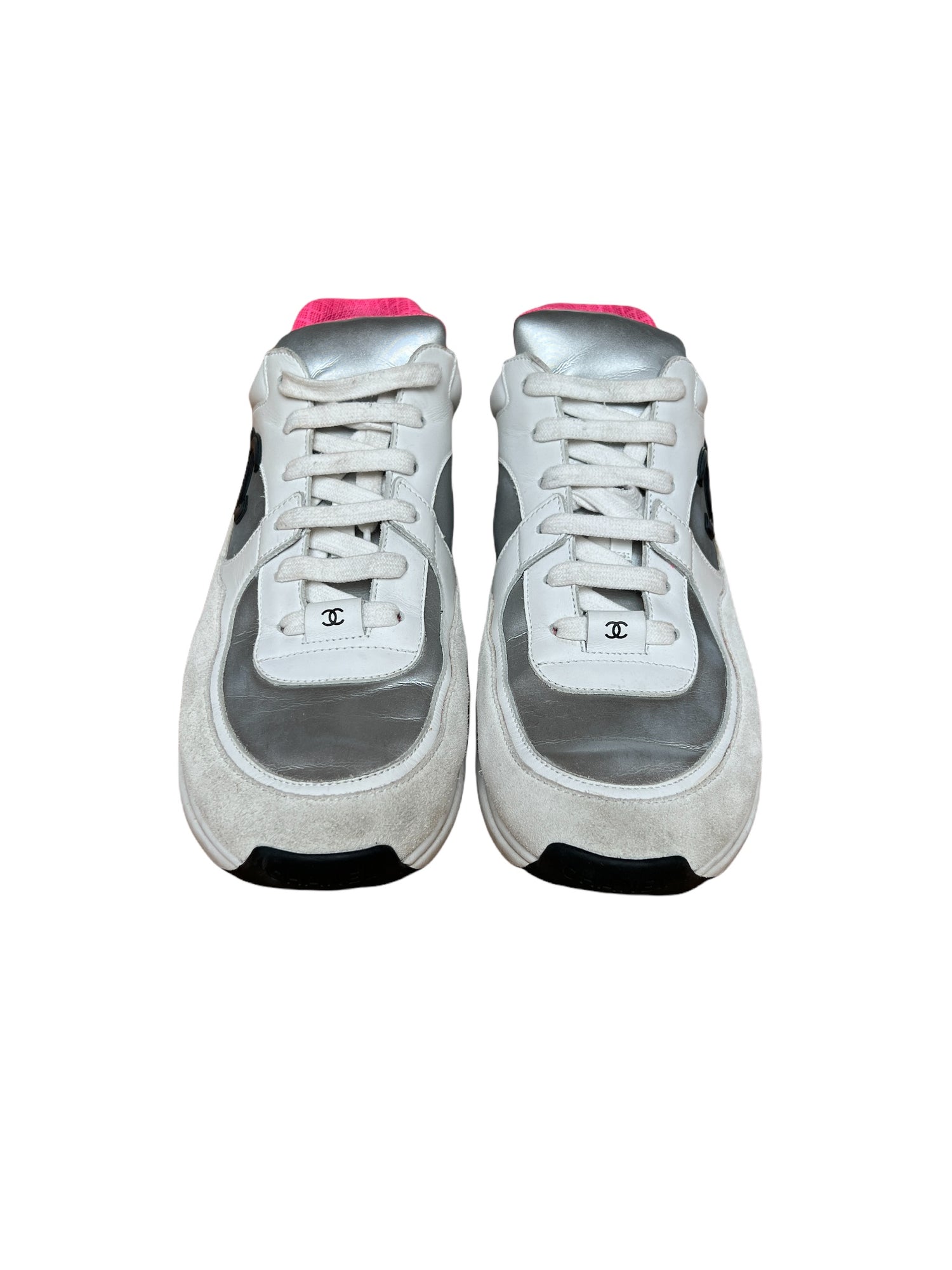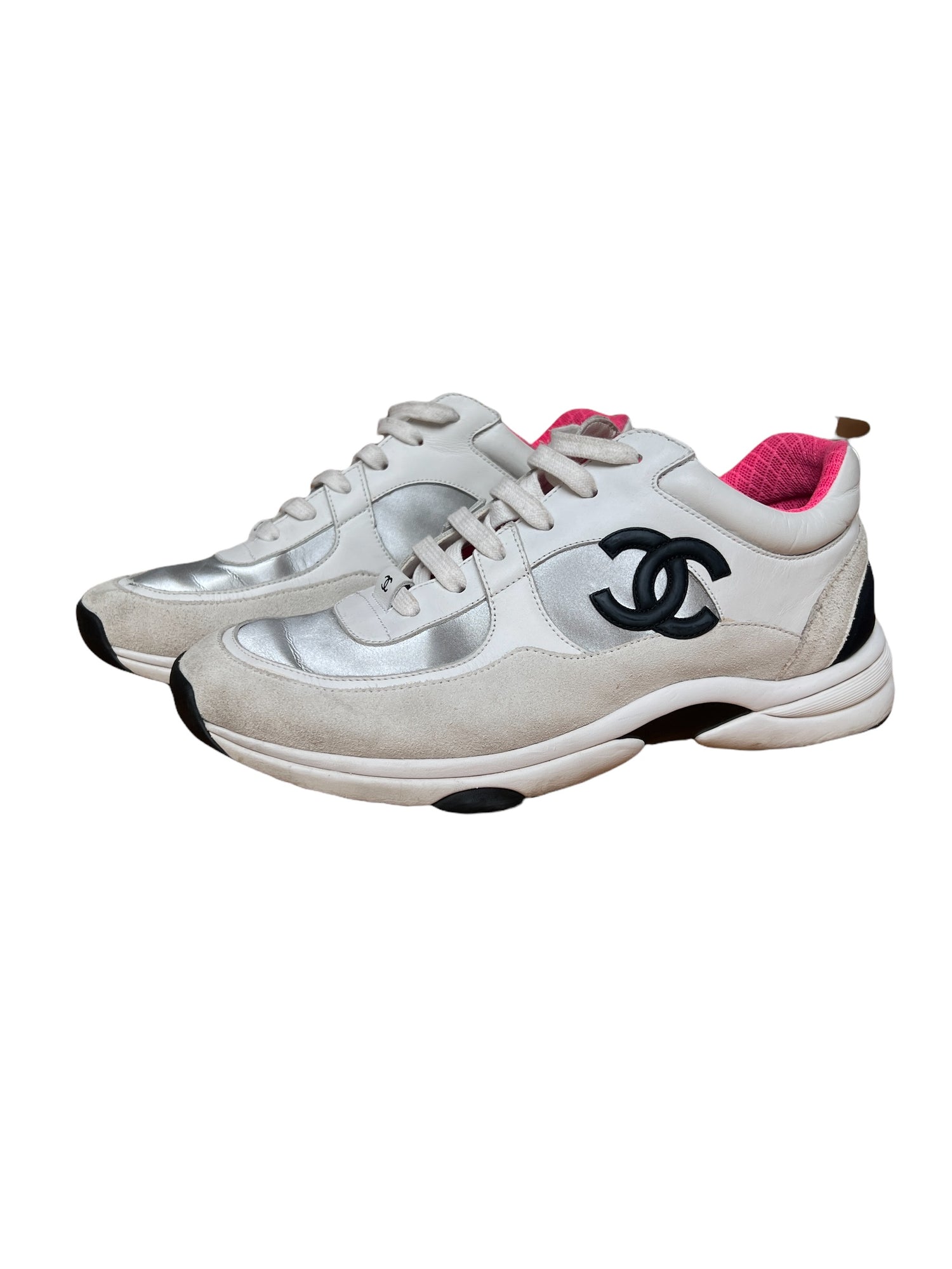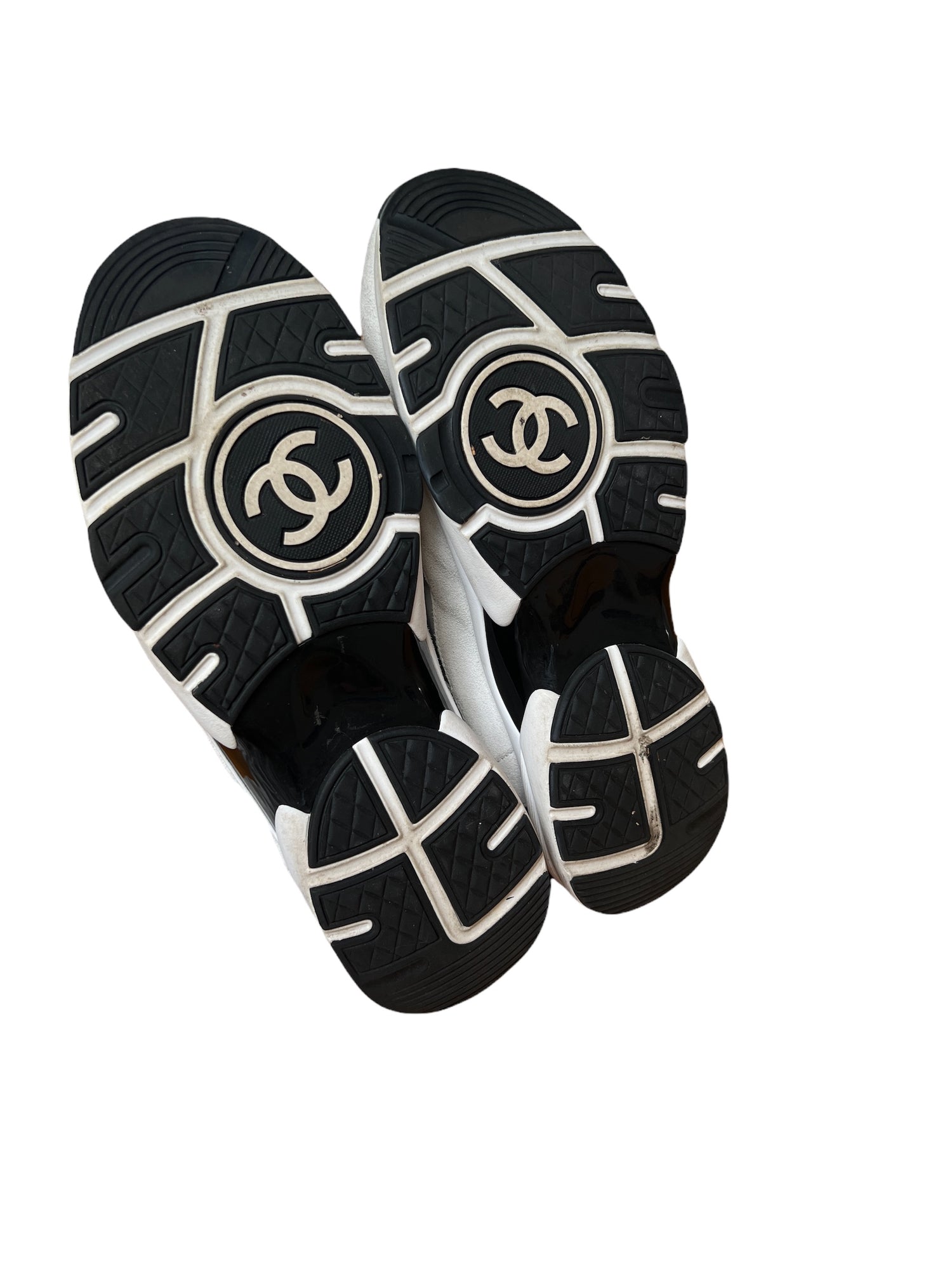 Details: Chanel Leather Low Top Sneakers, White & Black, Interlocking CC Logo, Suede Trim, Round-Toes, Lace-Up Closure at Uppers