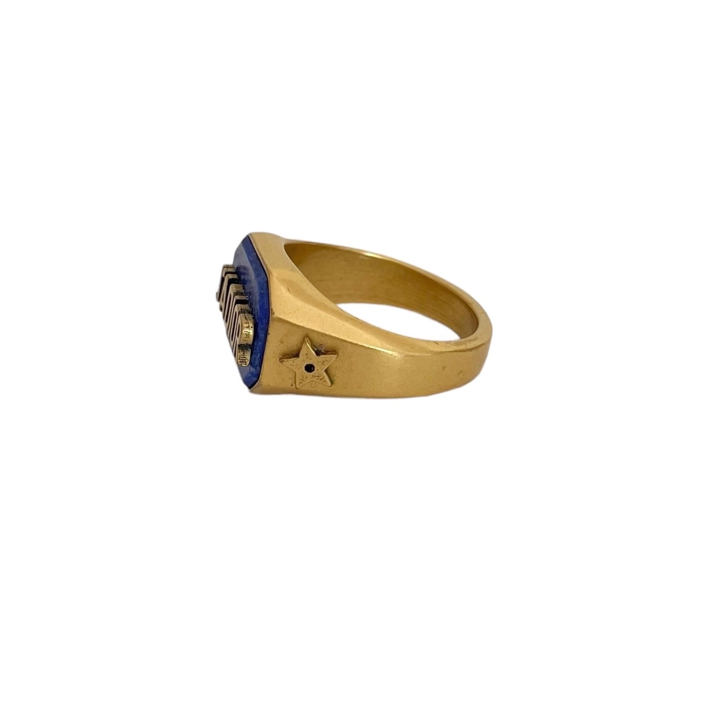 Christian Dior lapis ring. J'Adior logo in gold-tone metal on lapis. Star design at sides. Dior engraving at back. Designer size Large.