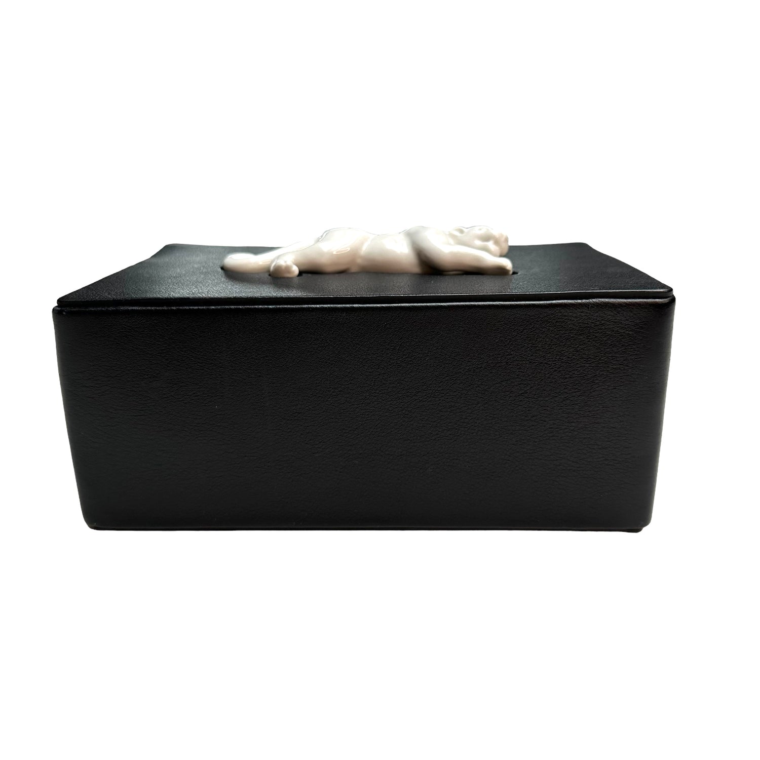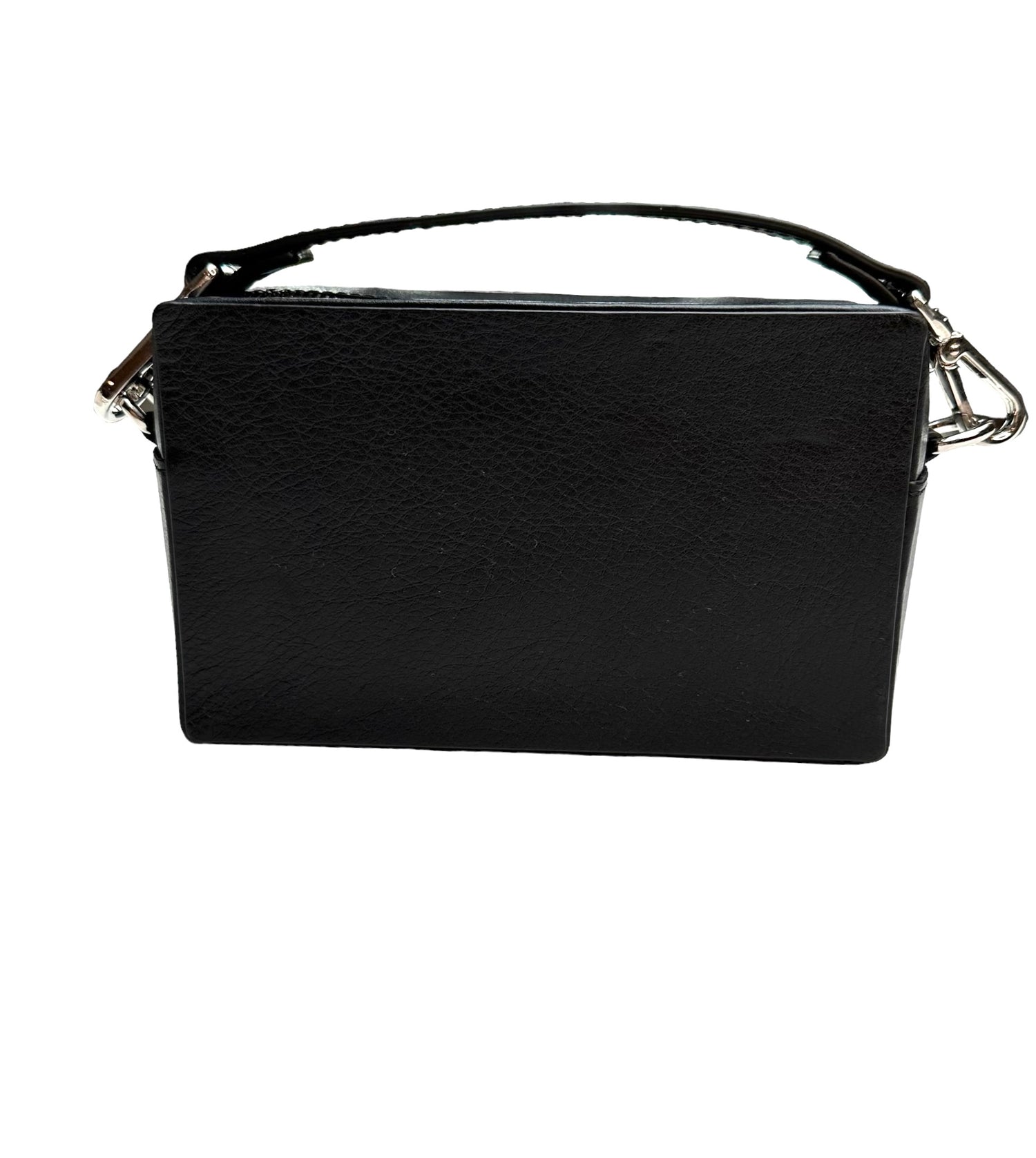Andres Gallardo vegan black leather structured bag. White jaguar embellishment. Leather handle at top. Removable leather strap. Zipper closure at top. Cotton lining.