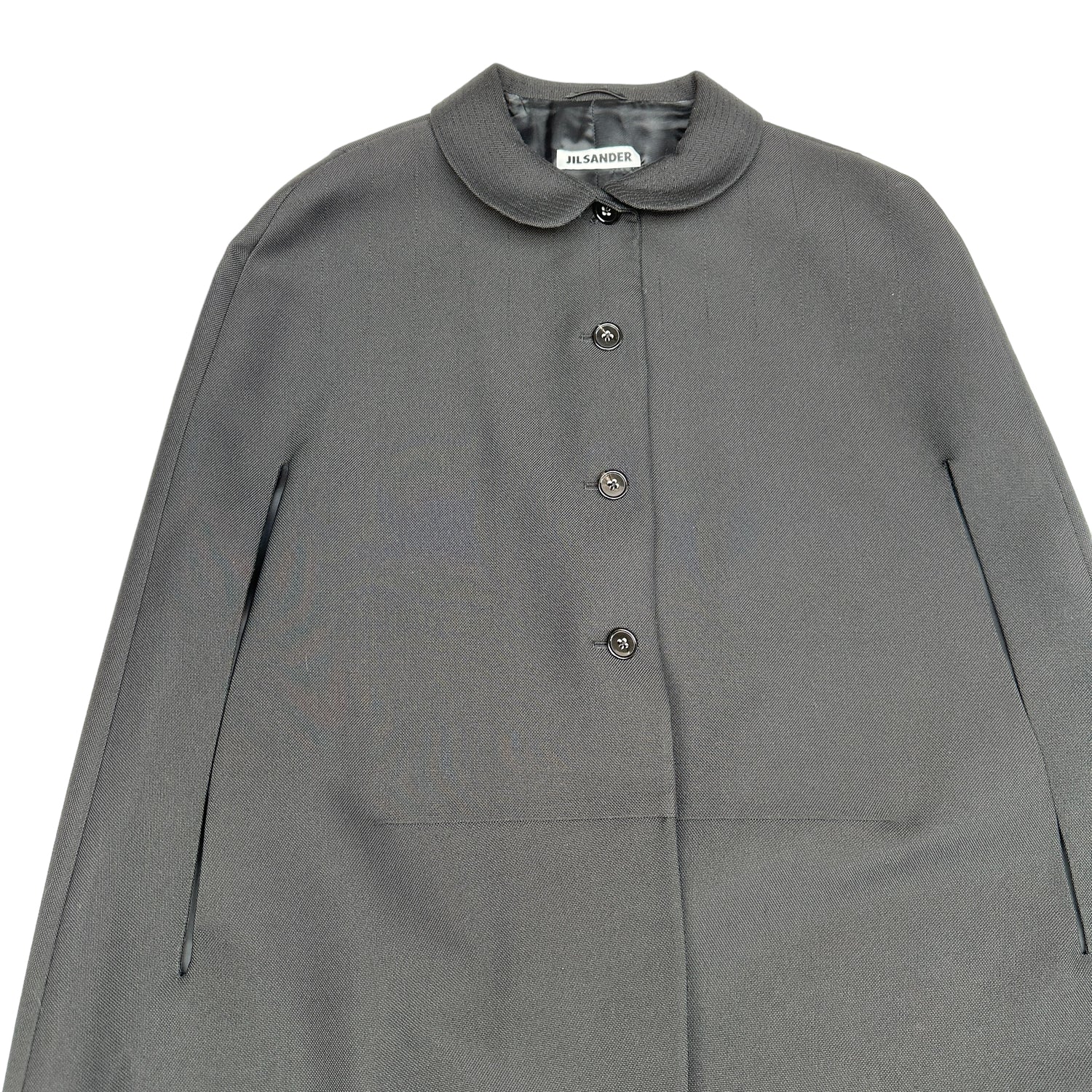 Jil Sander black cape coat. Button closure at front. Round collar. Two slits for arms. Designer size 38.