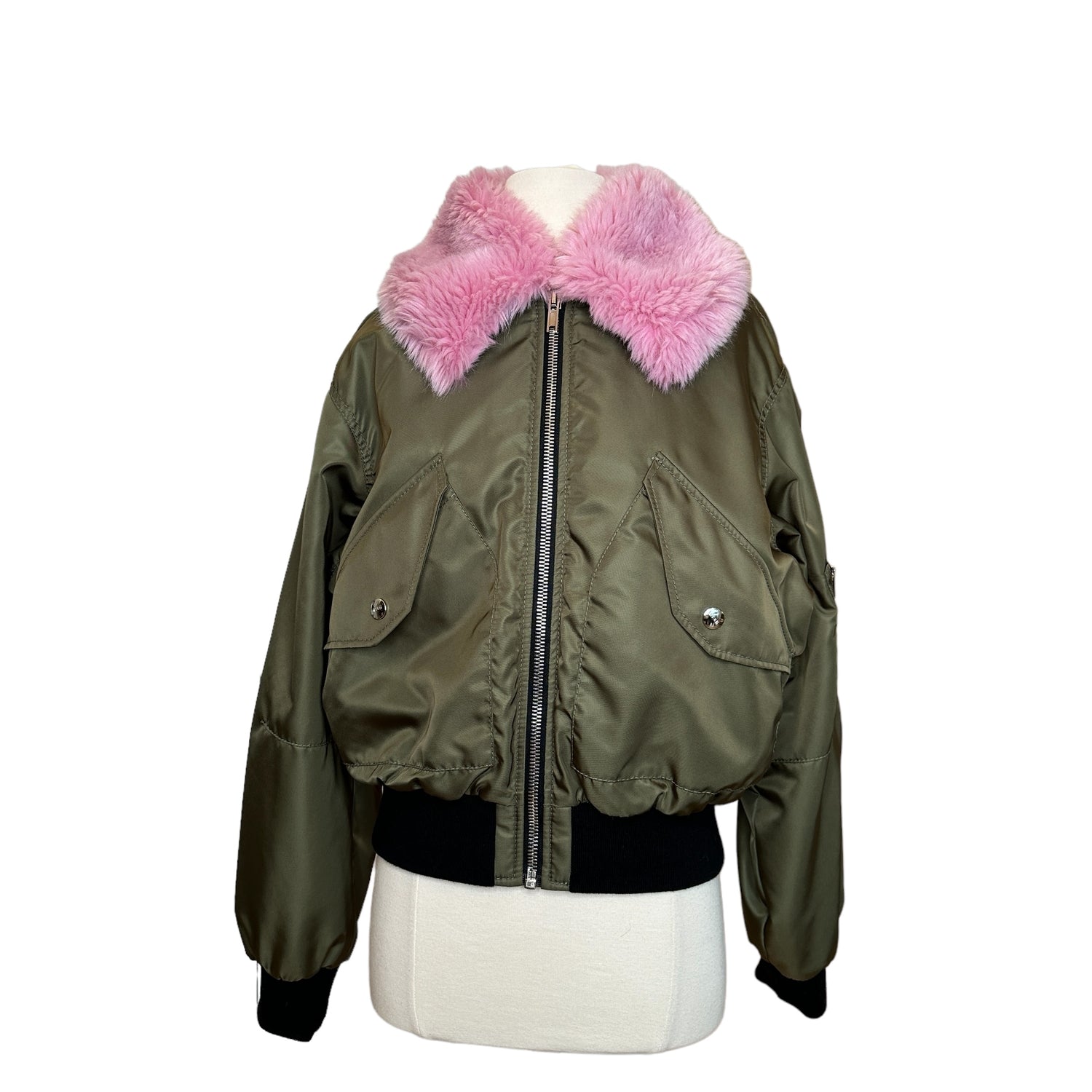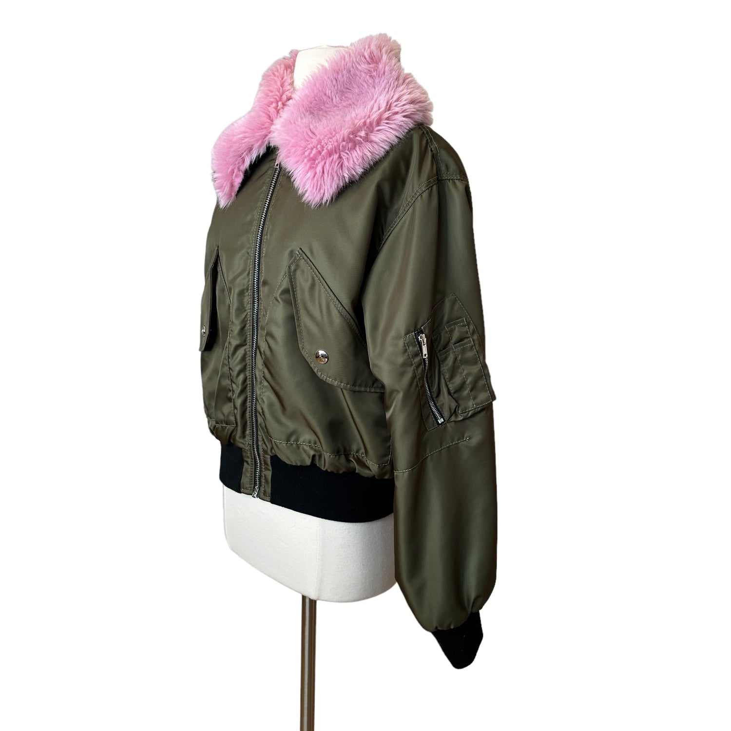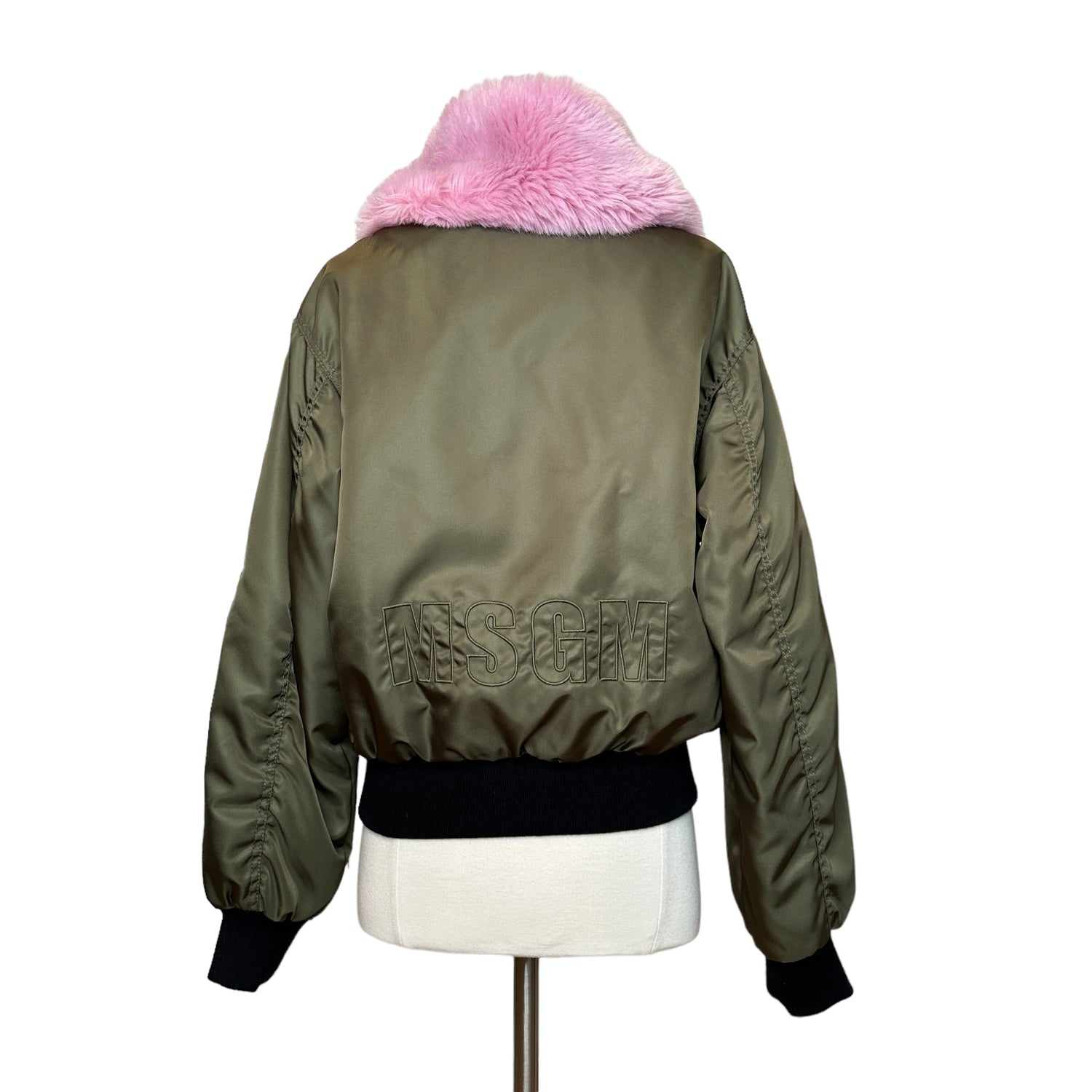 MSGM kaki bomber jacket. Pink removable faux-fur collar. Logo at back. Large snap flap pockets. One zipper pocket at sleeve. Zipper closure at front. Designer size