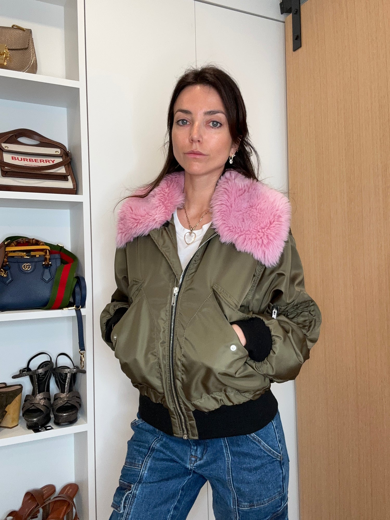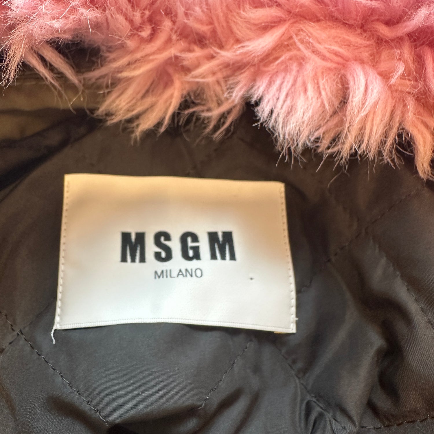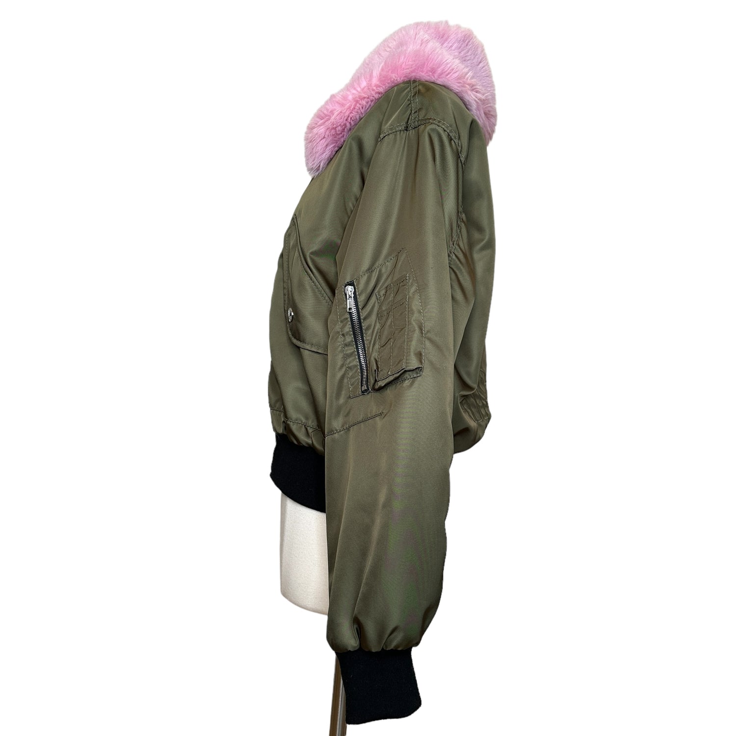 MSGM kaki bomber jacket. Pink removable faux-fur collar. Logo at back. Large snap flap pockets. One zipper pocket at sleeve. Zipper closure at front. Designer size