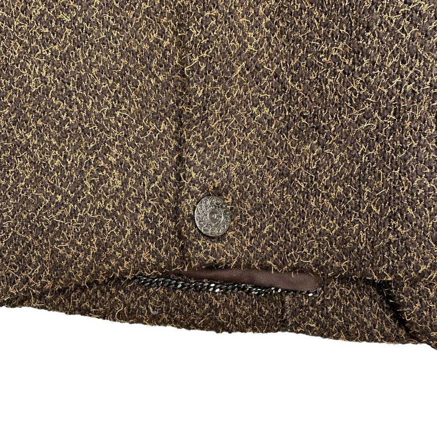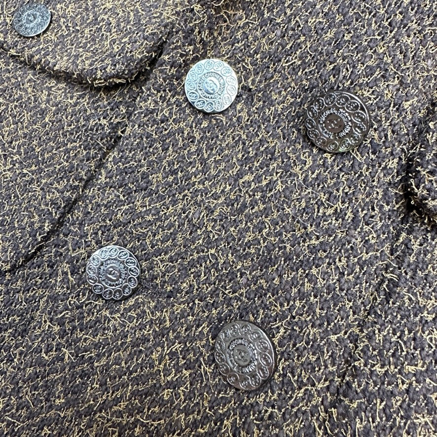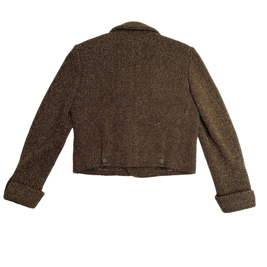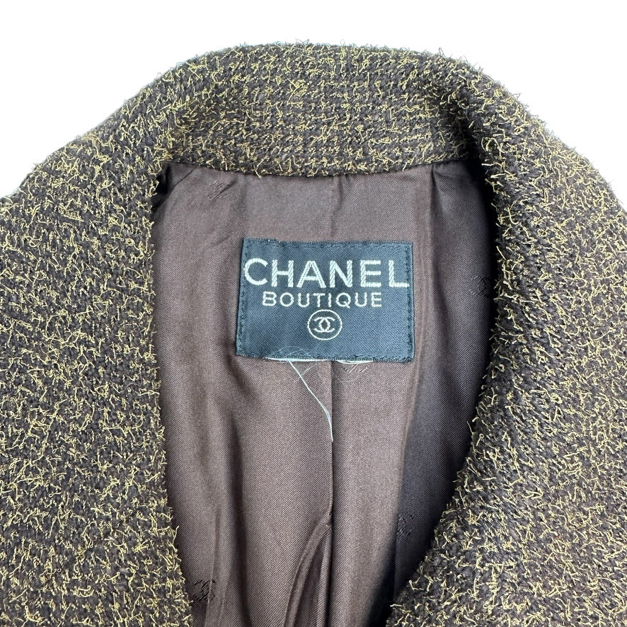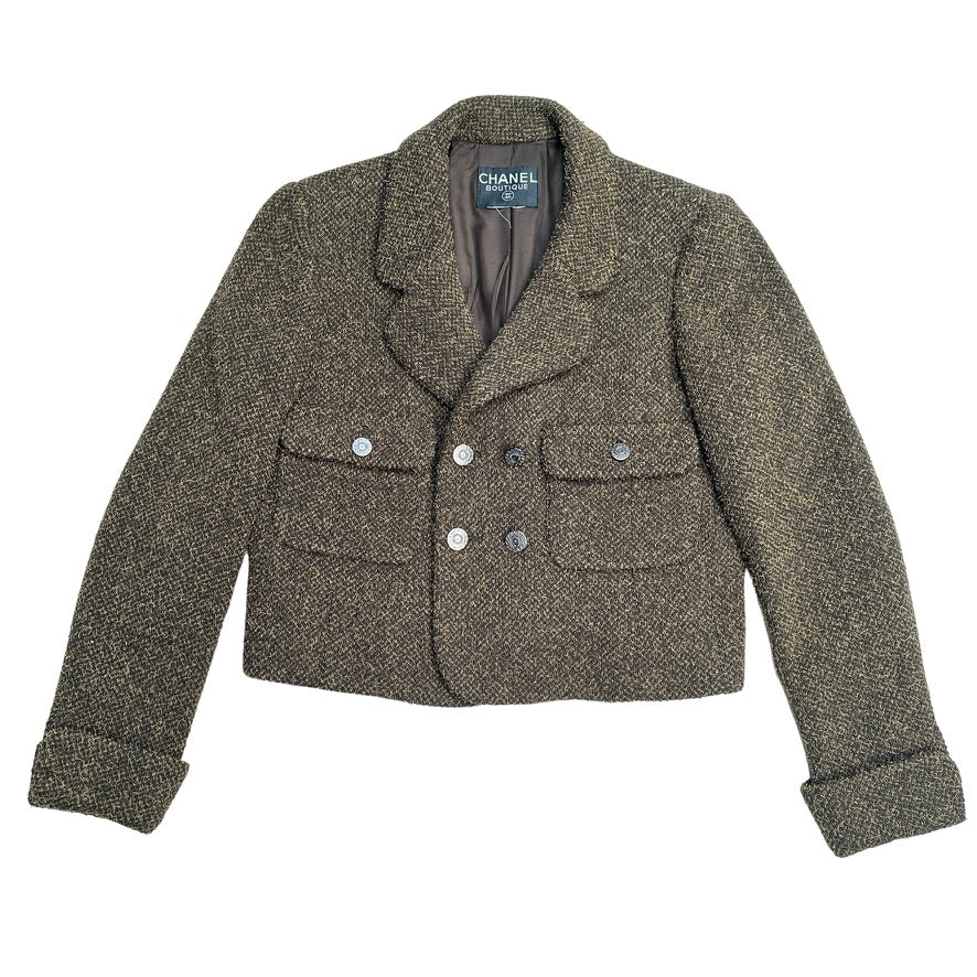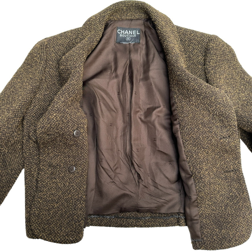 Chanel vintage blazer. From the Fall 1997 collection by Karl Lagerfeld. Kaki brown color. Pointed collar. Interlocking CC logo at buttons. Buttons closure at front. This jacket has a boxy modern look to it. Iconic chain-link accent at silk lining. Flap pockets.