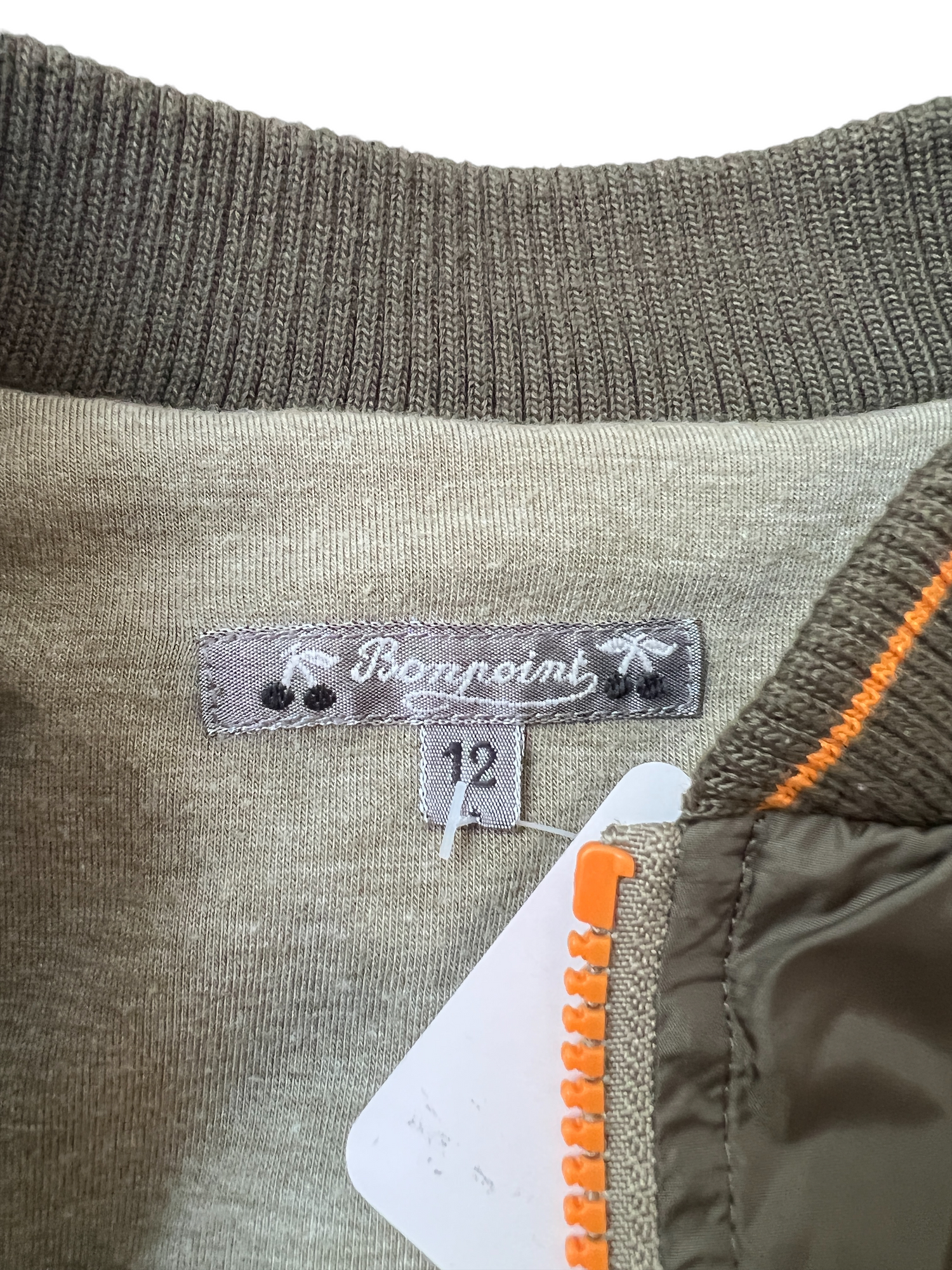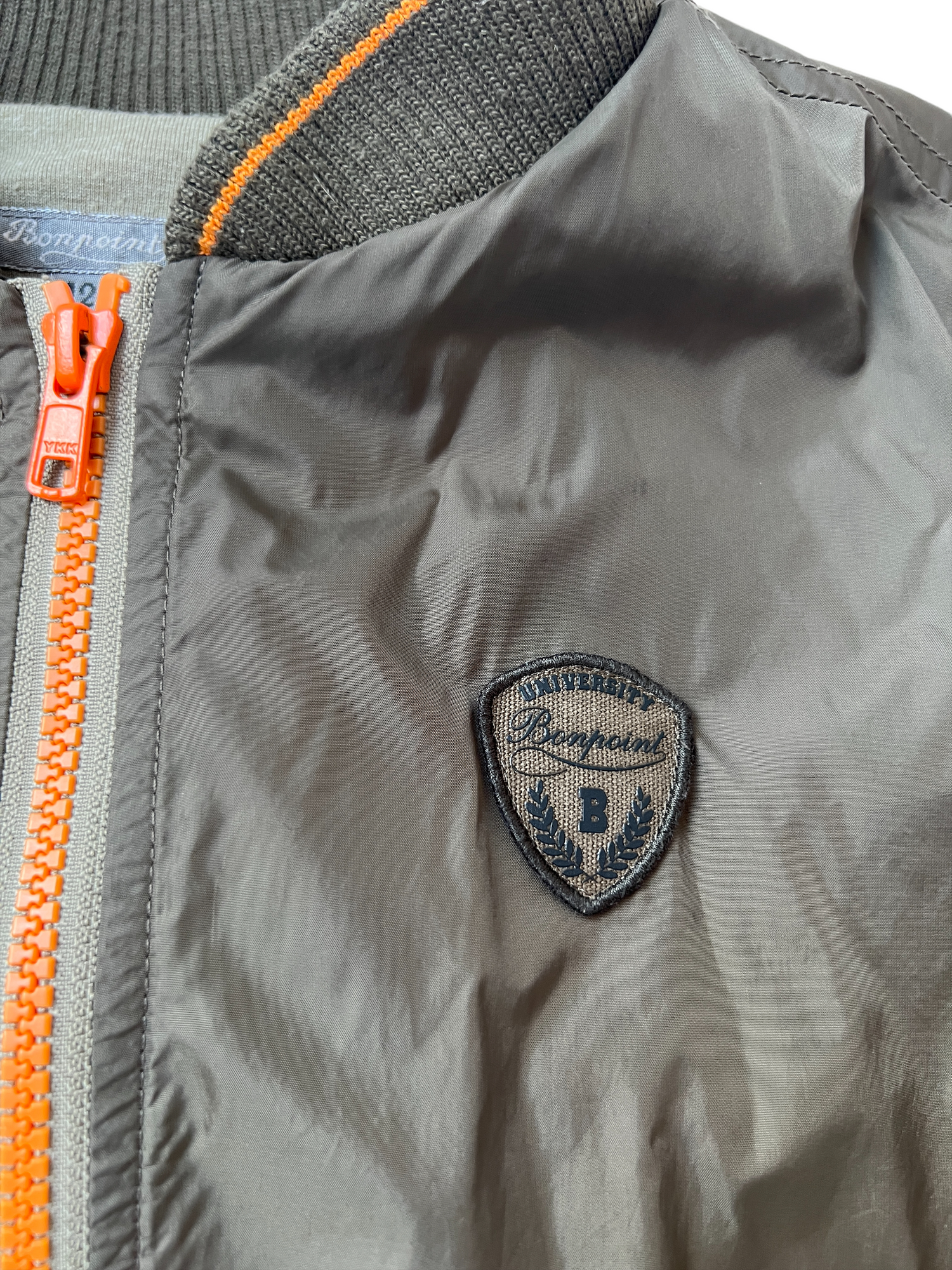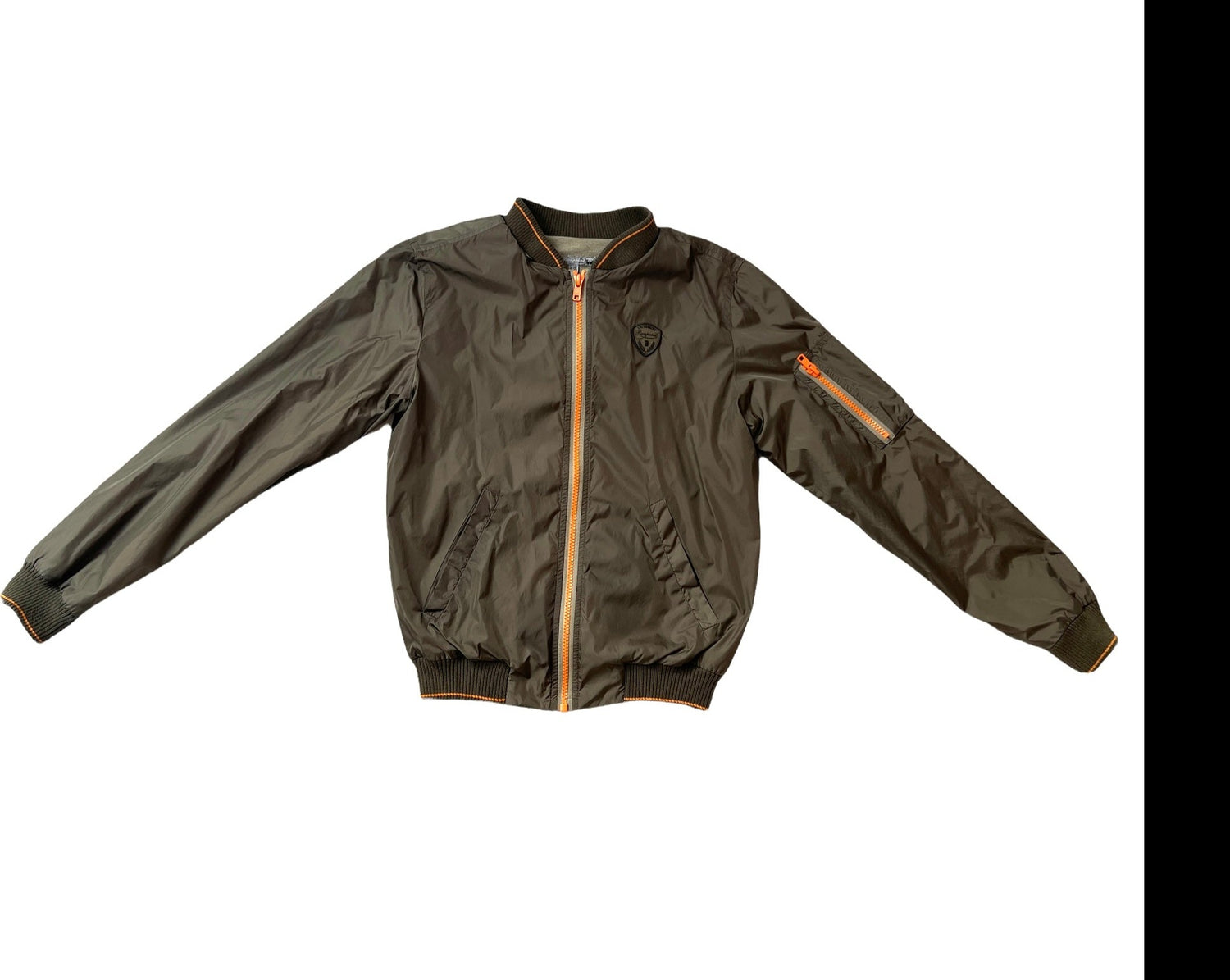 A classic yet trendy jacket for boys in size 12 from Bonpoint. Kaki and orange color at zippers. One pocket at left arm and two side pockets.