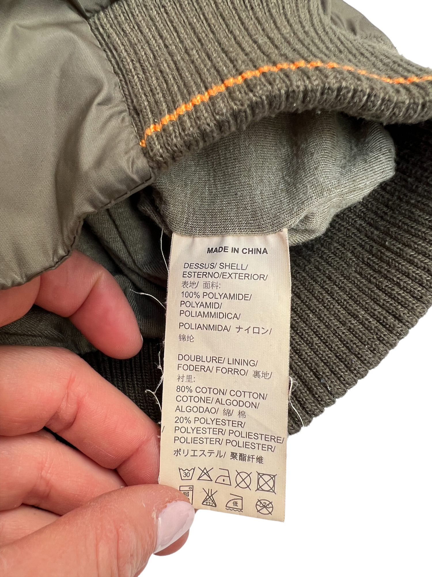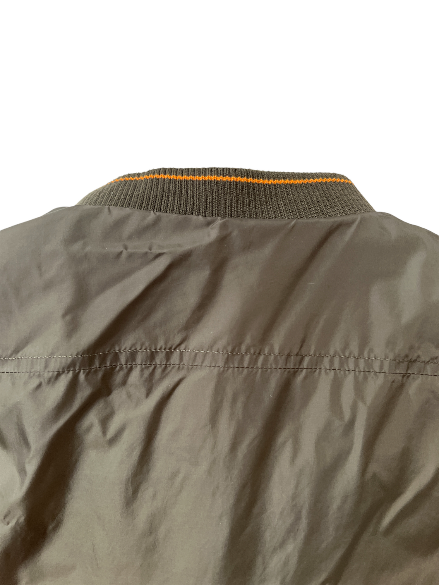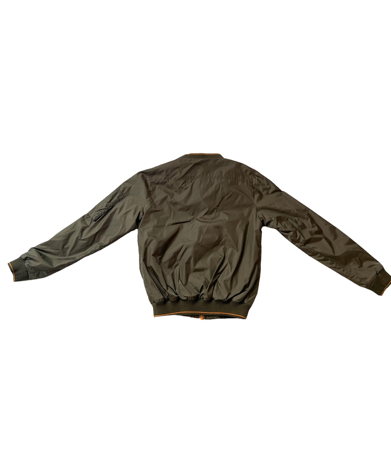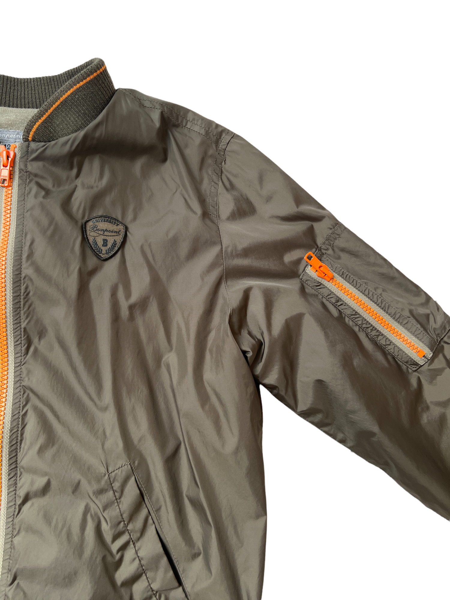 A classic yet trendy jacket for boys in size 12 from Bonpoint. Kaki and orange color at zippers. One pocket at left arm and two side pockets.
