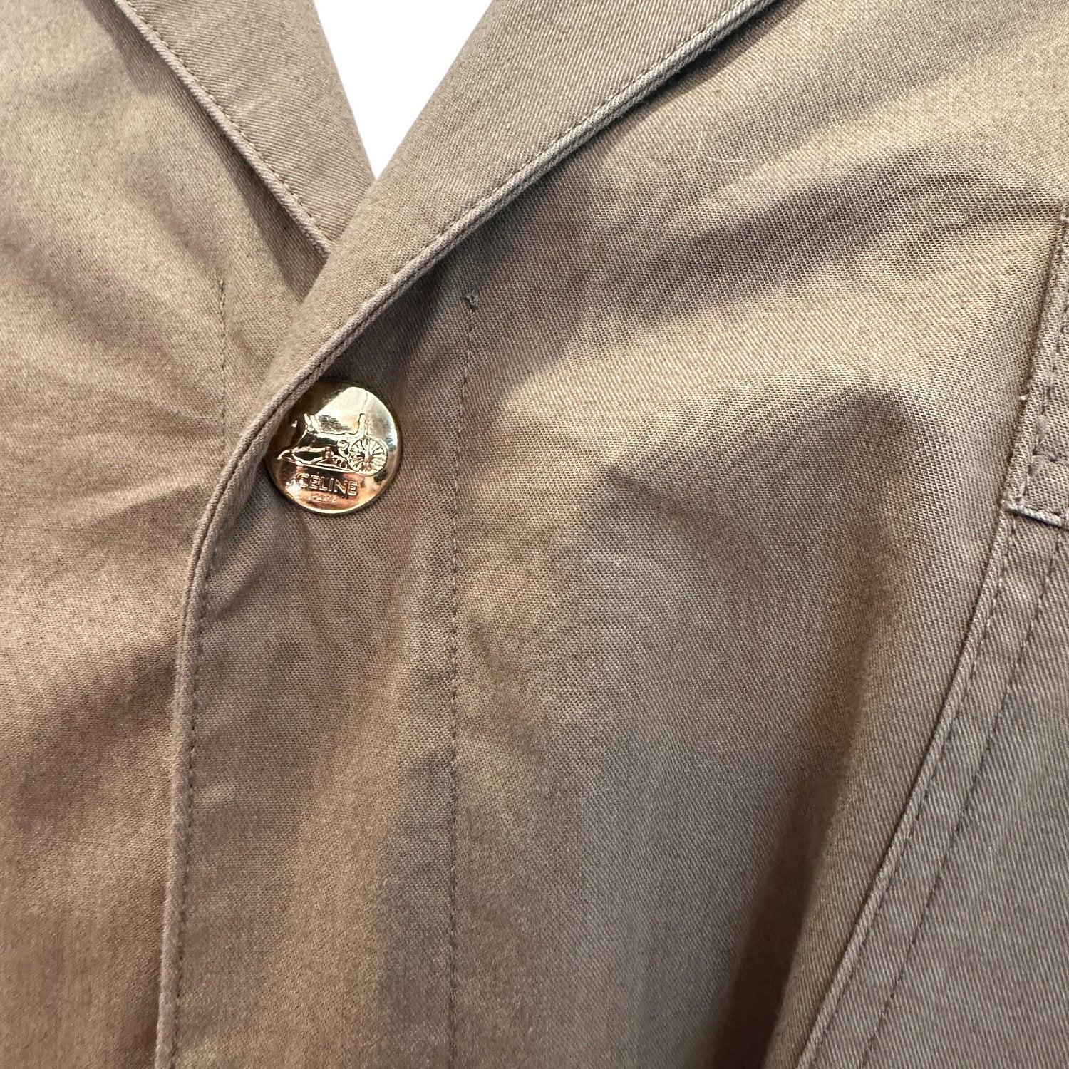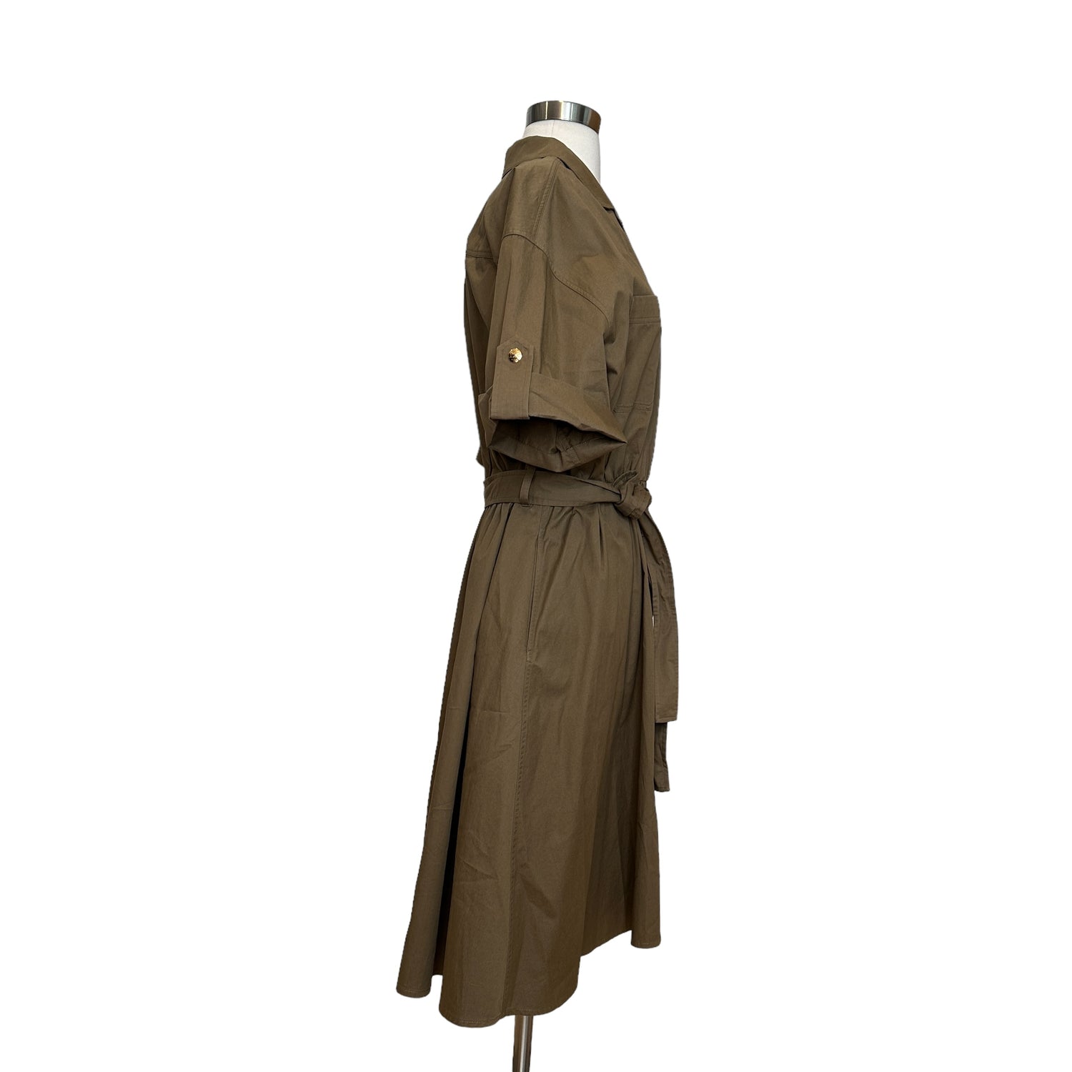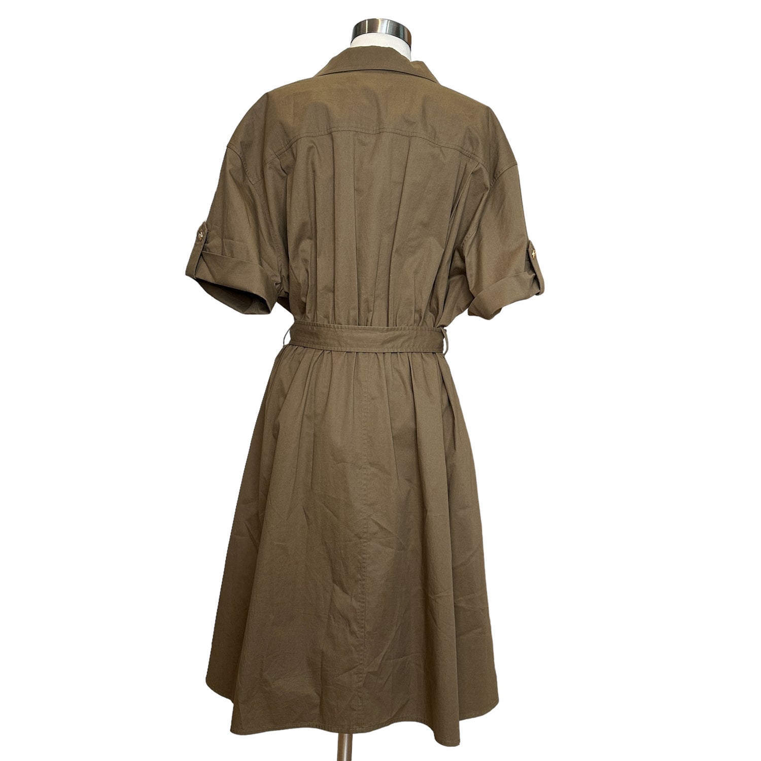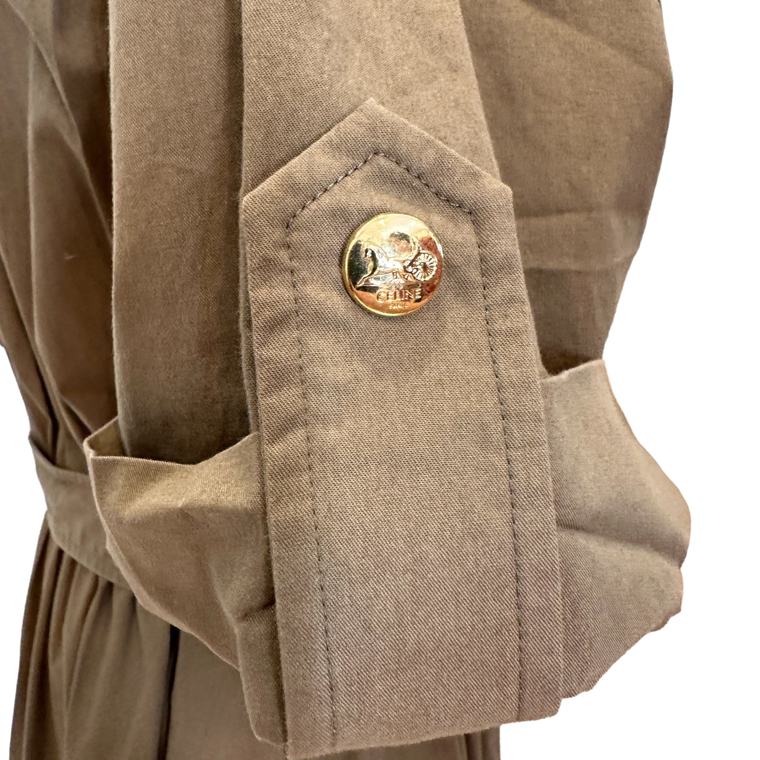 Celine kaki dress. Gold logo snap-on buttons. Short sleeve. Elasticized waist. Slit pockets. Designer size 44.