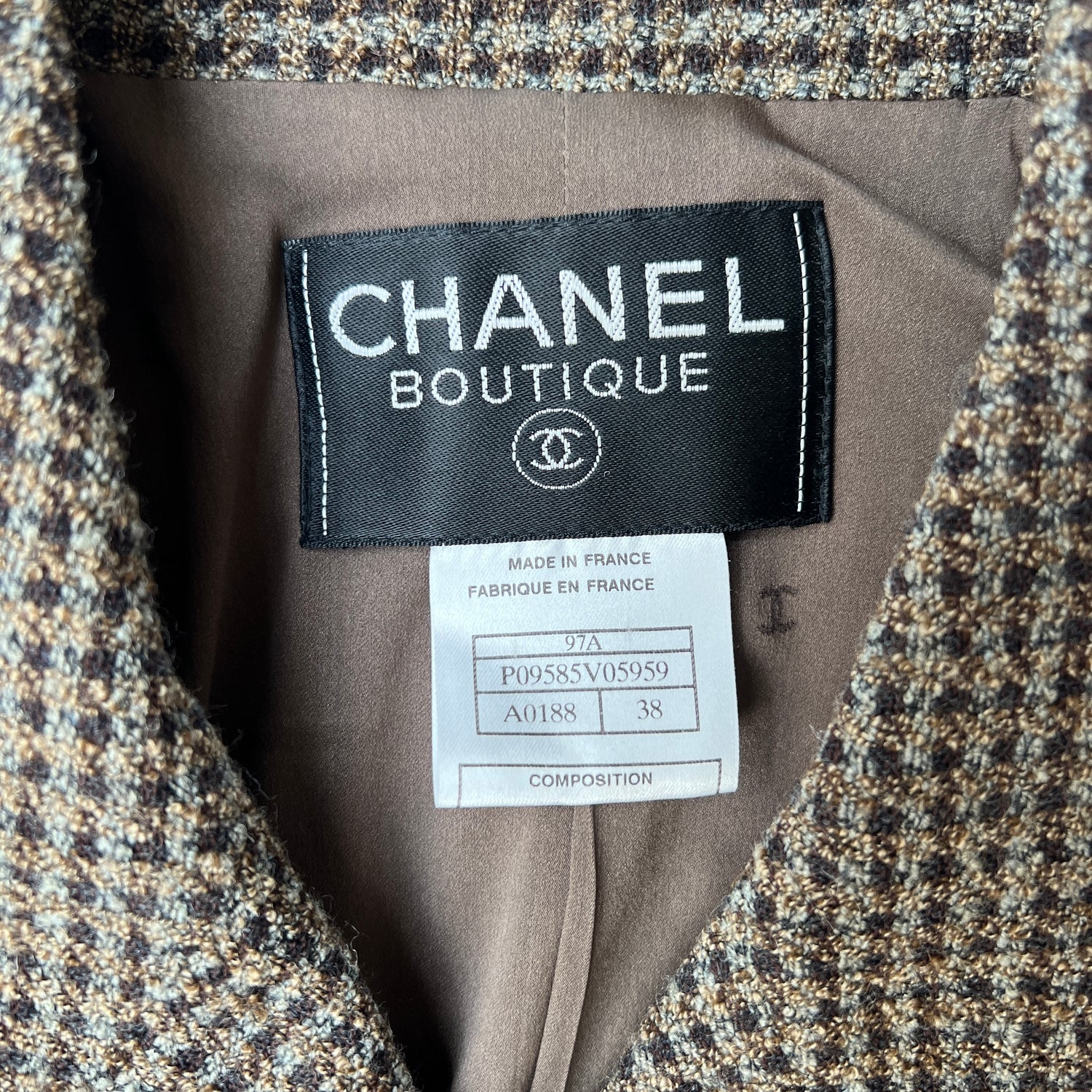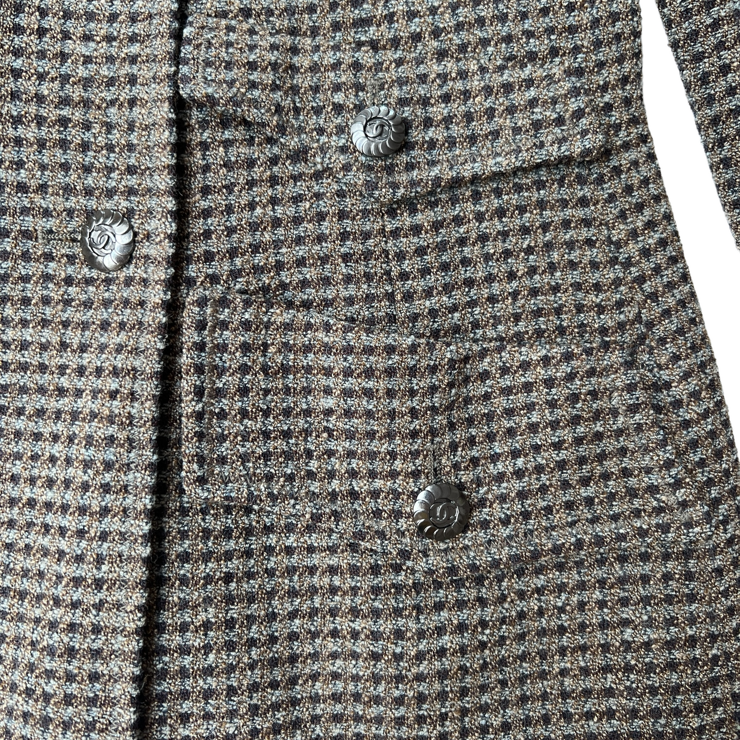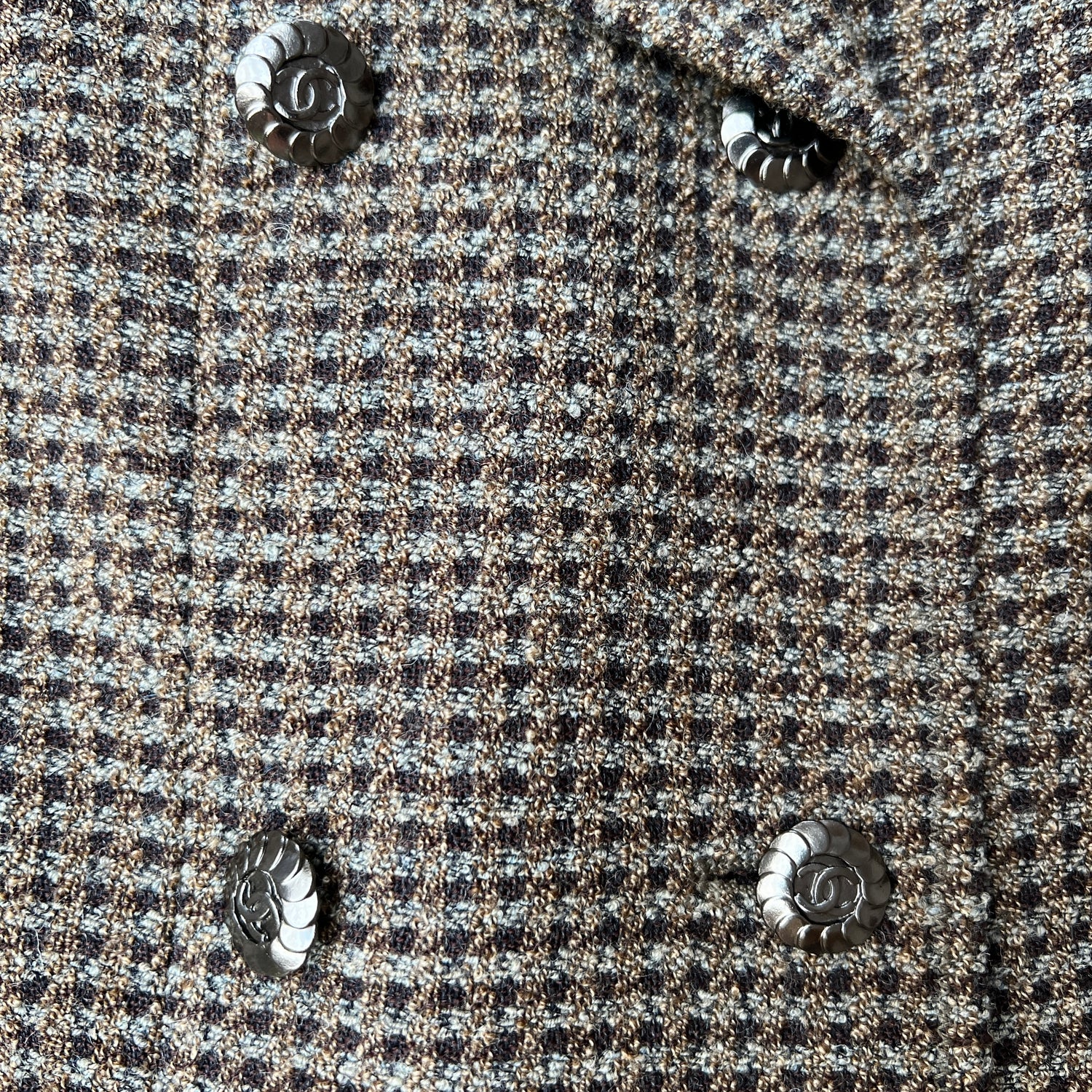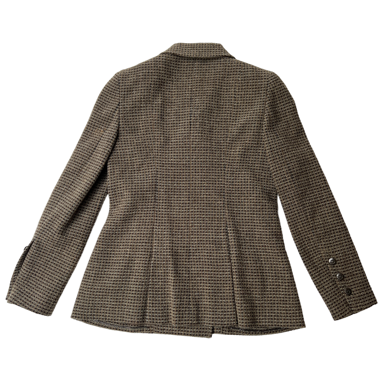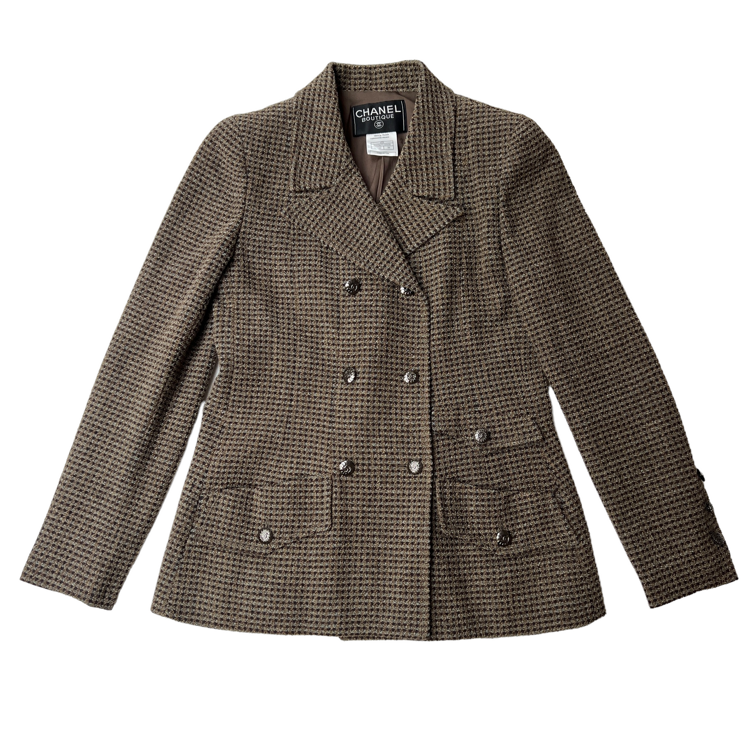 Chanel vintage kaki tweed blazer. Fall 1997 Collection by Karl Lagerfeld. Slit pockets. Double breasted. Pointed collar. CC logo buttons. Designer size 38.