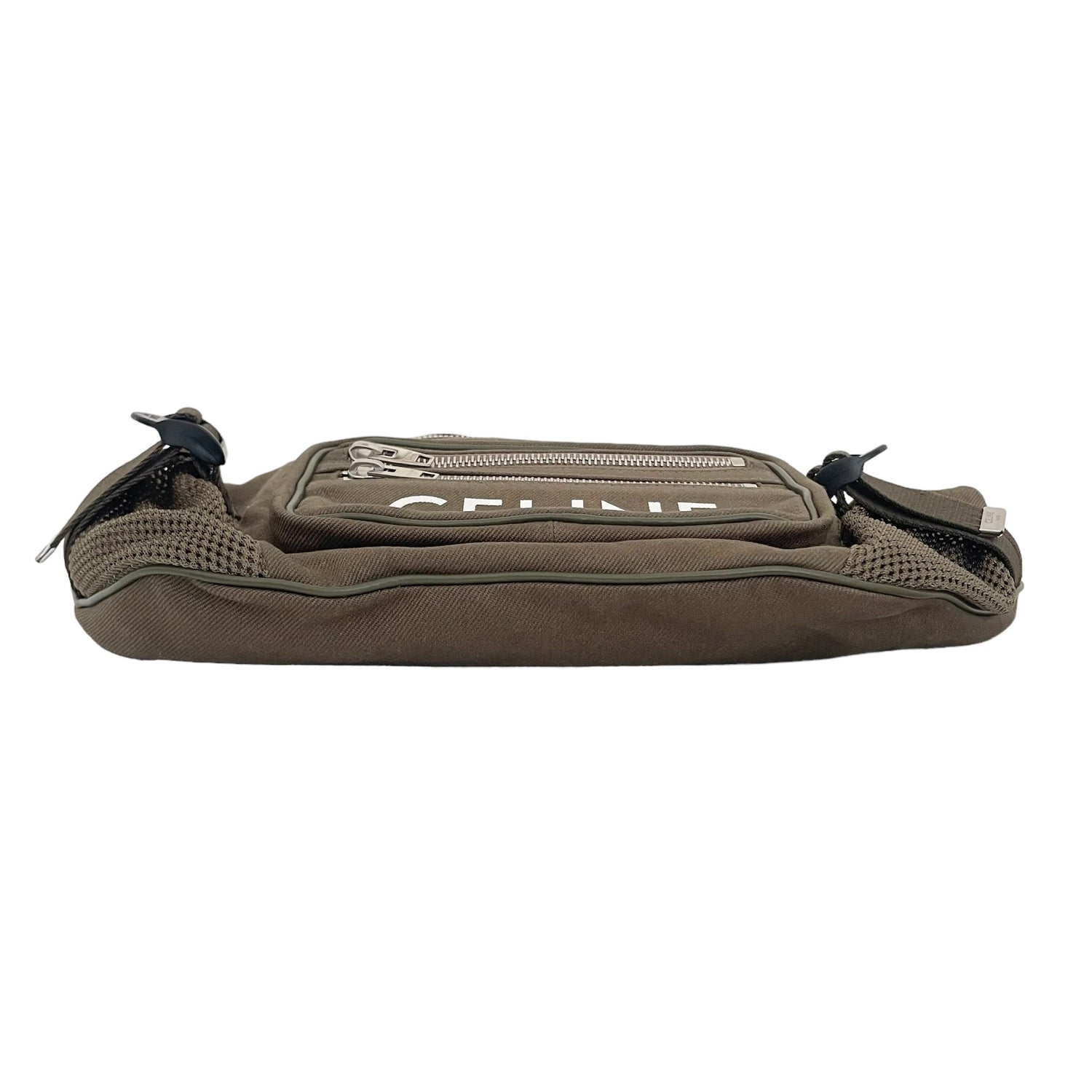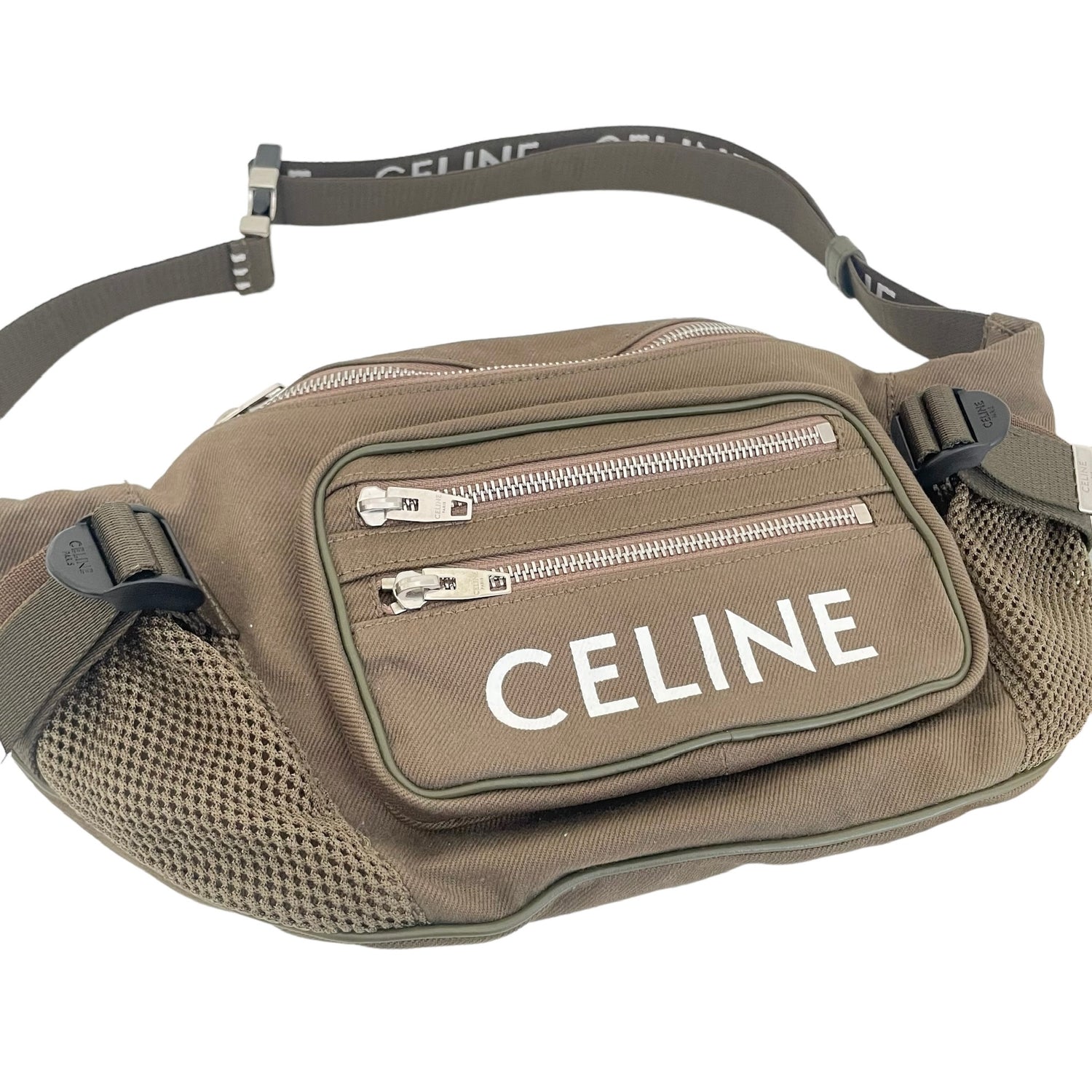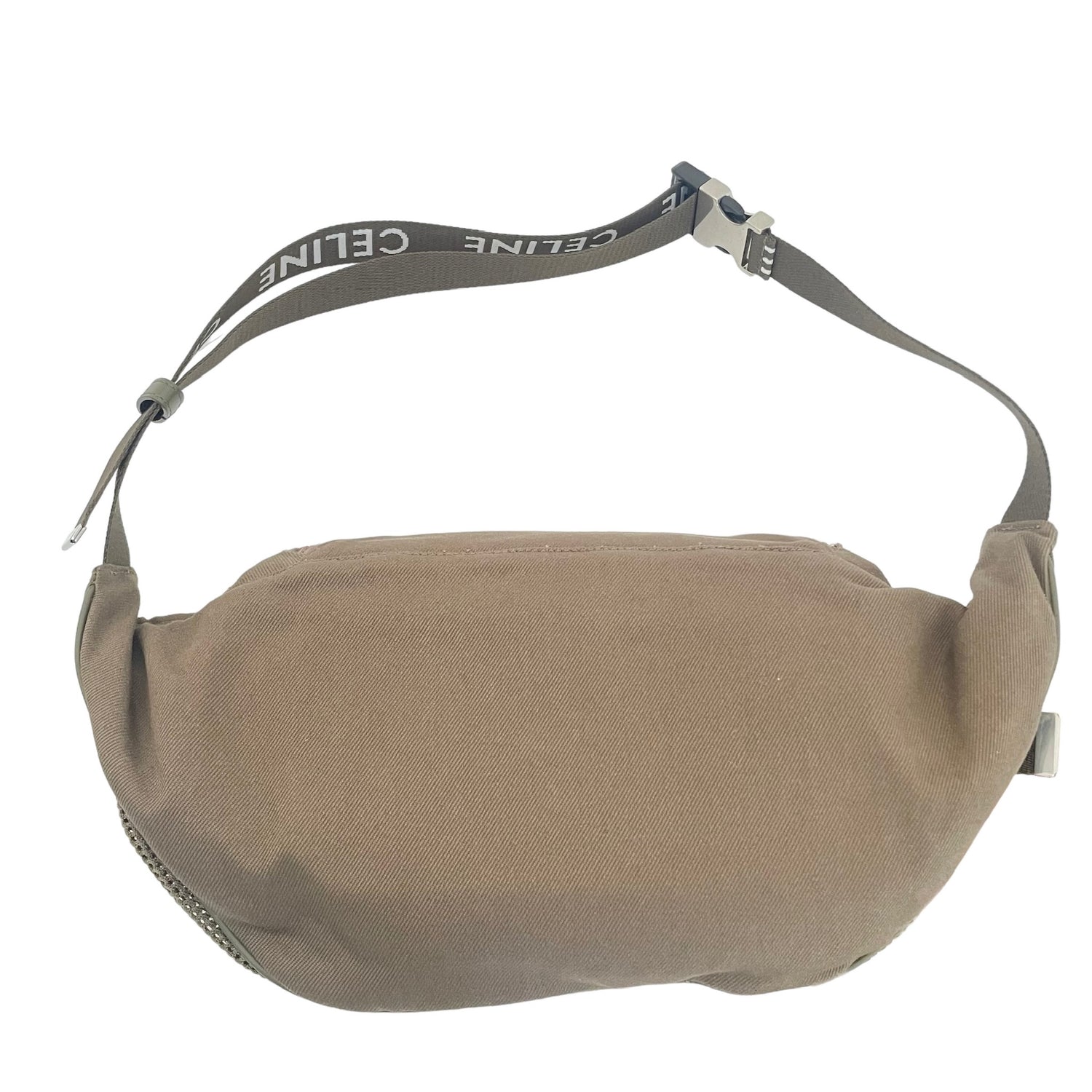 Celine Kaki bum bag. Cotton canvas. Celine logo at front and on the nylon strap. Adjustable strap. Multiple pockets.