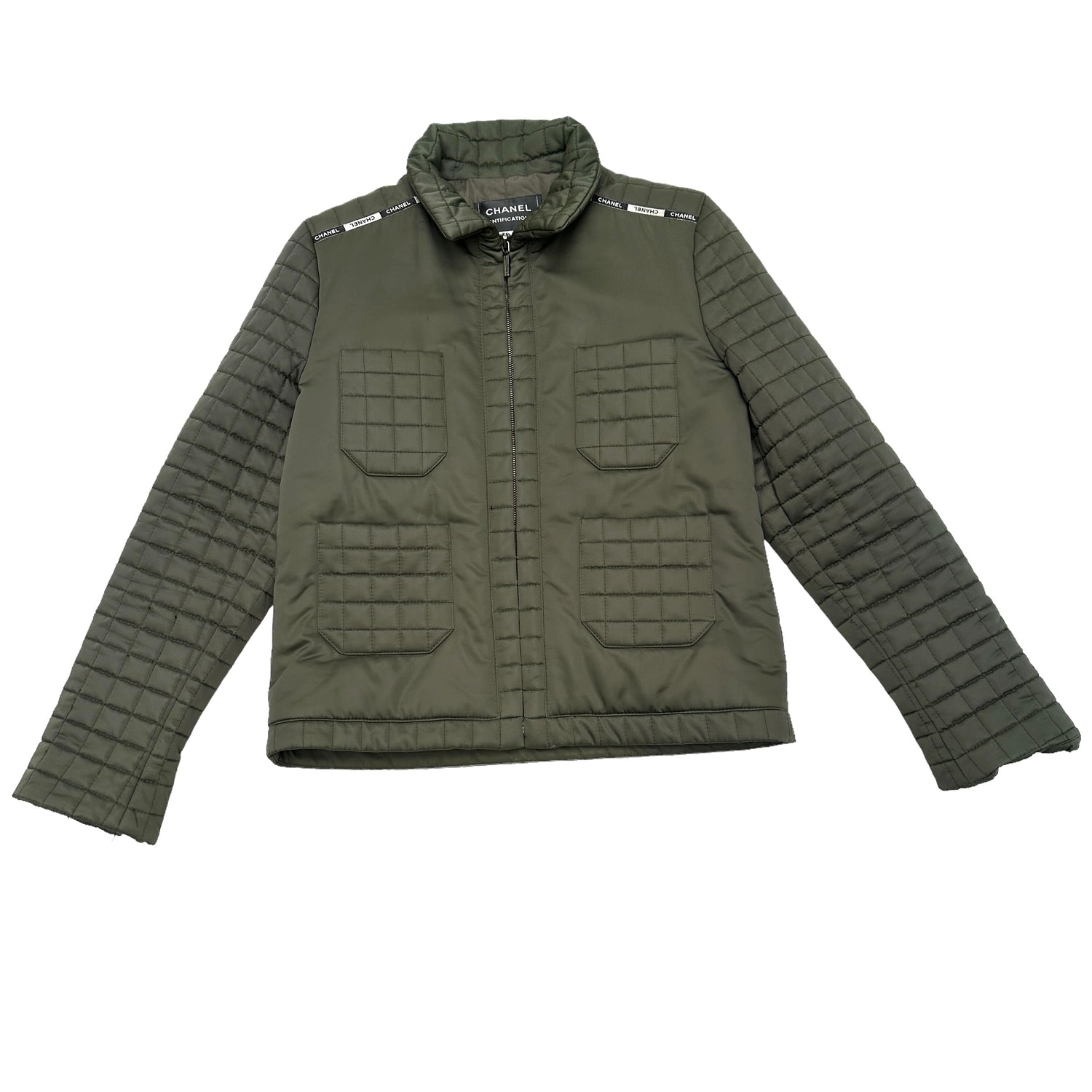 Chanel identification kaki jacket. Logo at shoulders. Zipper at front. Four pockets. Designer size 40.