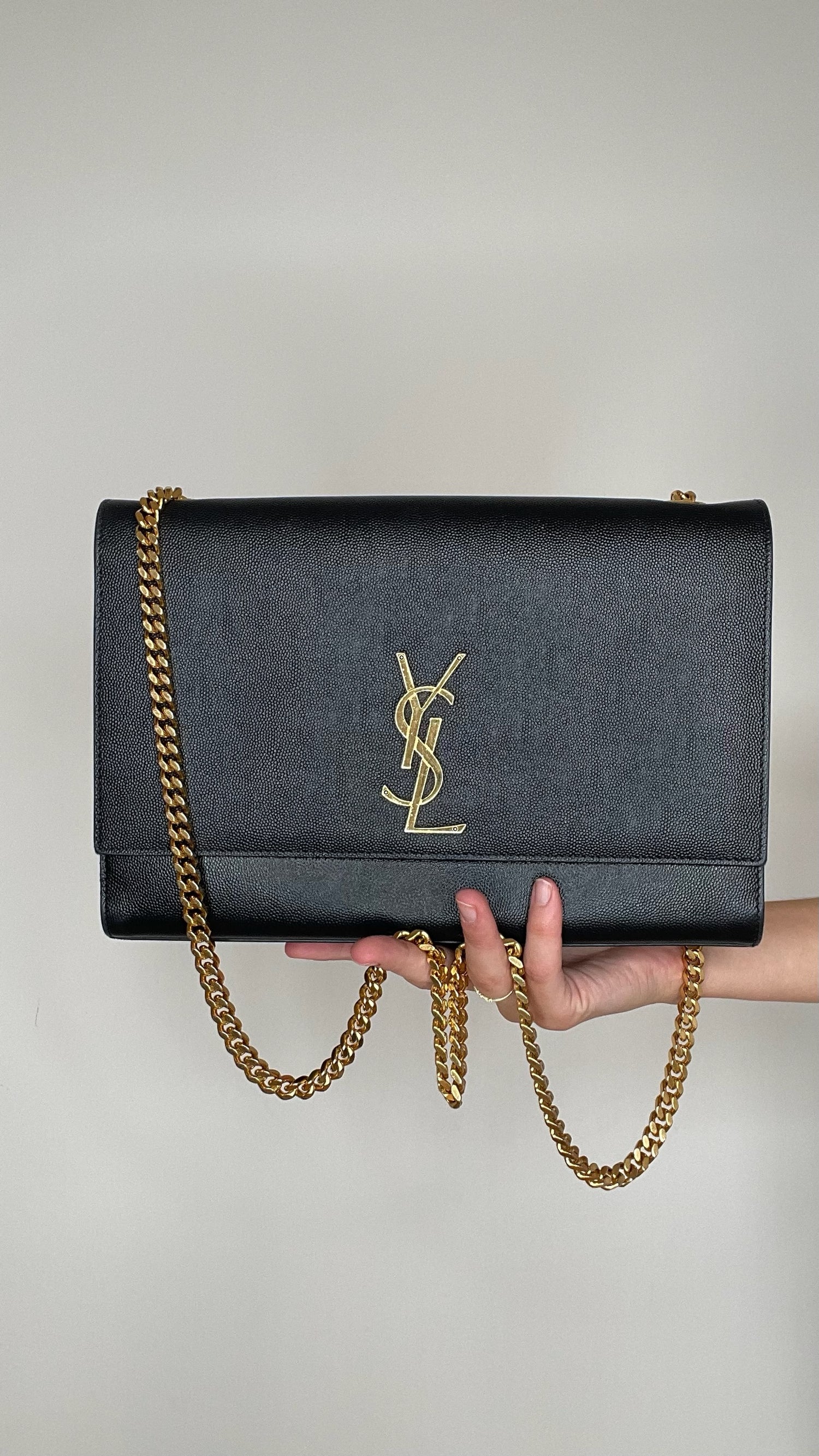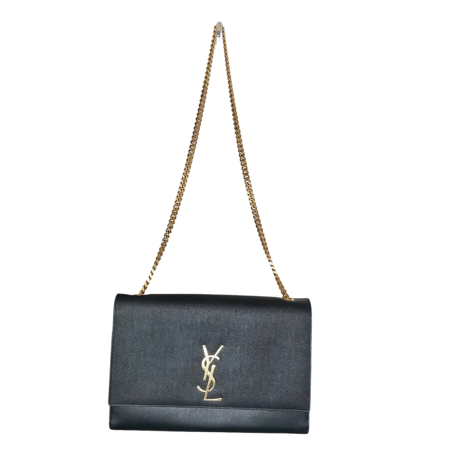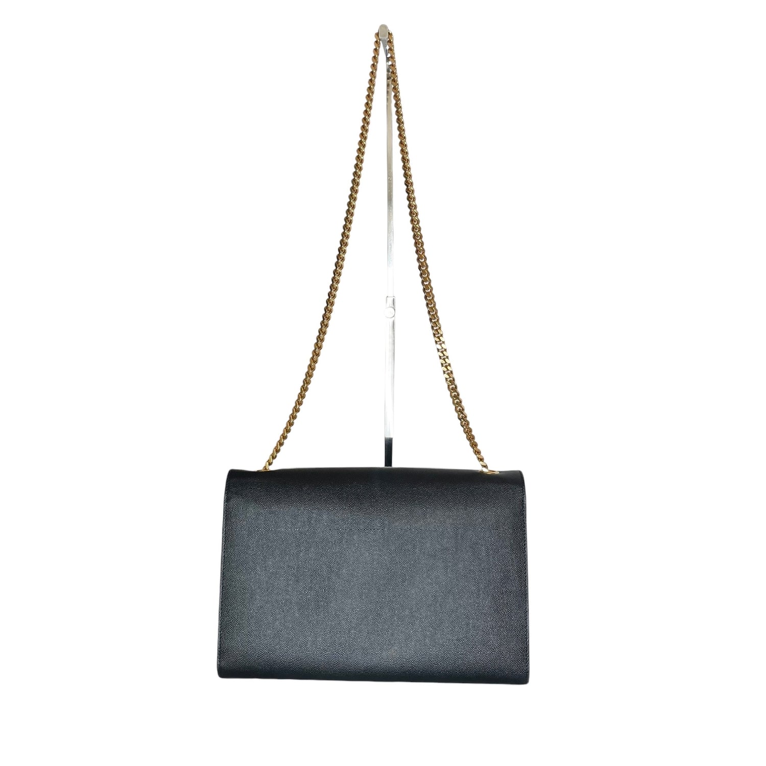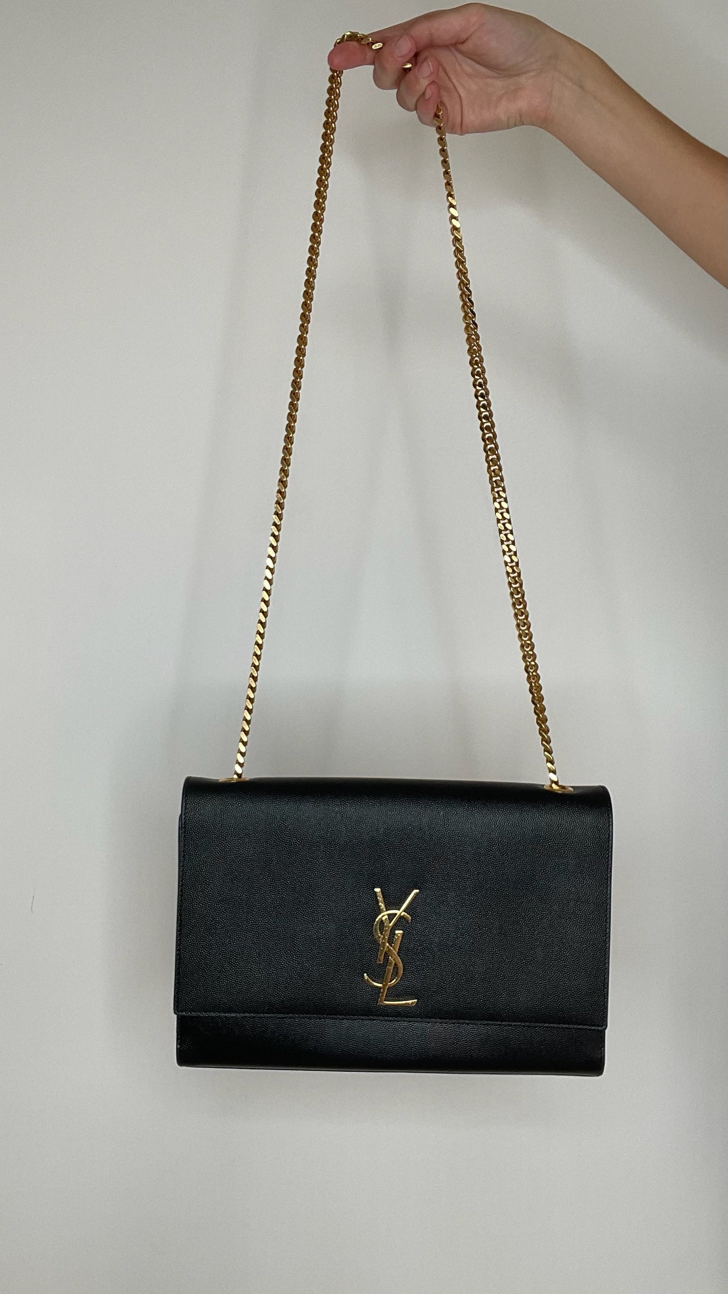 Saint Laurent Kate black crossbody bag. Gold-tone hardware. YSL logo at front flap. Double chain strap. Magnetic snap closure at top.