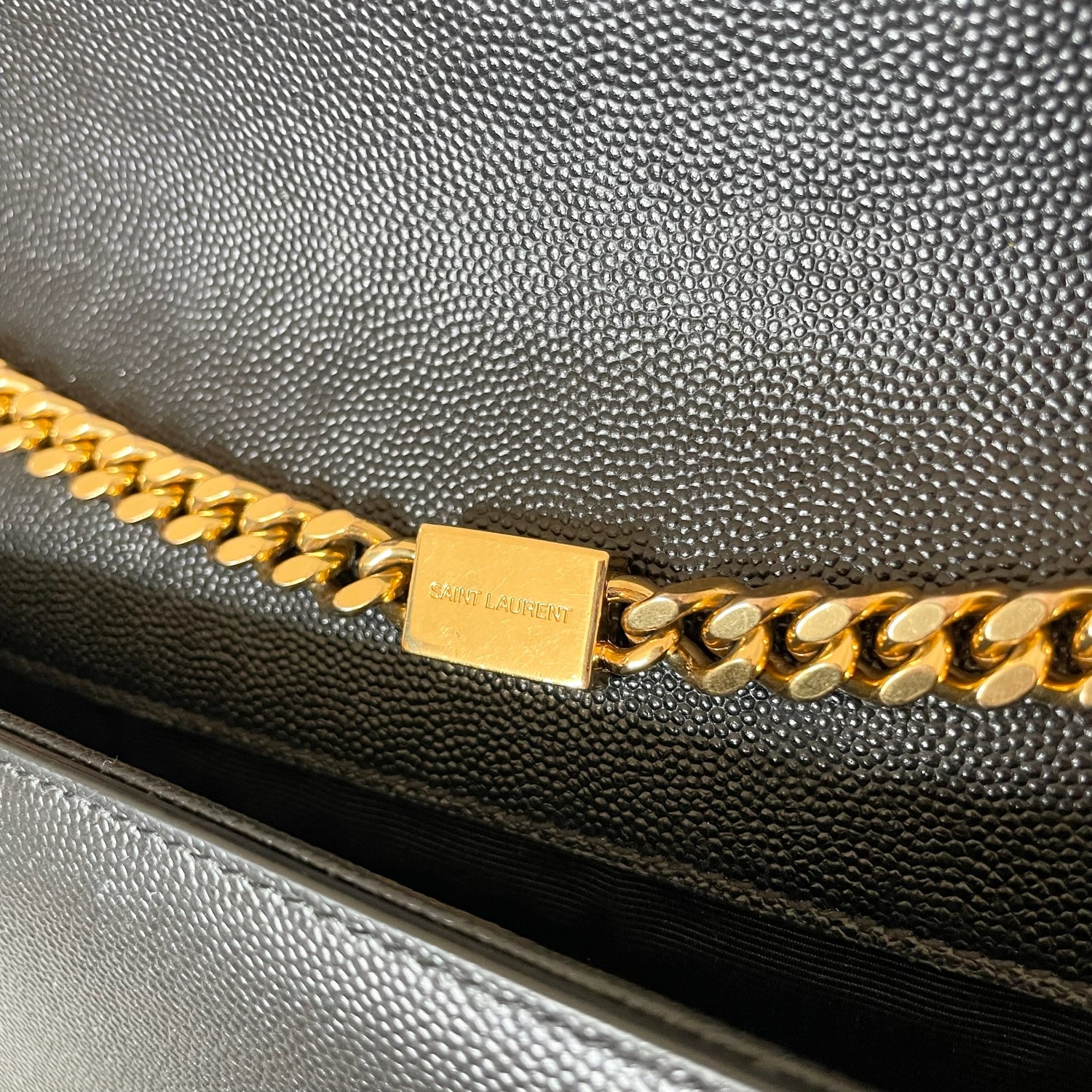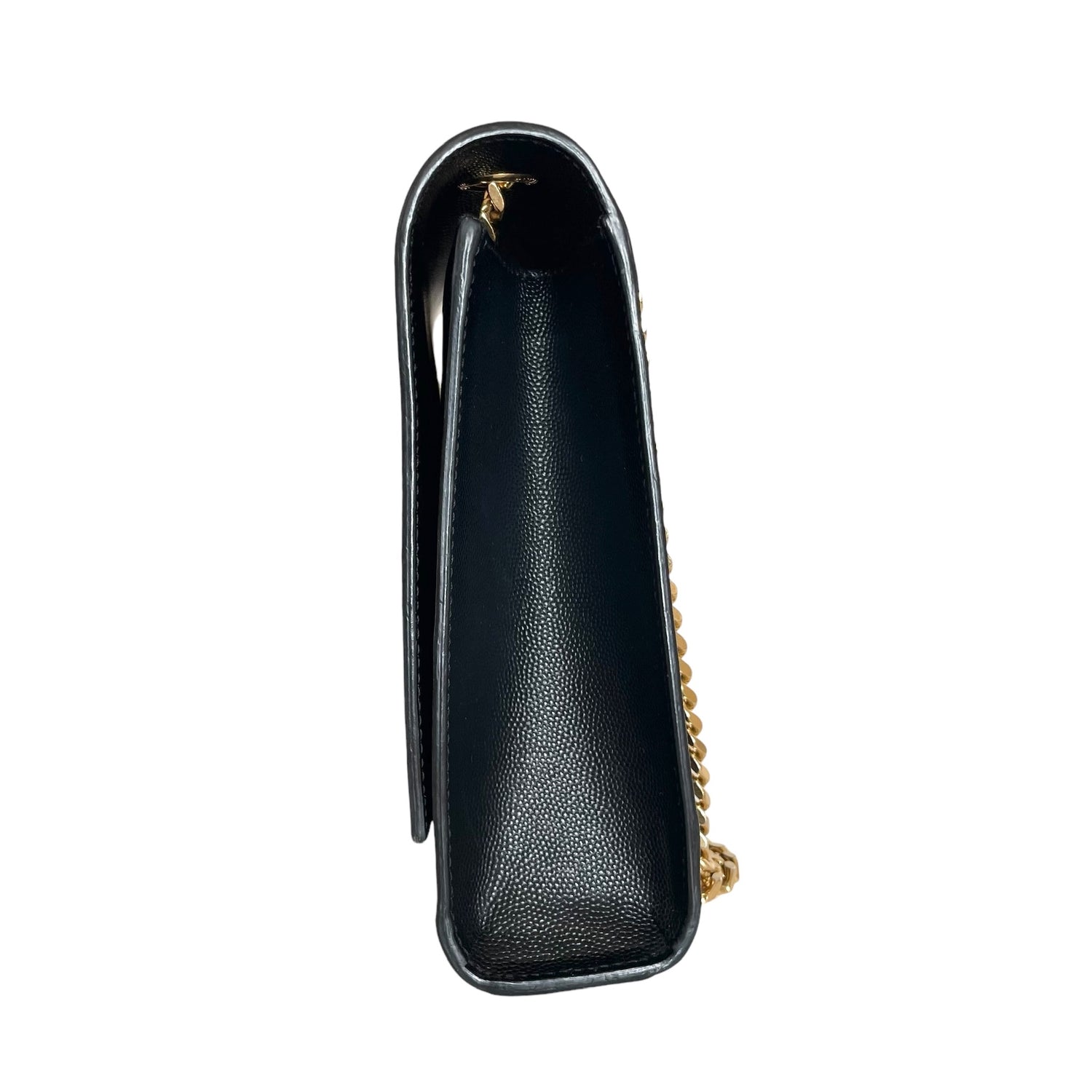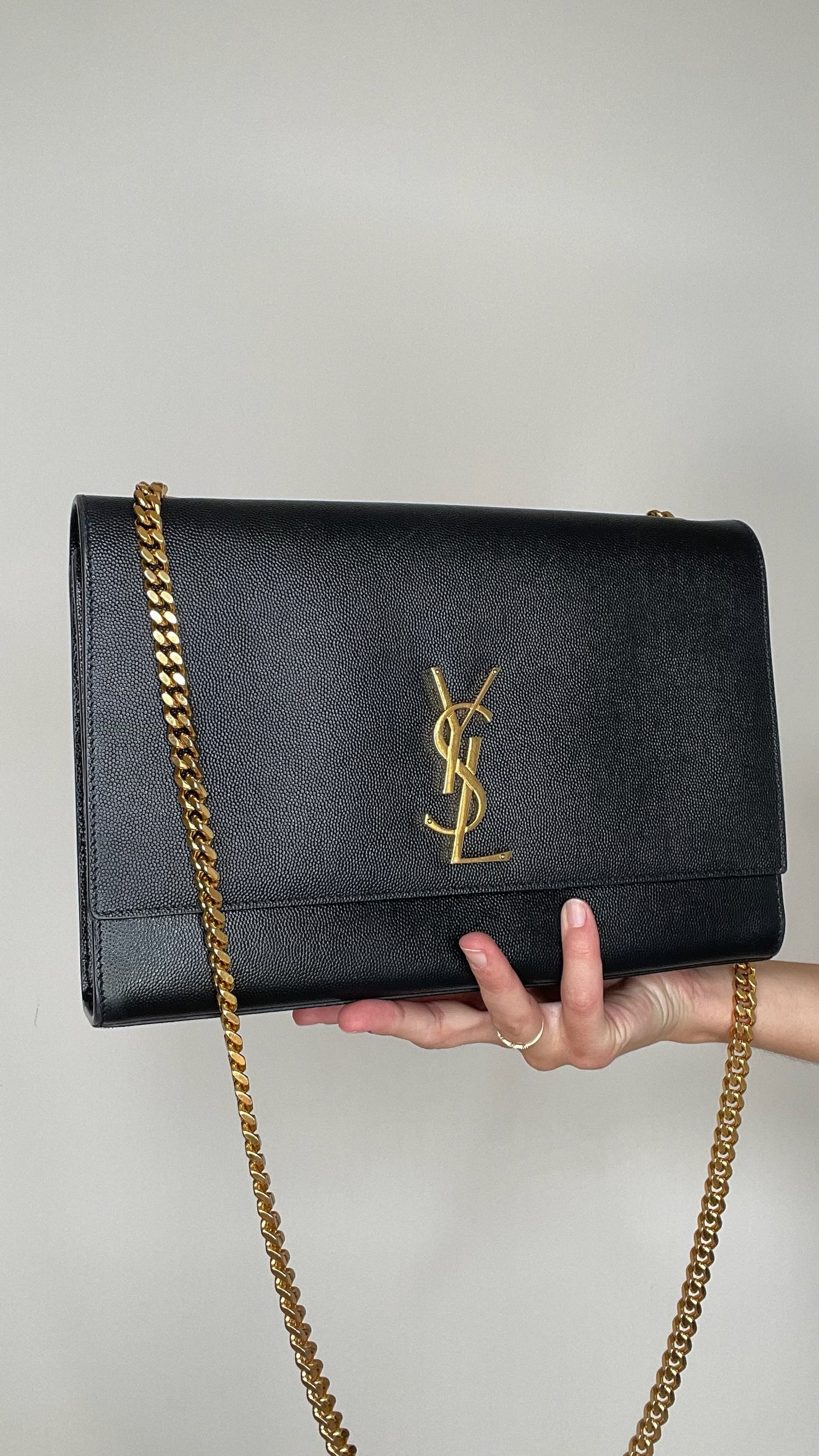 Saint Laurent Kate black crossbody bag. Gold-tone hardware. YSL logo at front flap. Double chain strap. Magnetic snap closure at top.