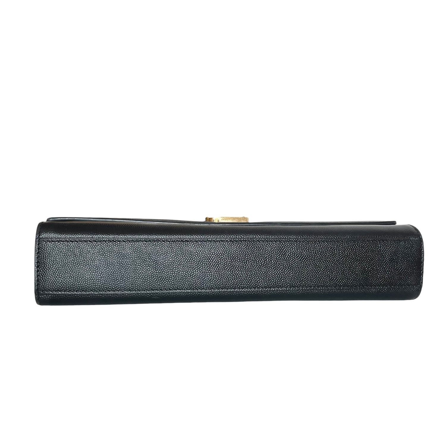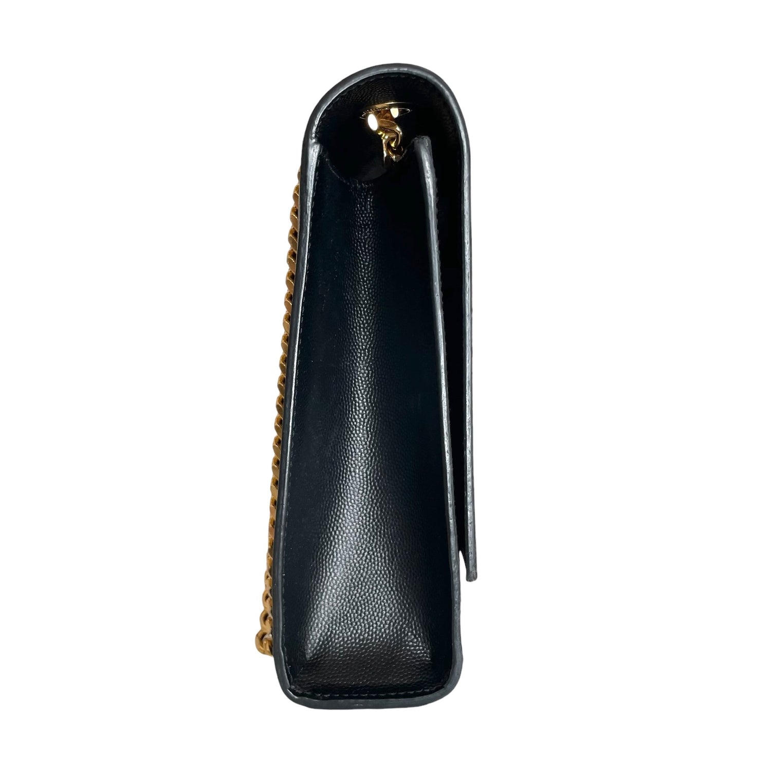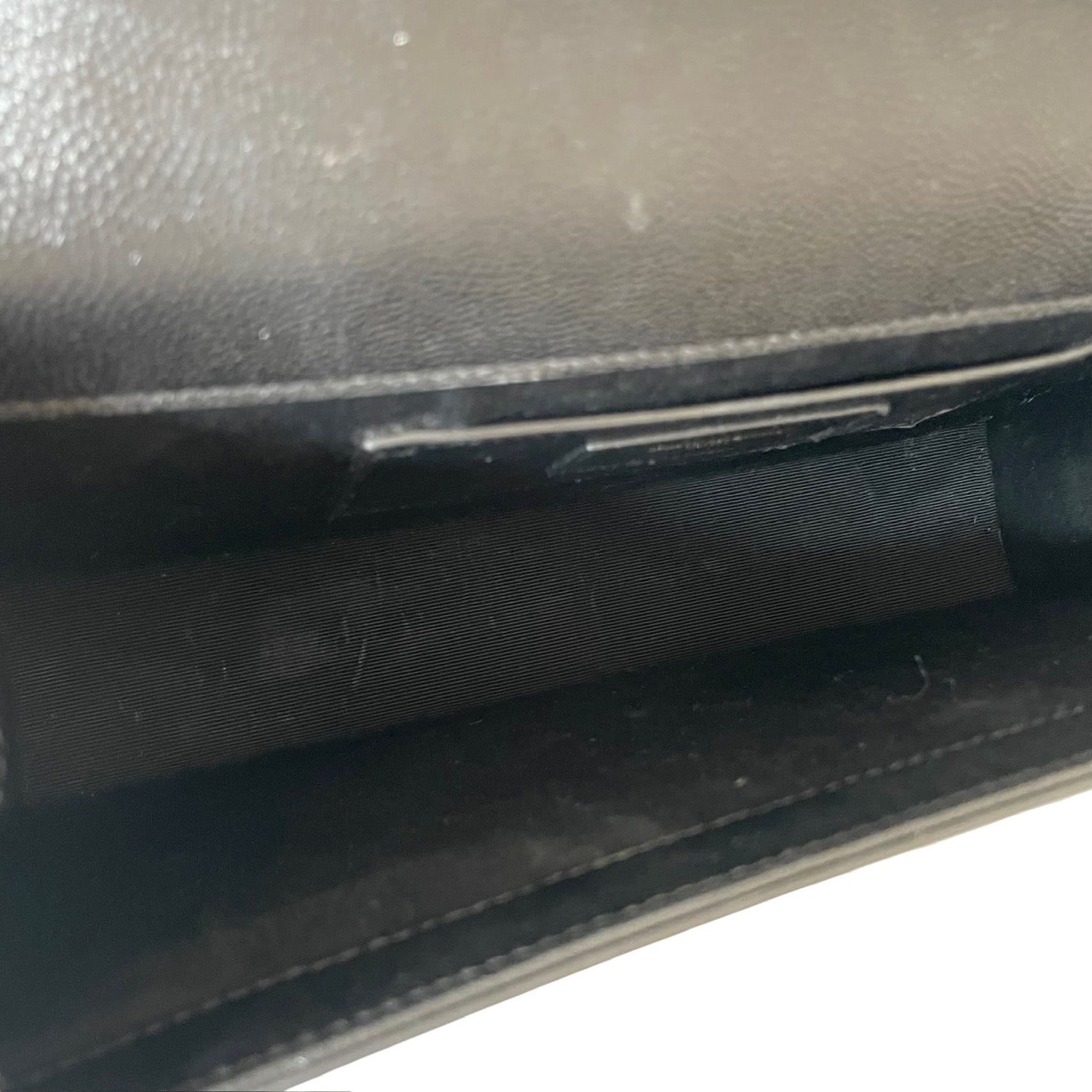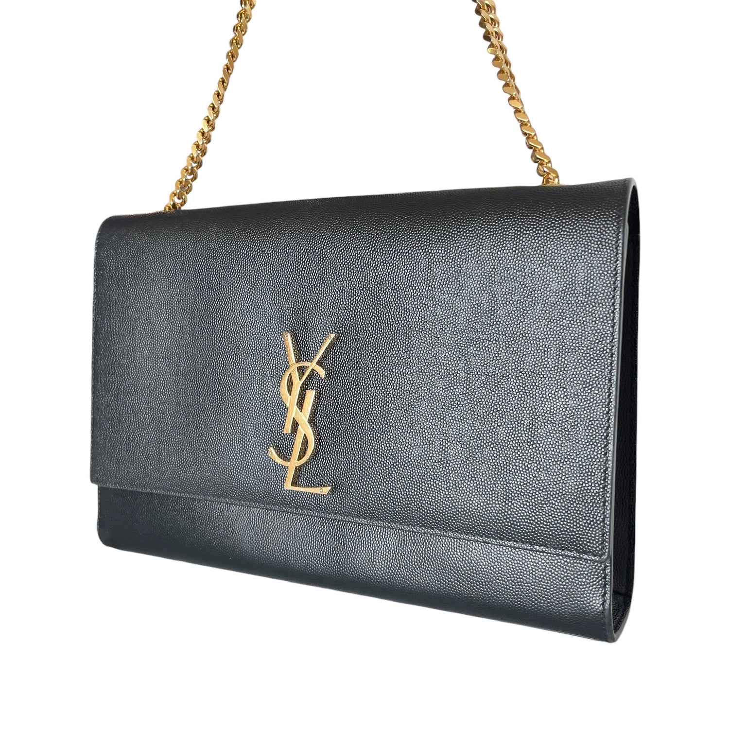 Saint Laurent Kate black crossbody bag. Gold-tone hardware. YSL logo at front flap. Double chain strap. Magnetic snap closure at top.