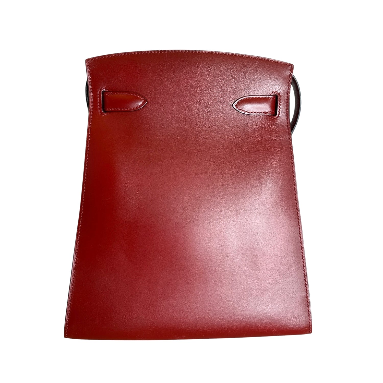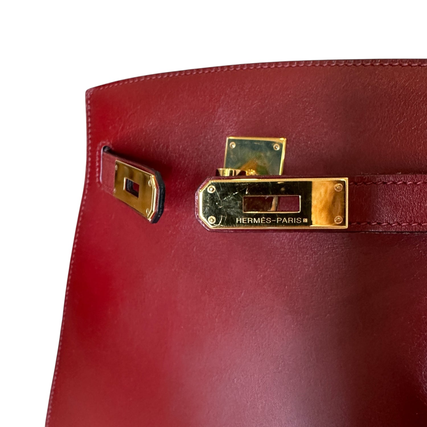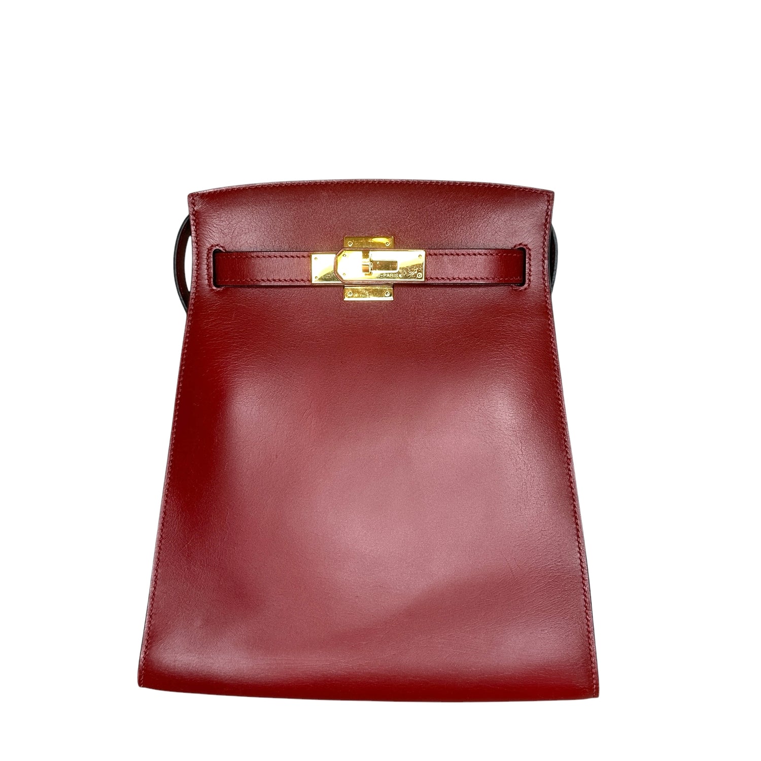 Hermes Kelly Sport bag. J Square 2006 stamp. Rouge H Box leather. Gold plated hardware. Adjustable crossbody strap. Two interior slit pockets. Protective feet at base.