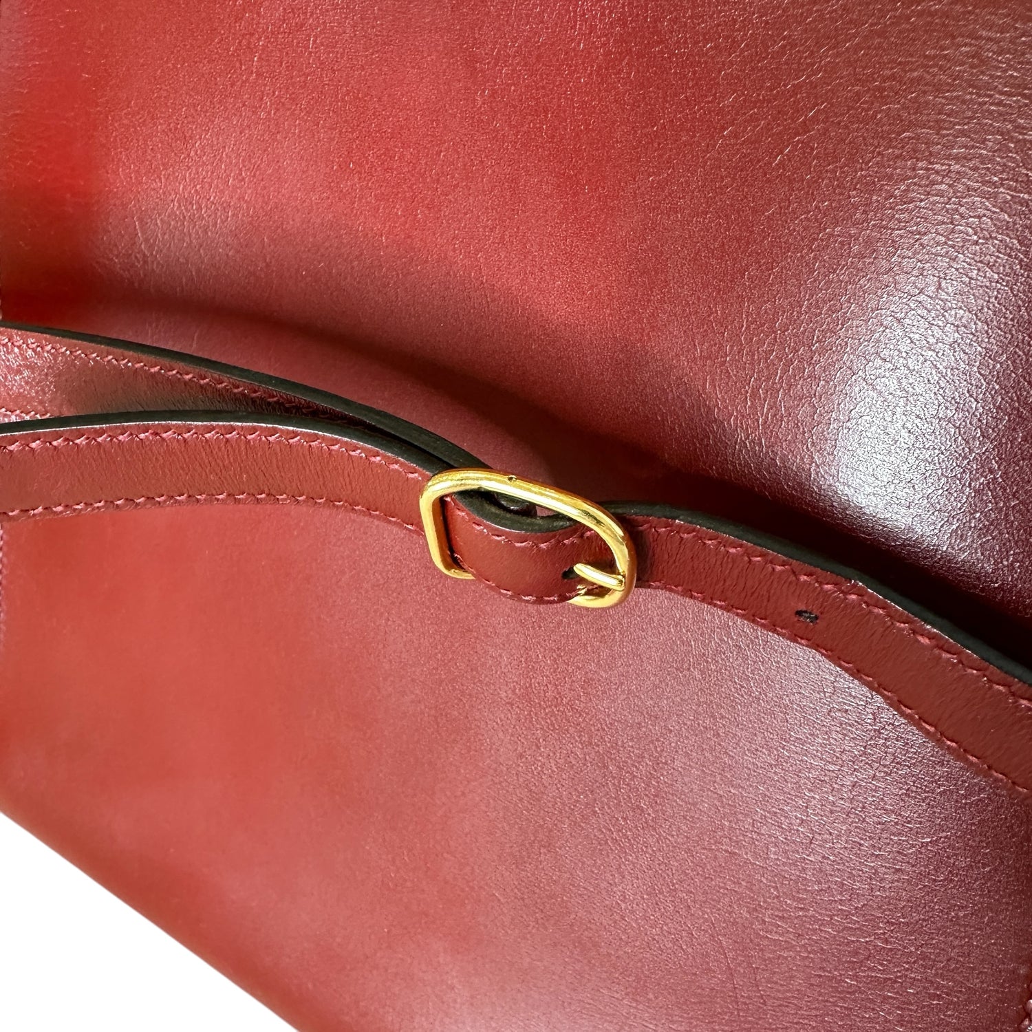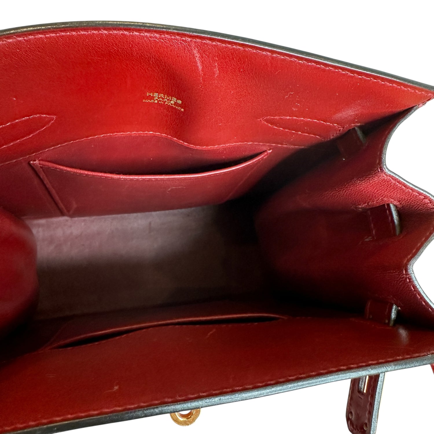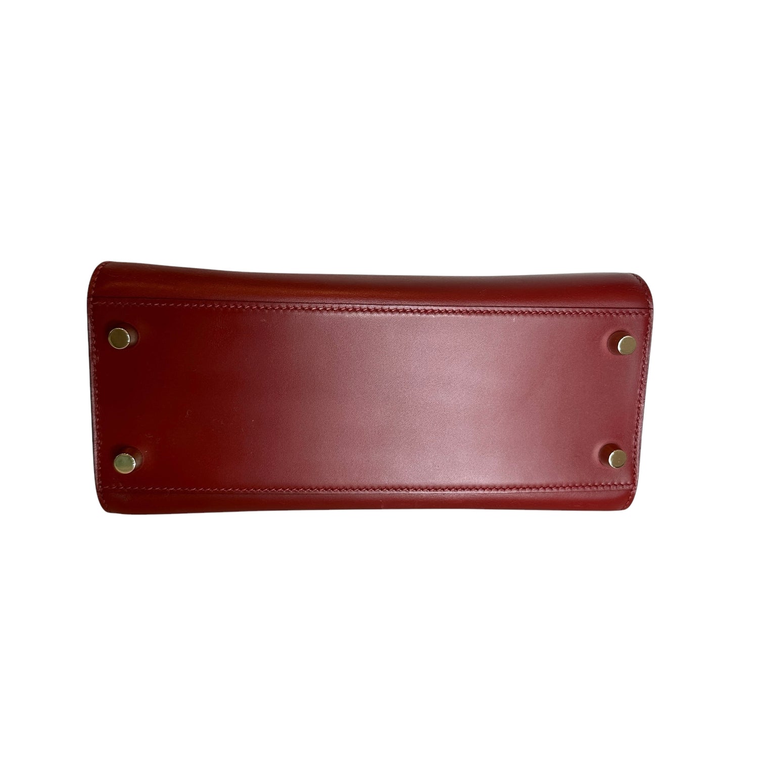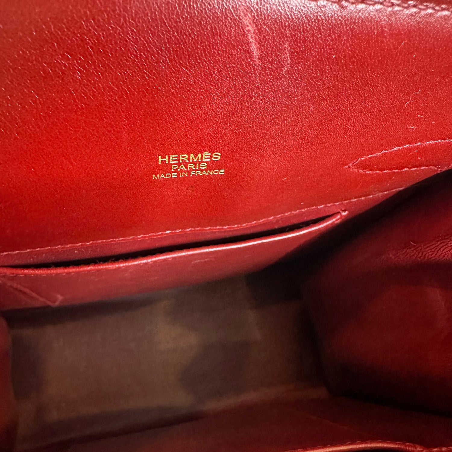 Hermes Kelly Sport bag. J Square 2006 stamp. Rouge H Box leather. Gold plated hardware. Adjustable crossbody strap. Two interior slit pockets. Protective feet at base.