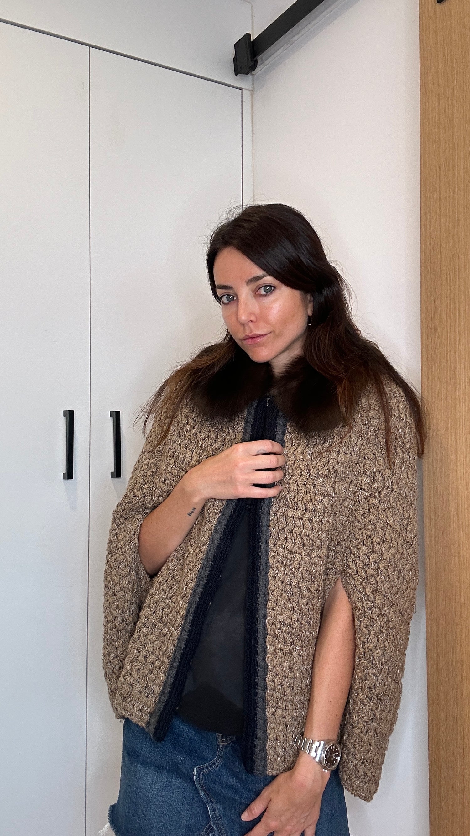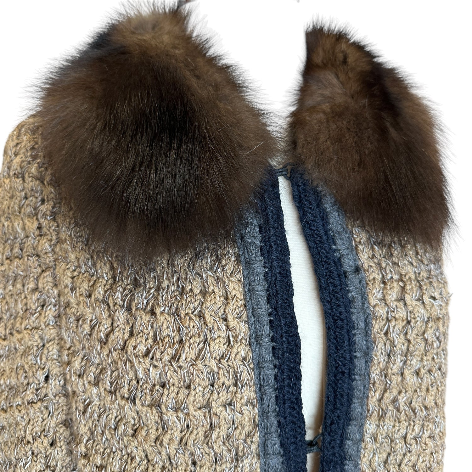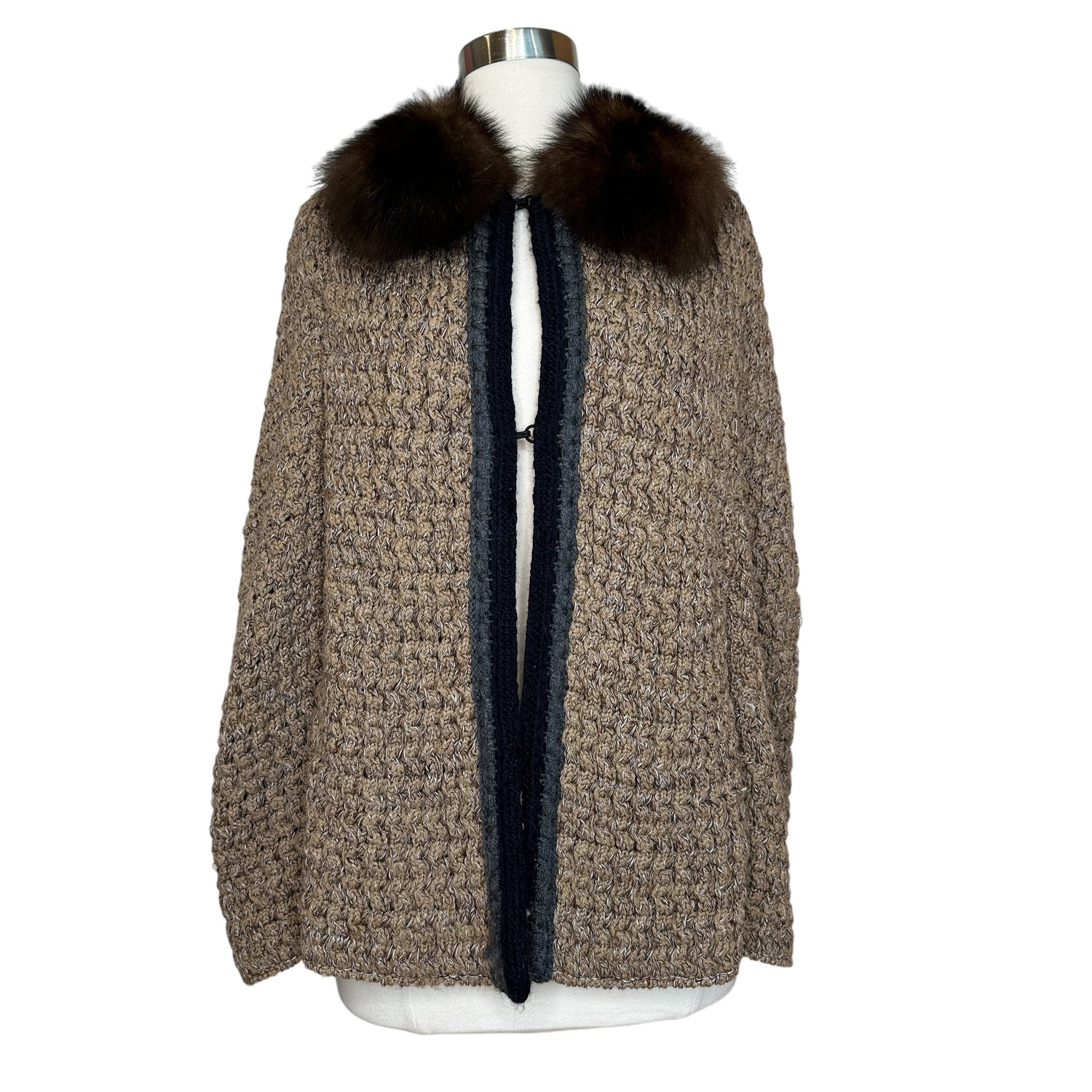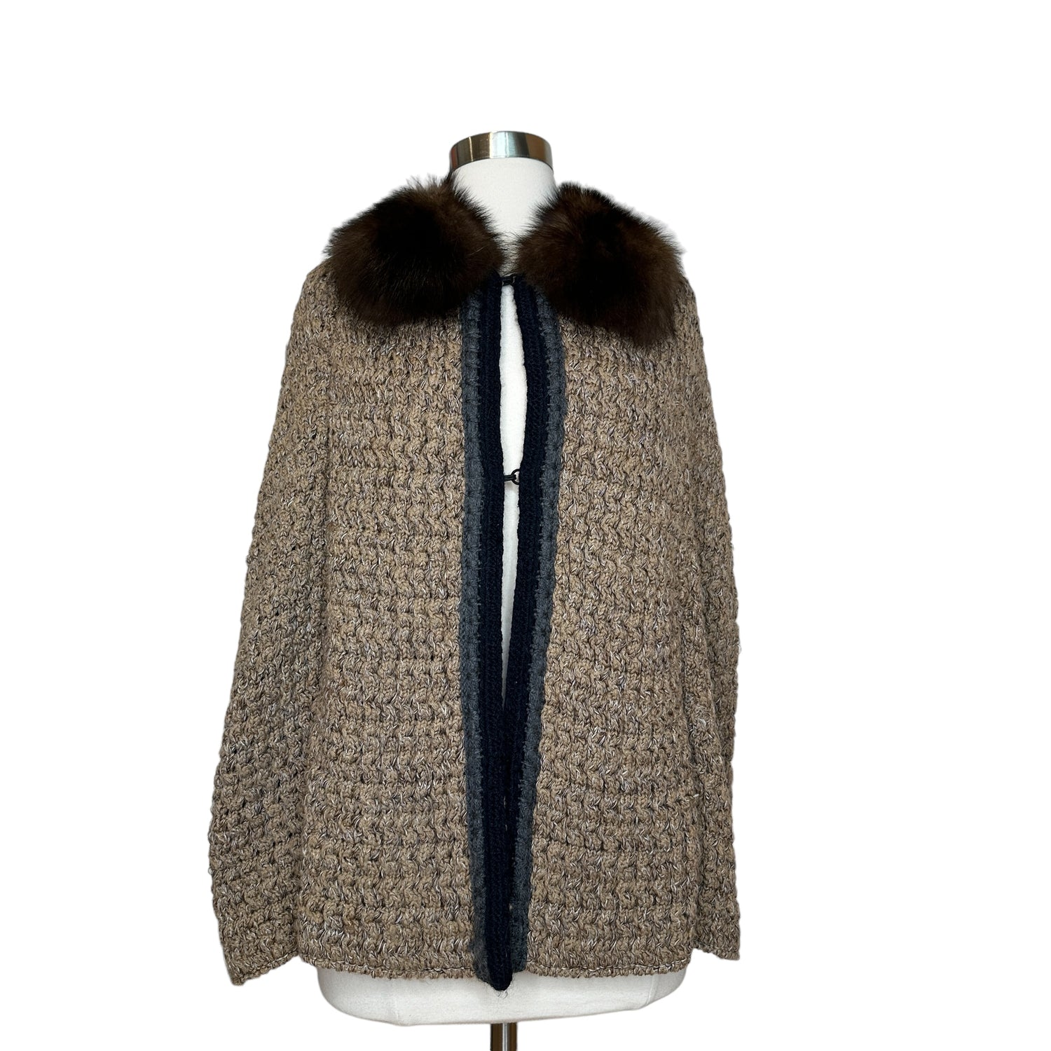 Prada knitted cape with fur collar. Hooks closure at front. Beautiful brown beige knits with navy and black trim at front. Lined. Designer size 40.