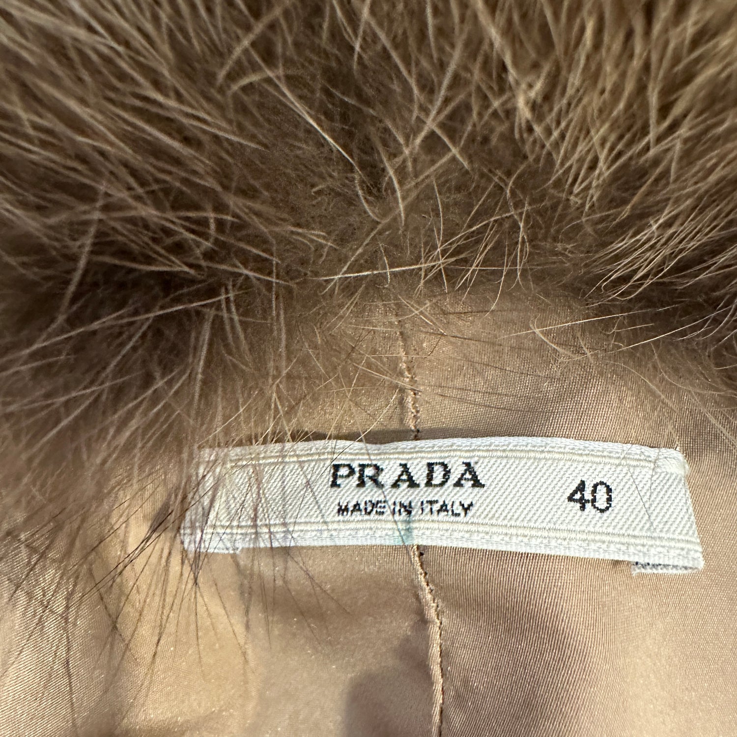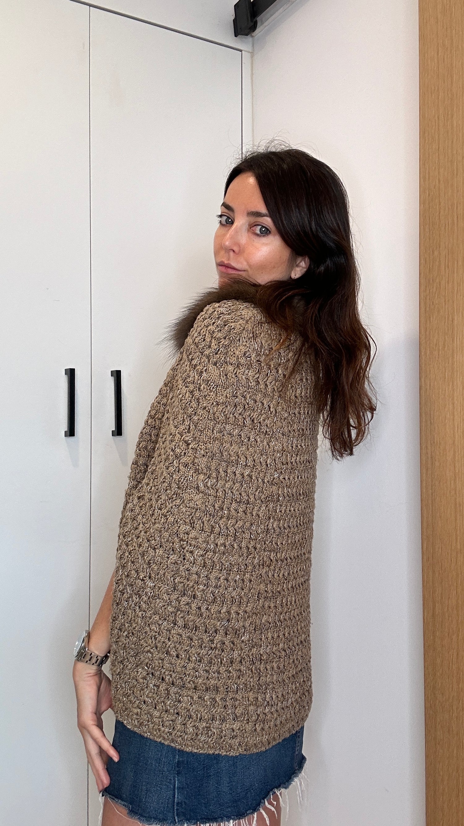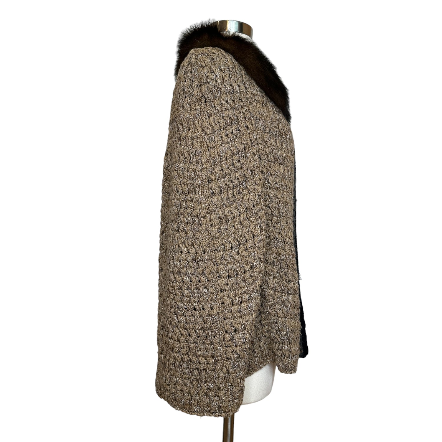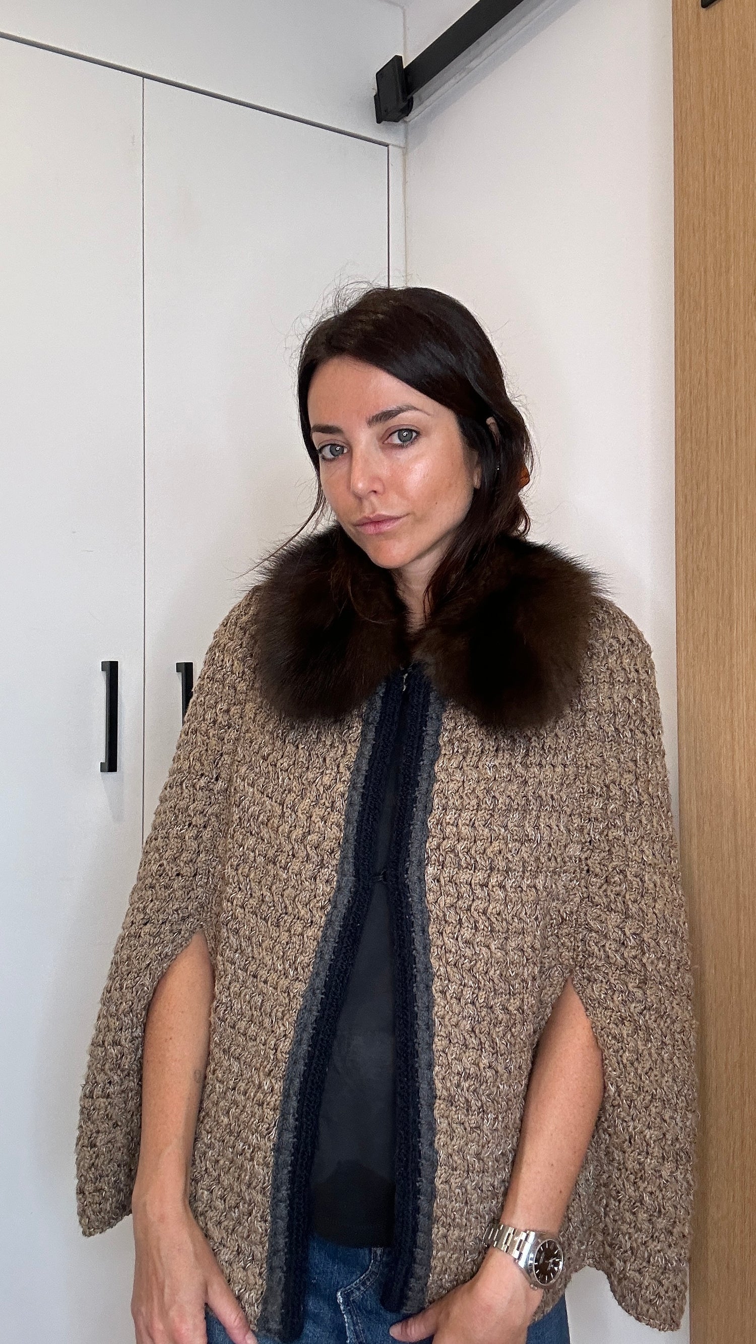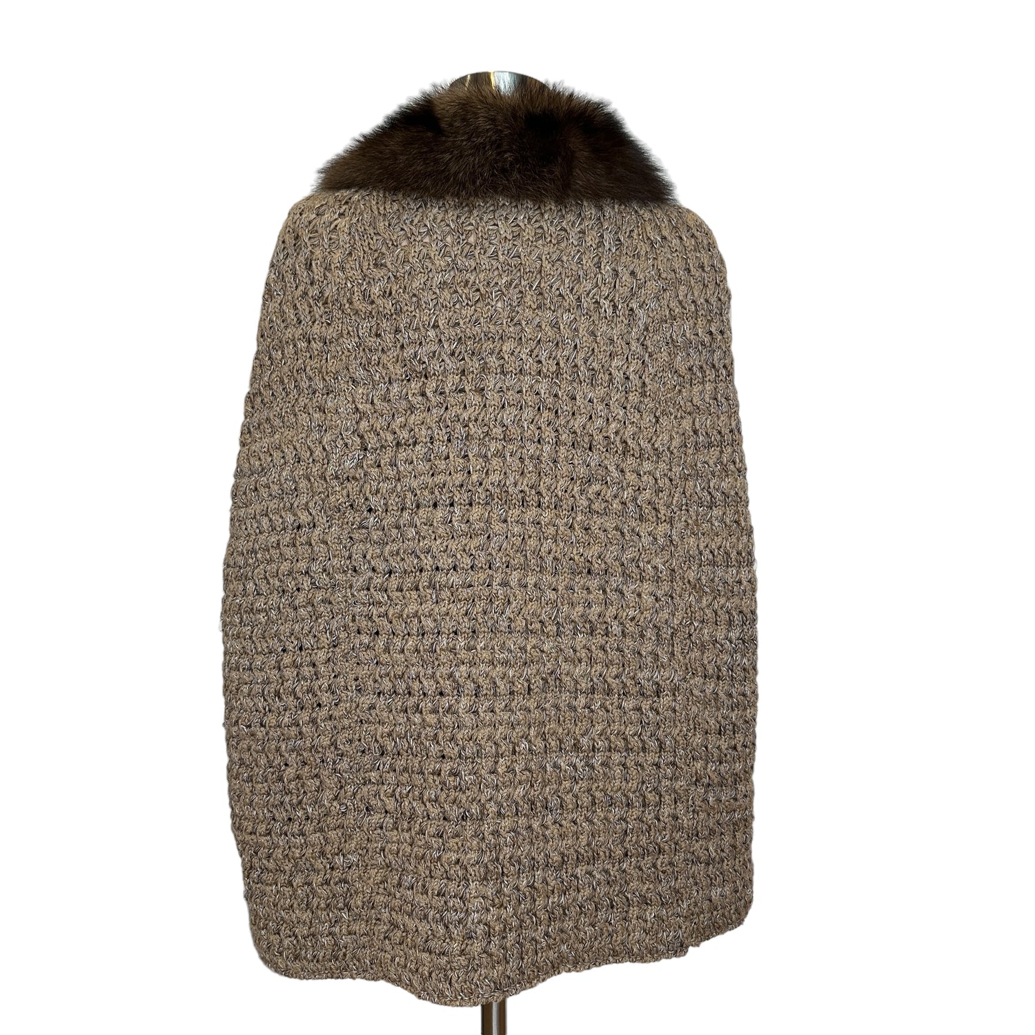 Prada knitted cape with fur collar. Hooks closure at front. Beautiful brown beige knits with navy and black trim at front. Lined. Designer size 40.