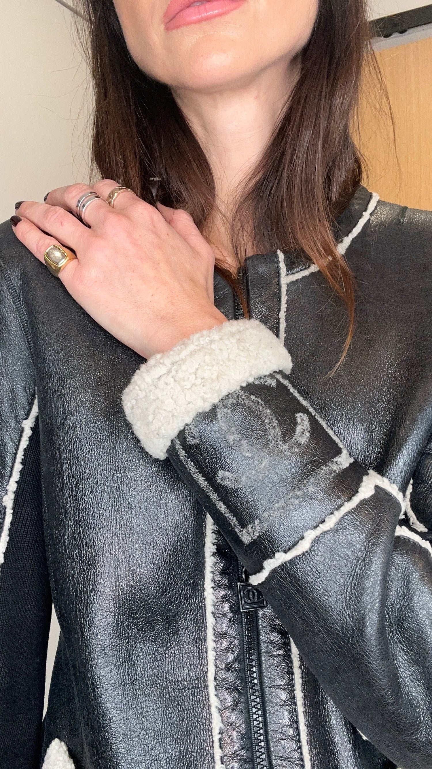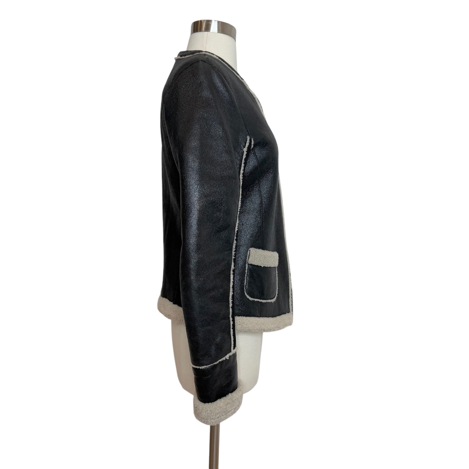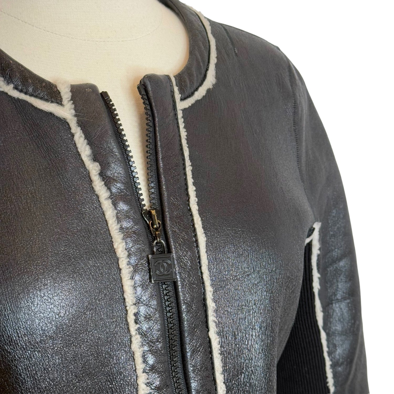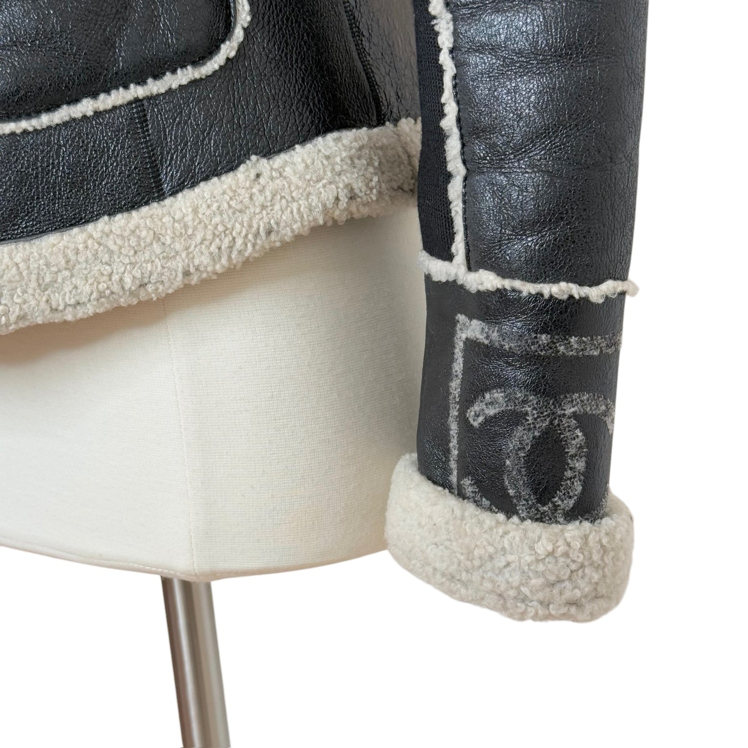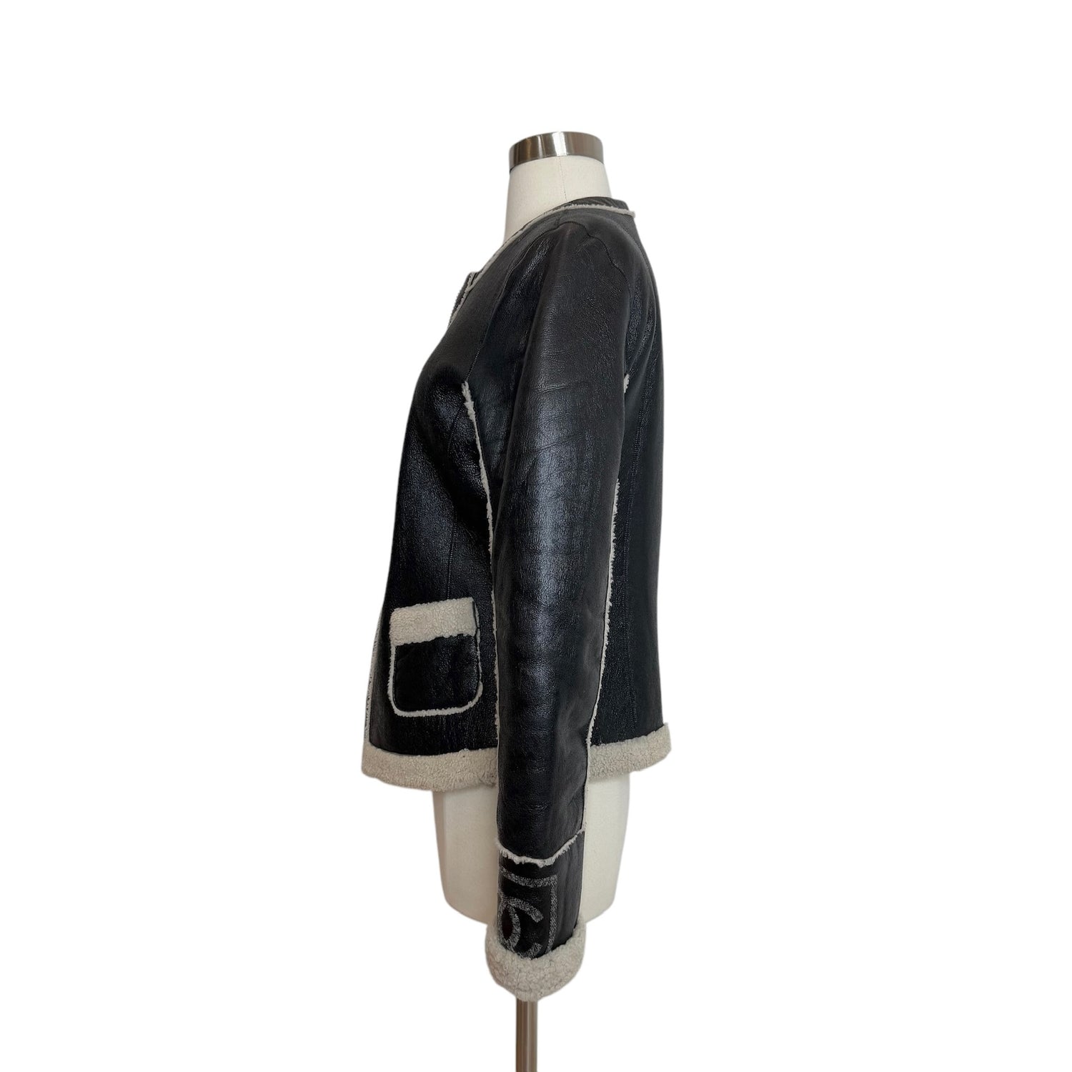 Chanel Identification leather jacket with shearling lining. Black lambskin leather. Logo at right wrist. Collarless. Zipper closure at front. Designer size 40.