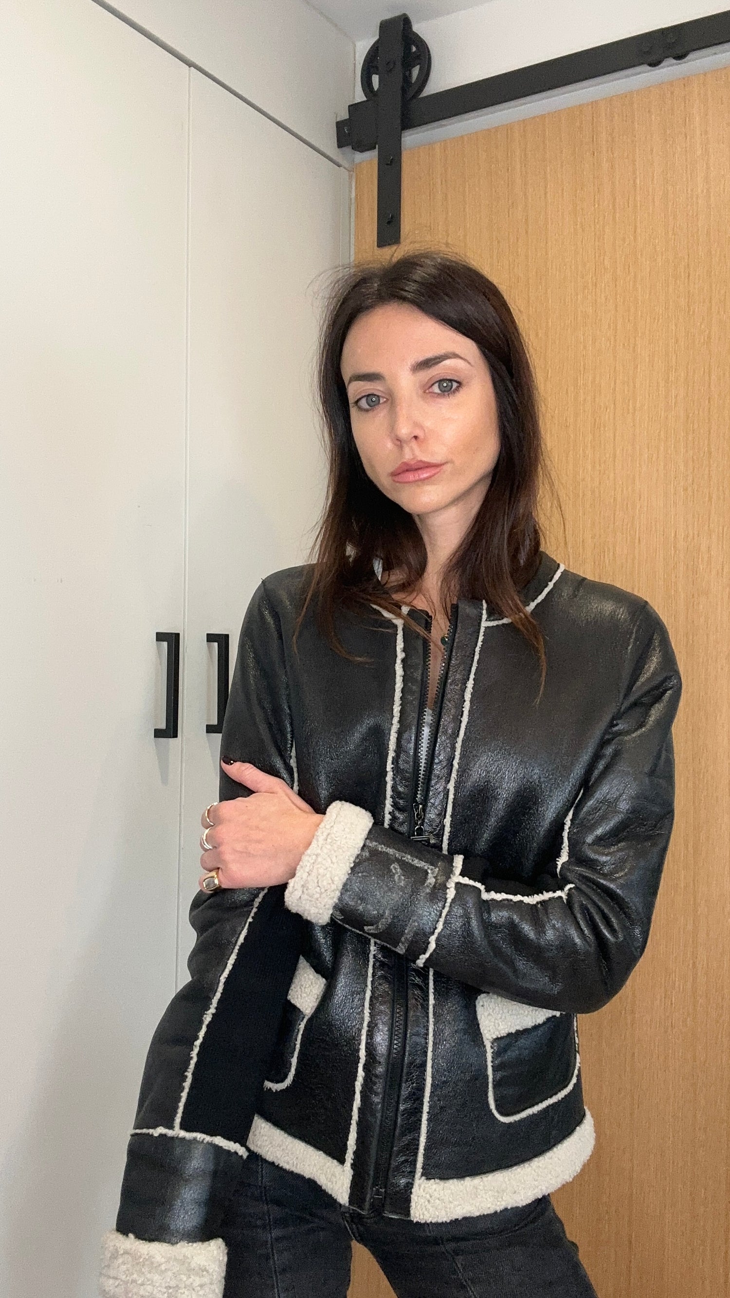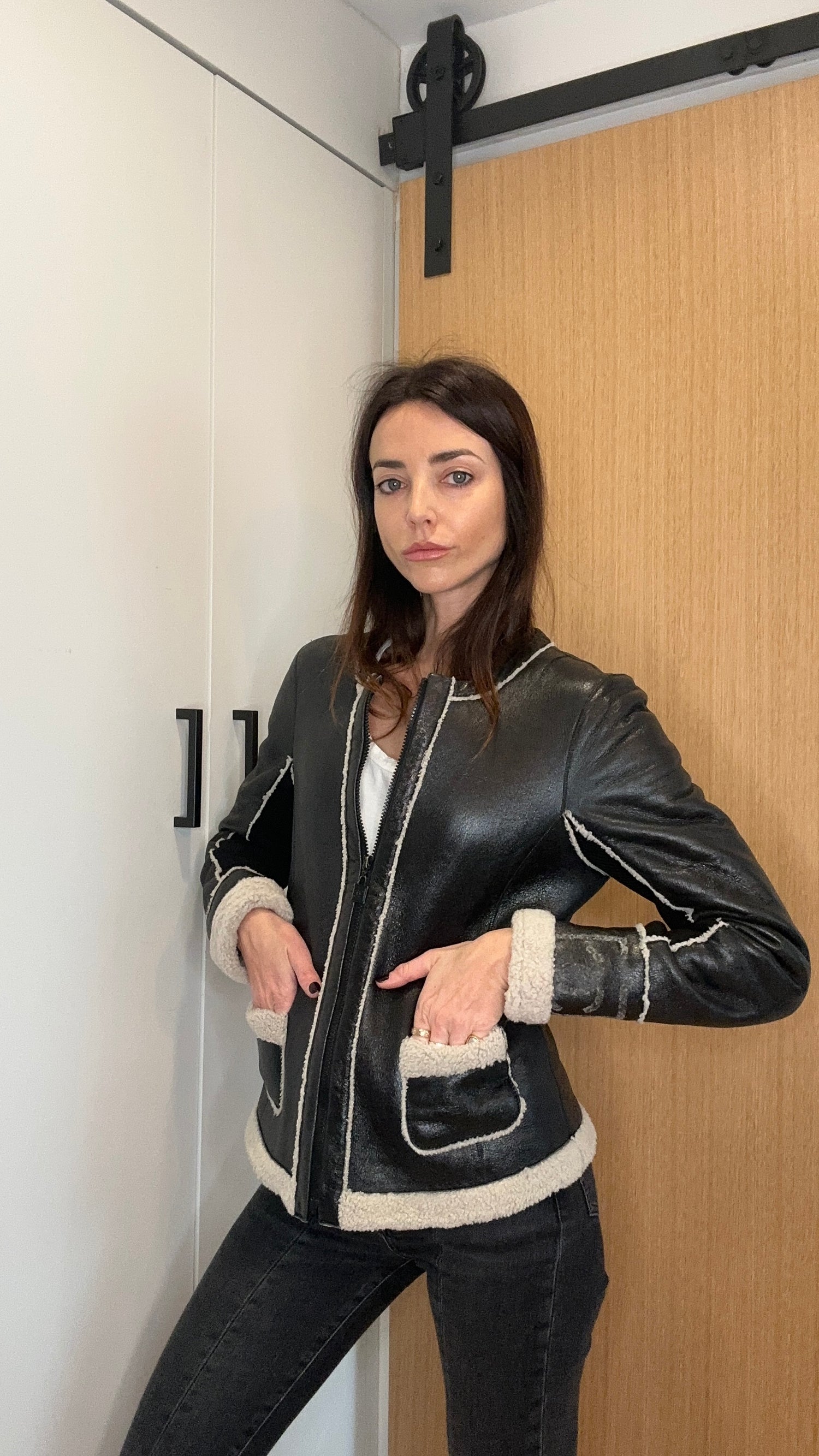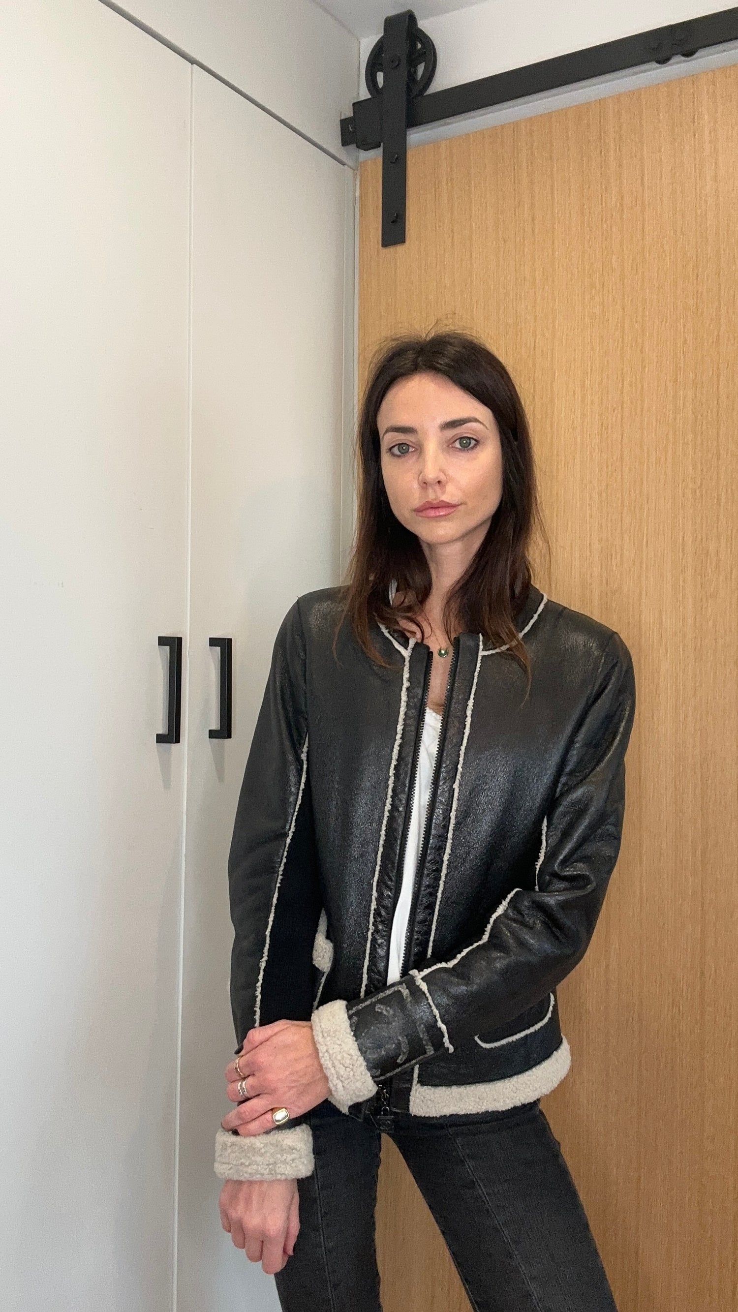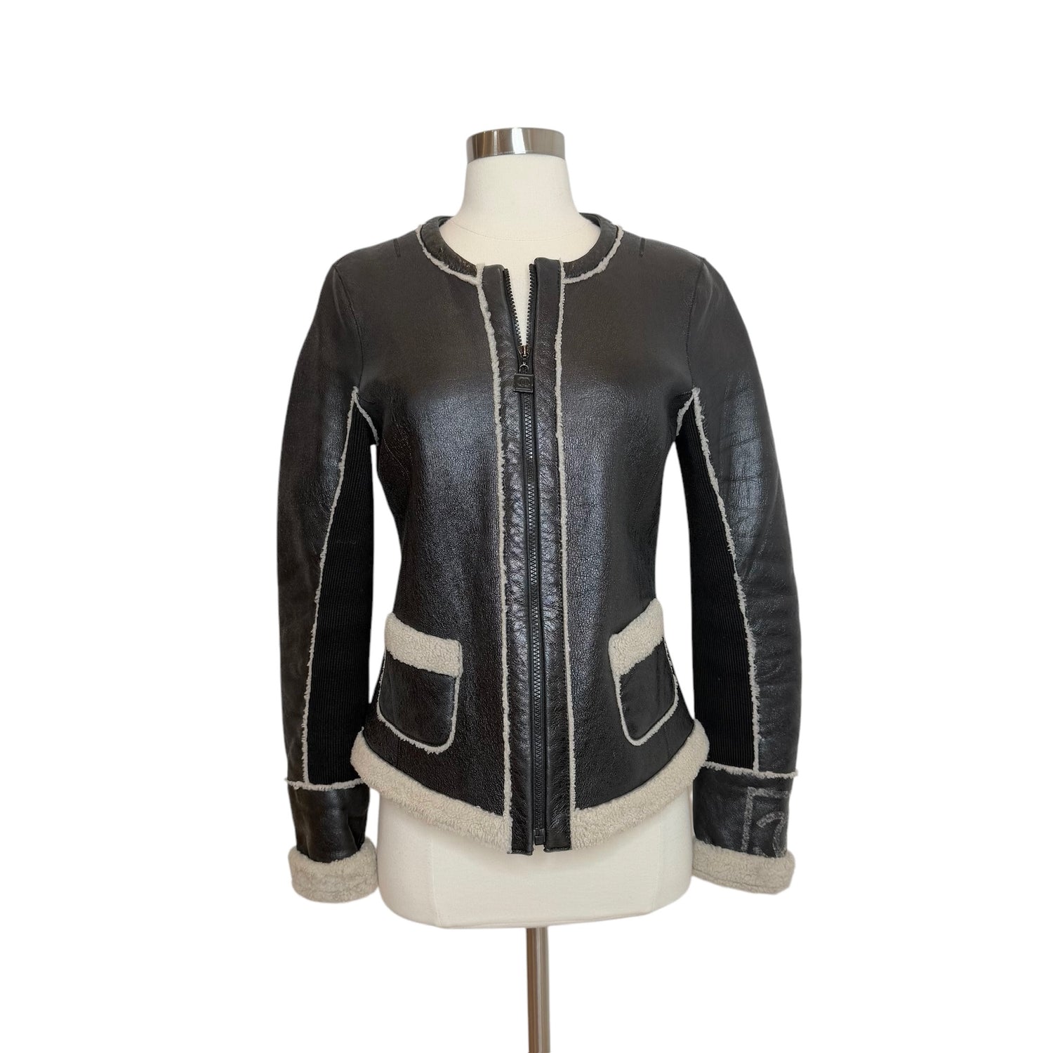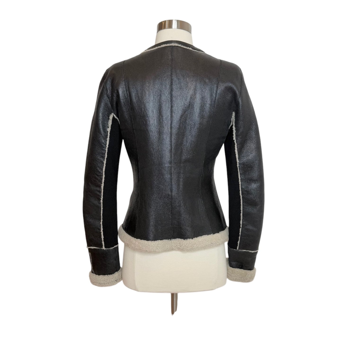 Chanel Identification leather jacket with shearling lining. Black lambskin leather. Logo at right wrist. Collarless. Zipper closure at front. Designer size 40.
