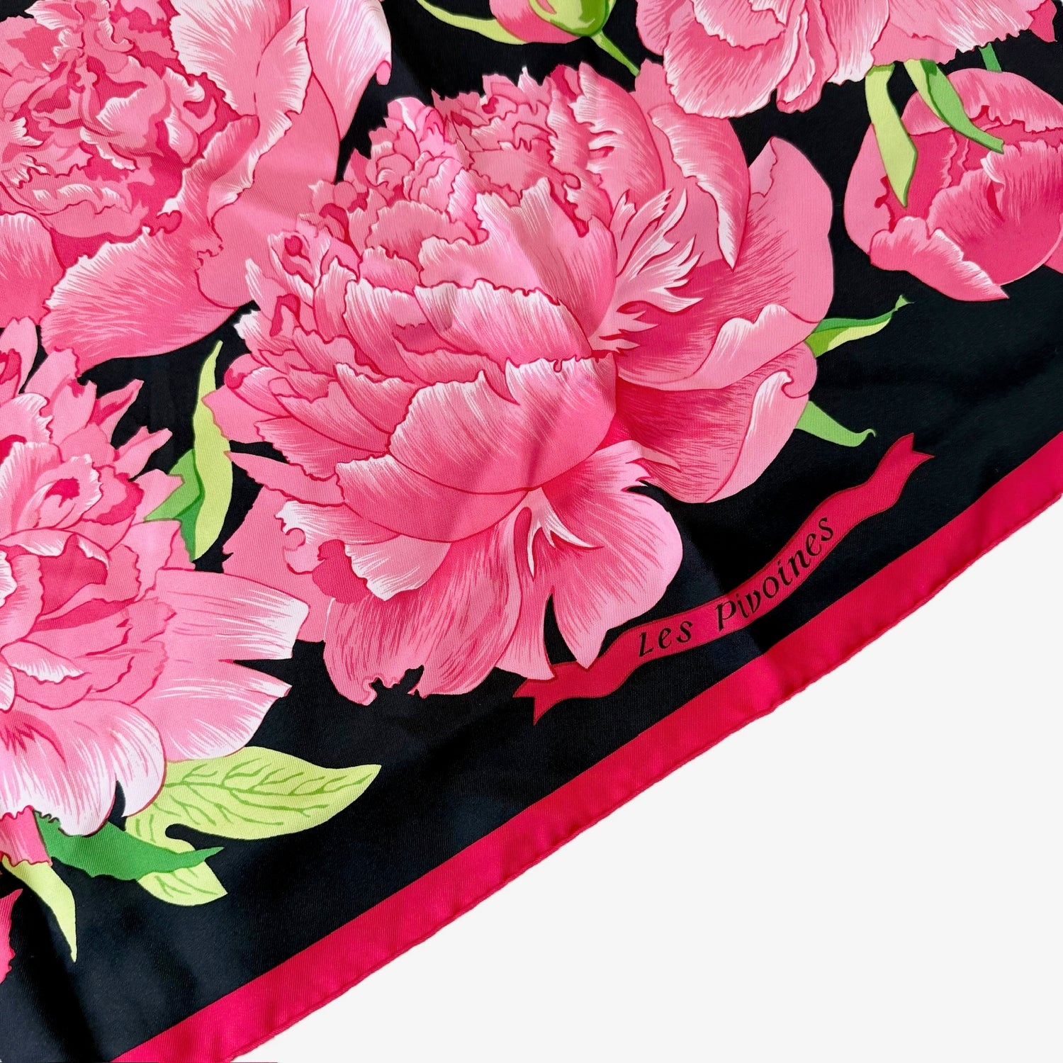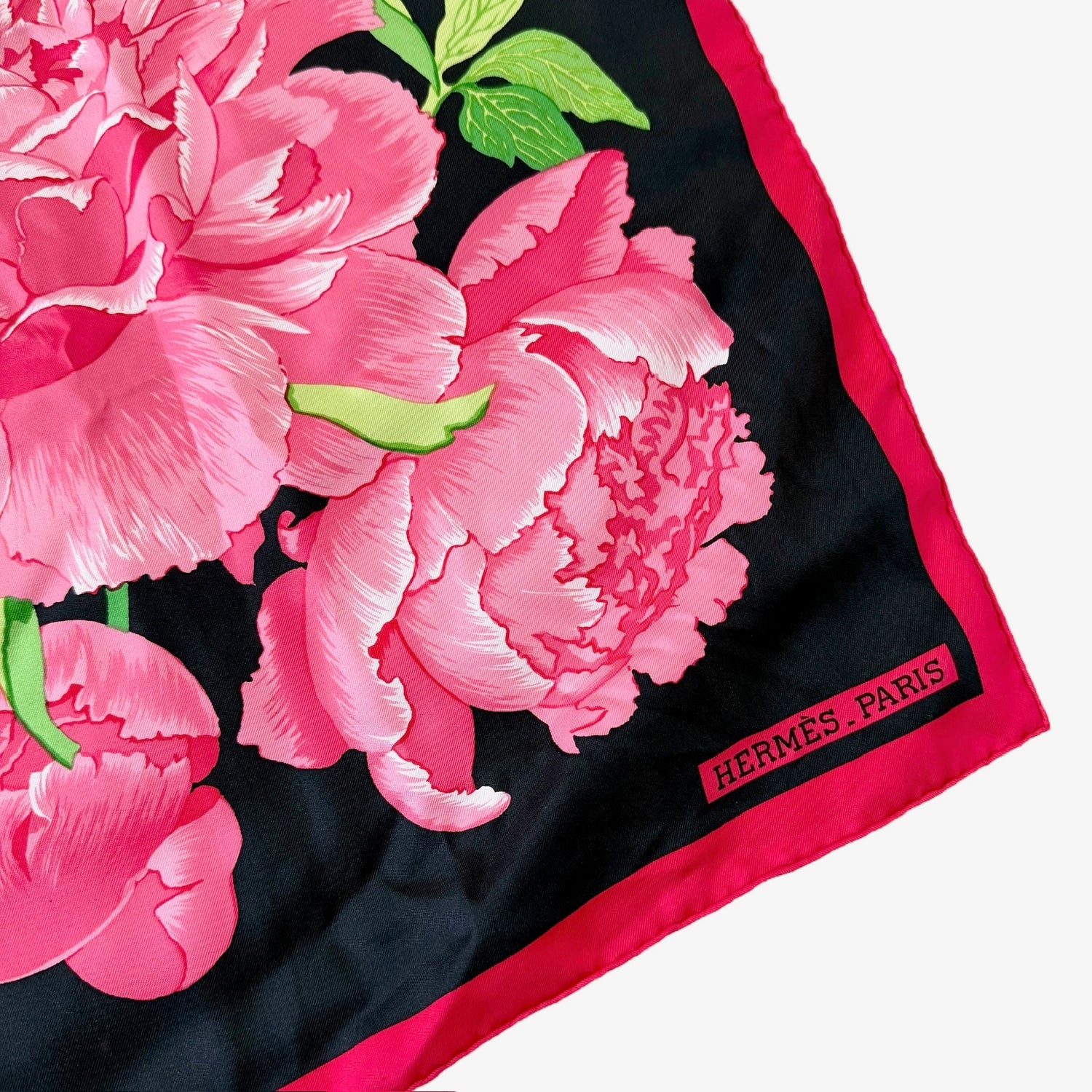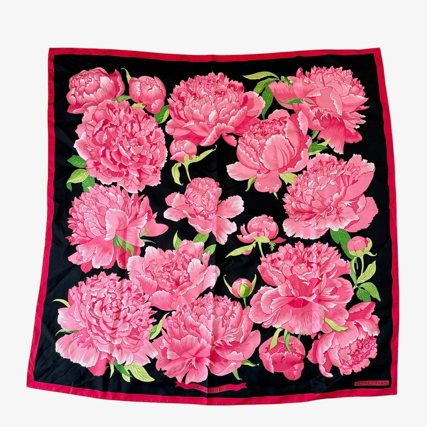 Hermes pink and black silk scarf. Peonies printed large silk square.