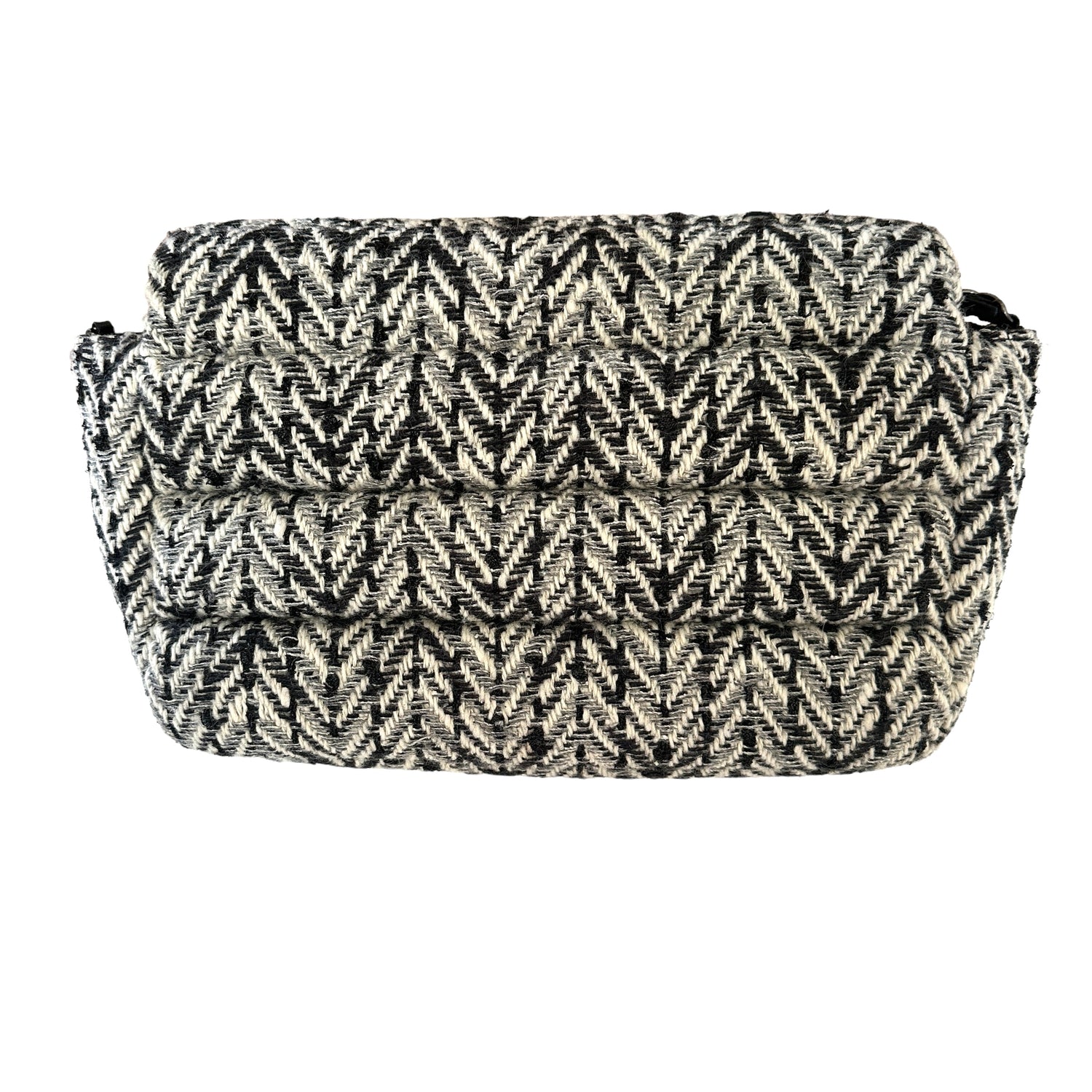 Chanel Tweed Bag. Single flap. Black, grey and white tweed. Brushed silver hardware. Black grosgrain lining. One interior zipper pocket.